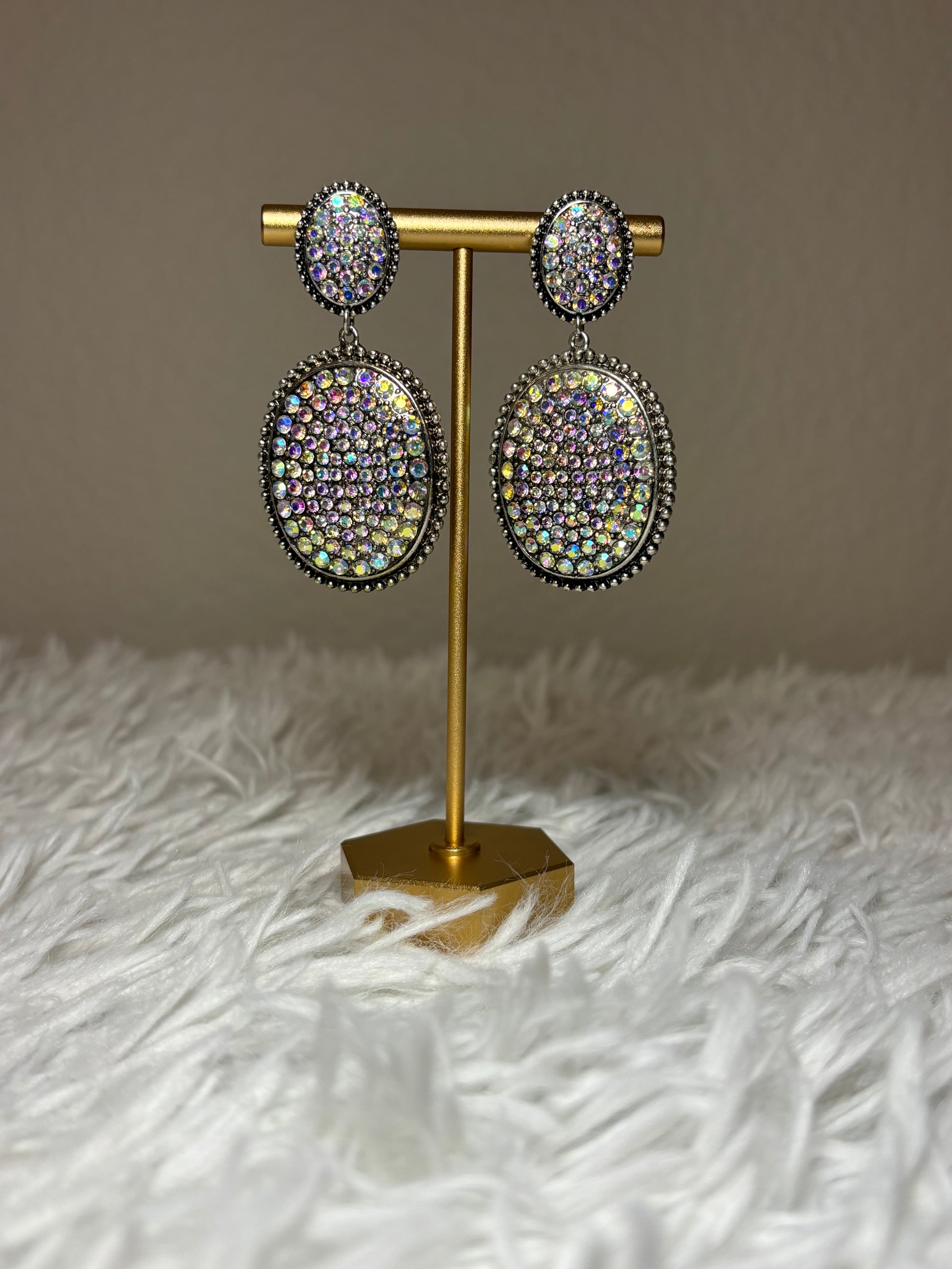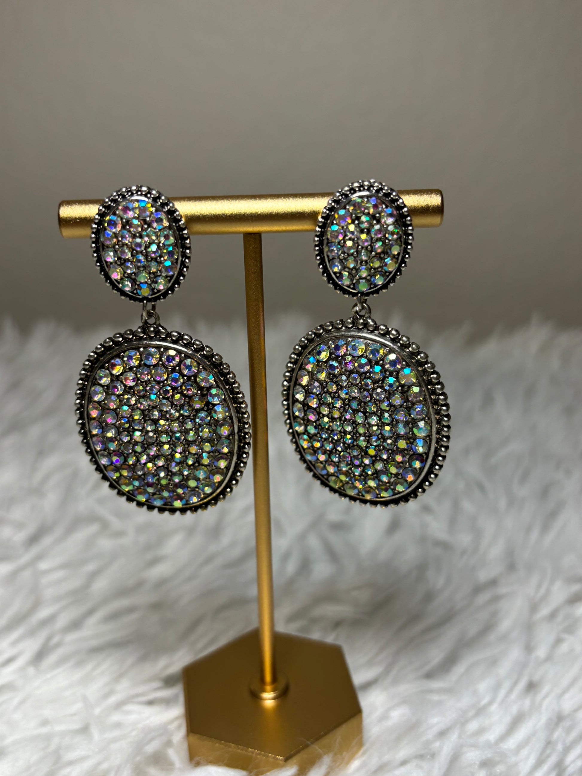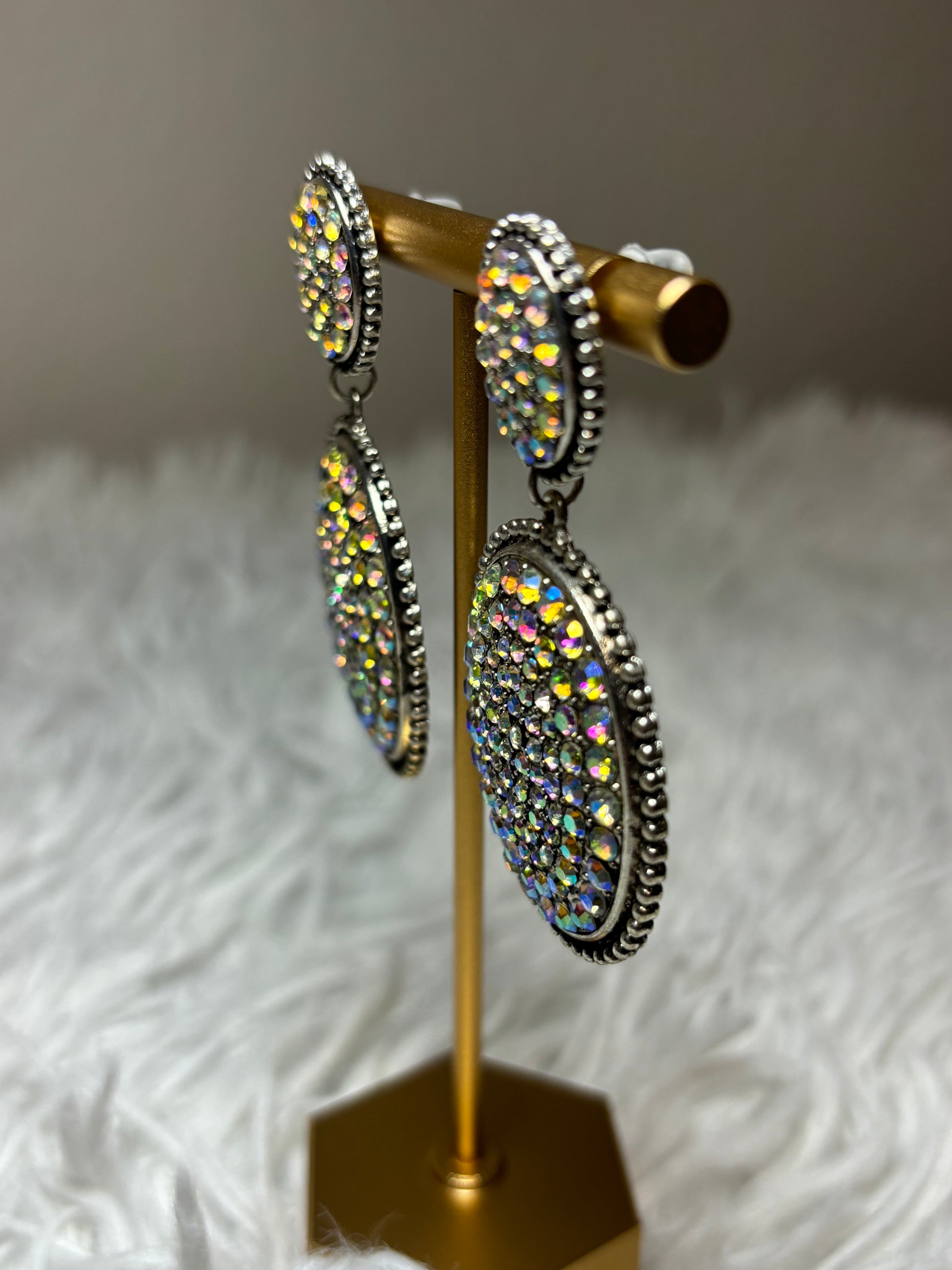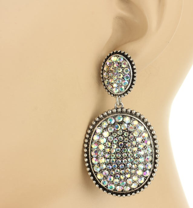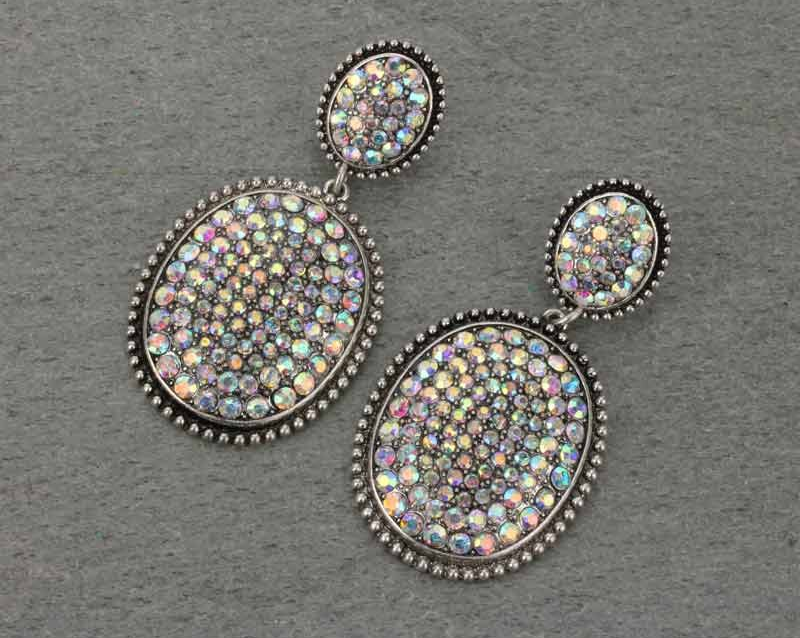 These Stone Post Earrings feature a burnished silver finish paired with AB color rhinestones, adding a refined touch to any ensemble. Measuring 2.5 inches in length and 1.25 inches in width, they offer a balanced statement size without overwhelming. Crafted lead-free, they provide both style and safety for everyday wear.