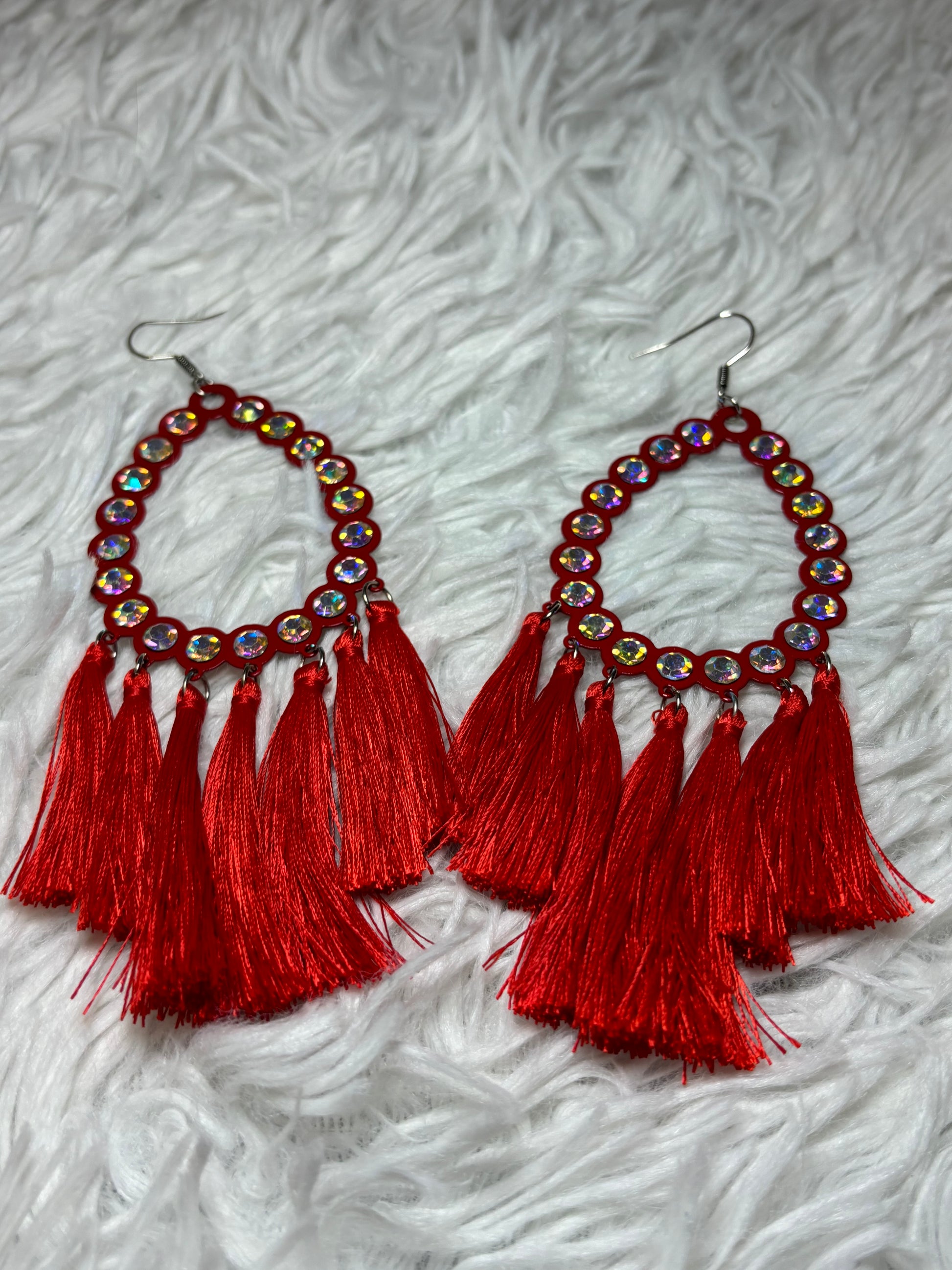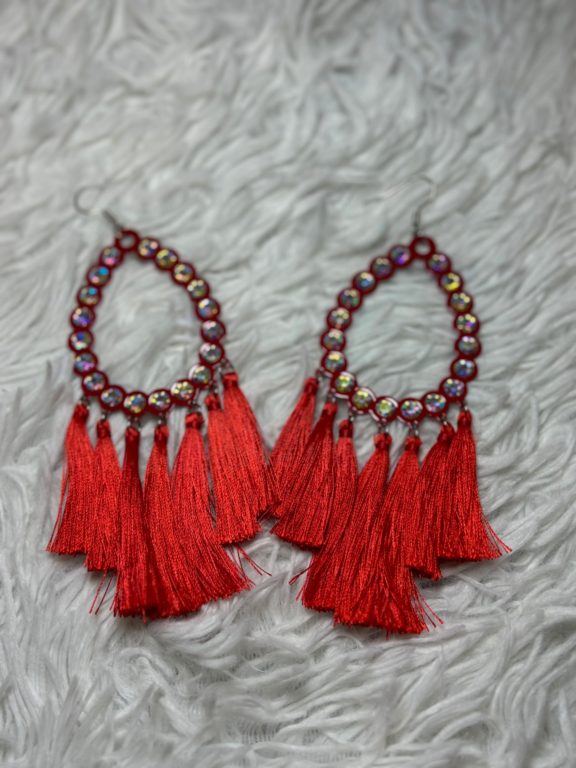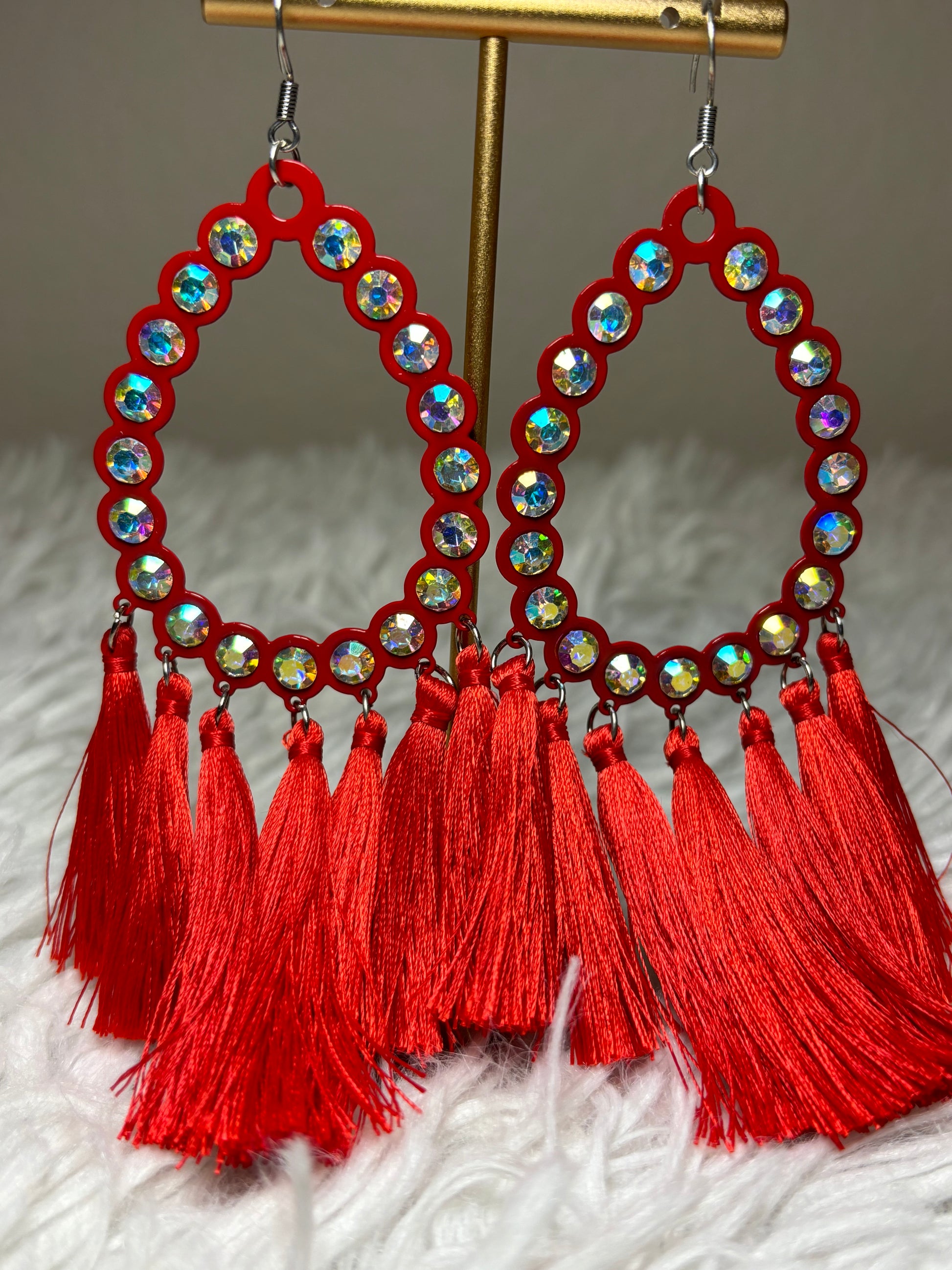These Tear Drop with Tassel Fish Hook Earrings feature a burnished red finish accented by AB rhinestones, offering subtle iridescence for added elegance. Measuring 4.5 inches in length and 1.75 inches wide, their lightweight design ensures comfortable wear, making them a refined choice for complementing both casual and formal ensembles.