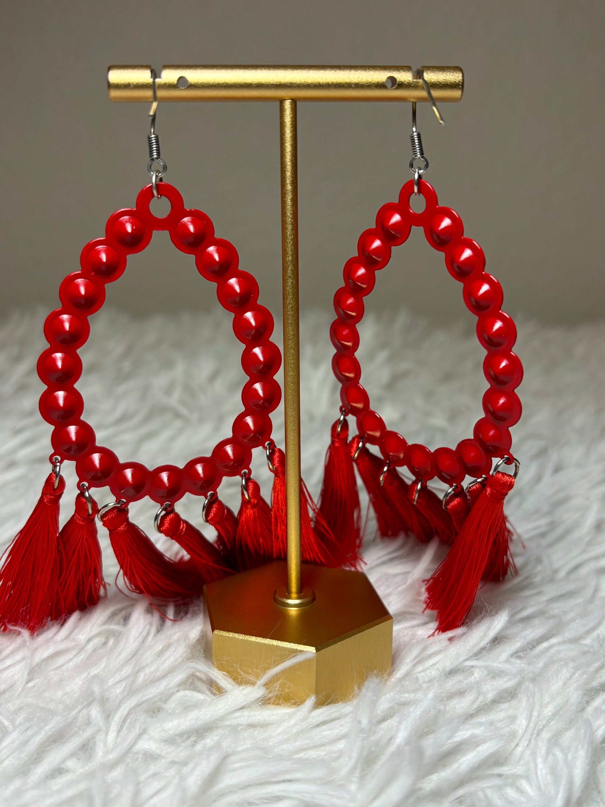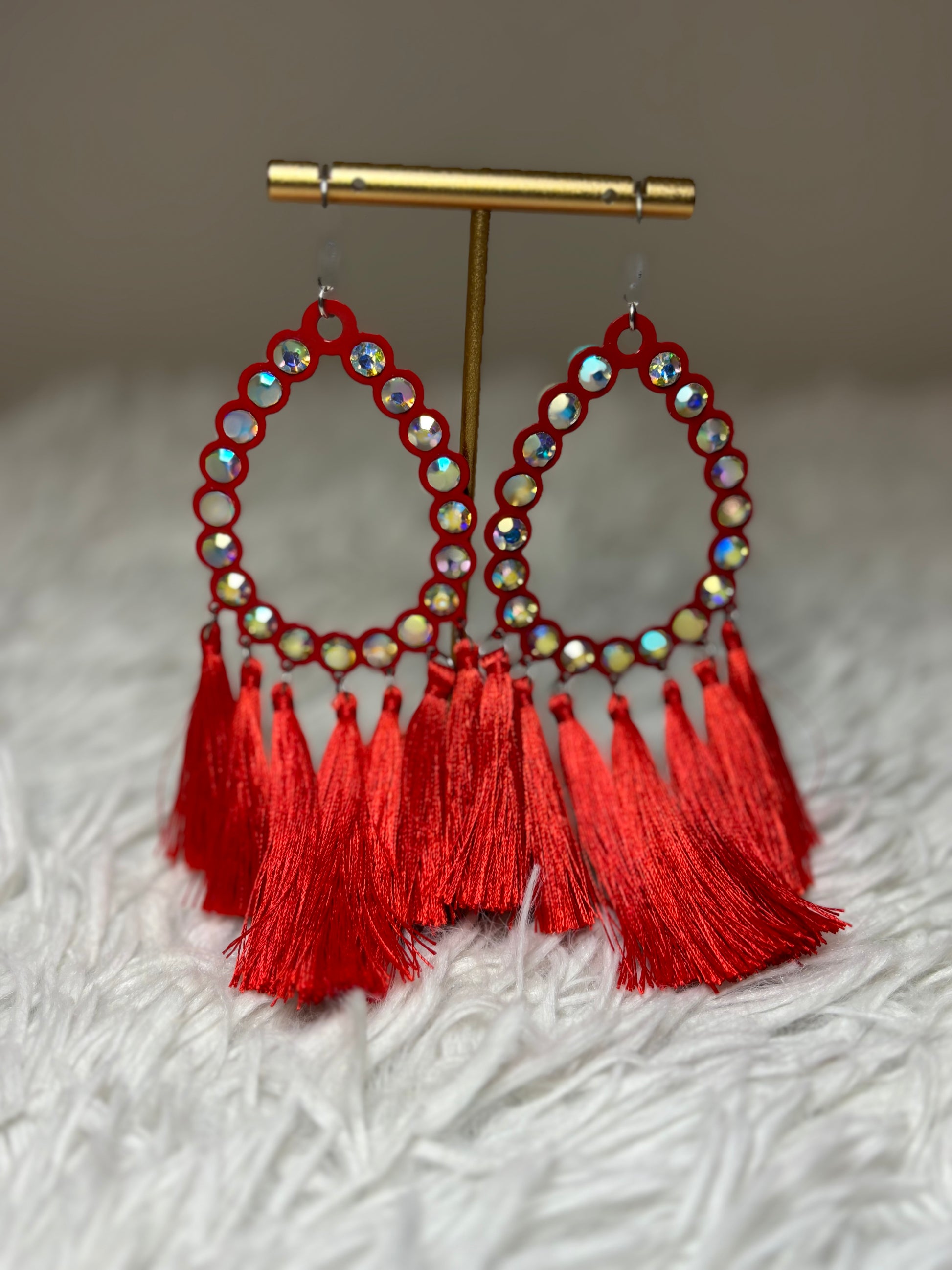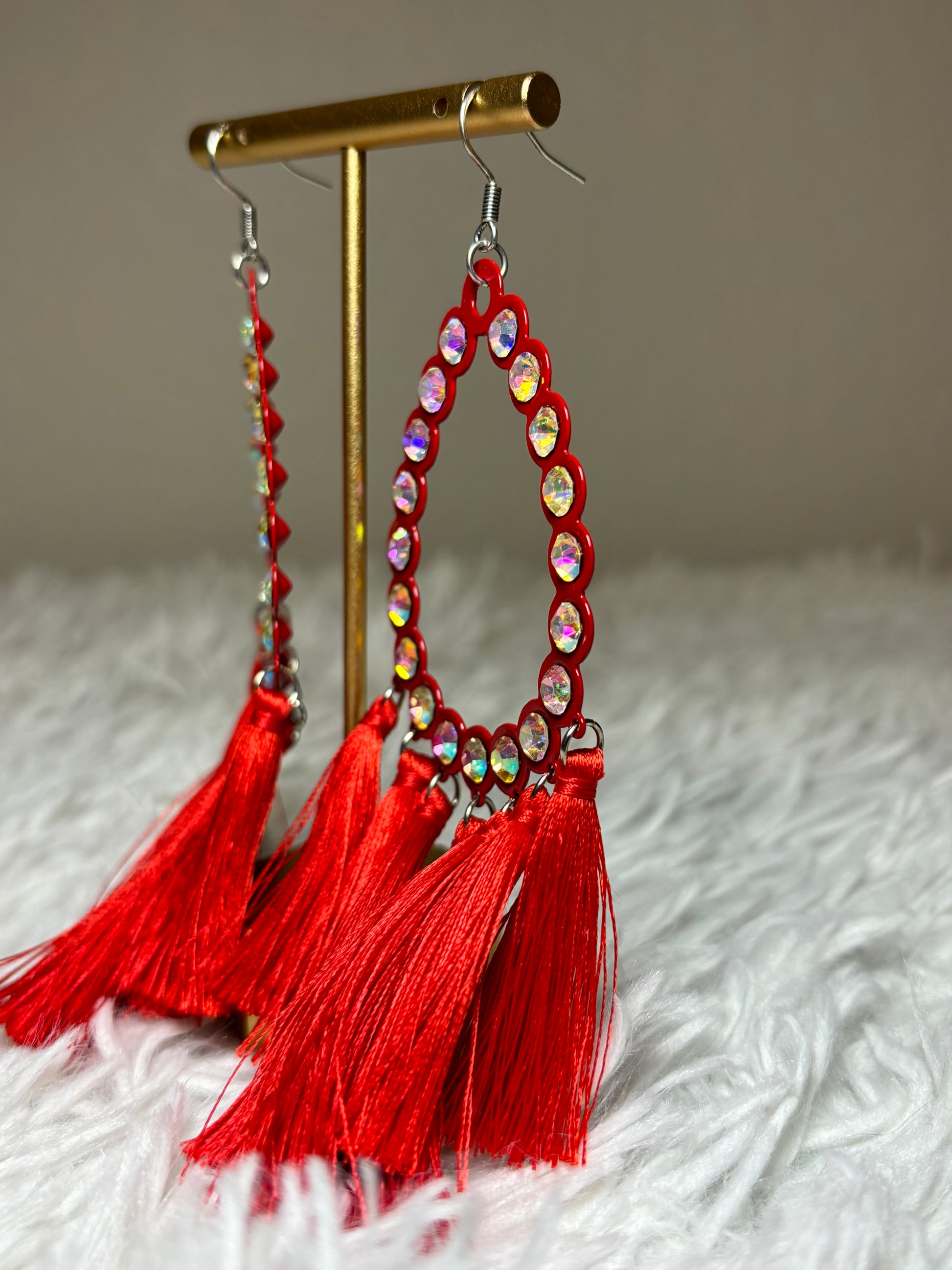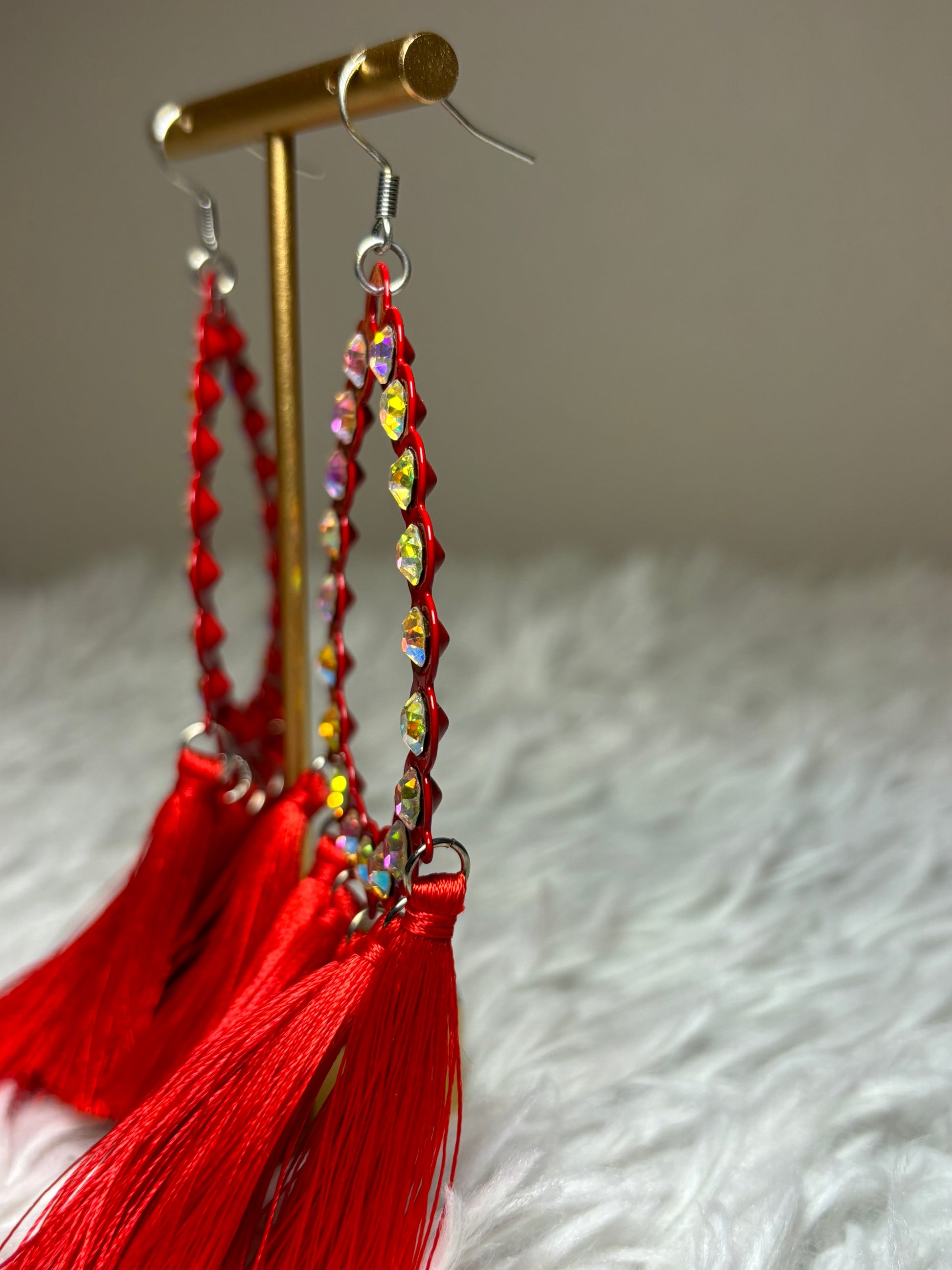 These Tear Drop with Tassel Fish Hook Earrings feature a burnished red finish accented by AB rhinestones, offering subtle iridescence for added elegance. Measuring 4.5 inches in length and 1.75 inches wide, their lightweight design ensures comfortable wear, making them a refined choice for complementing both casual and formal ensembles.