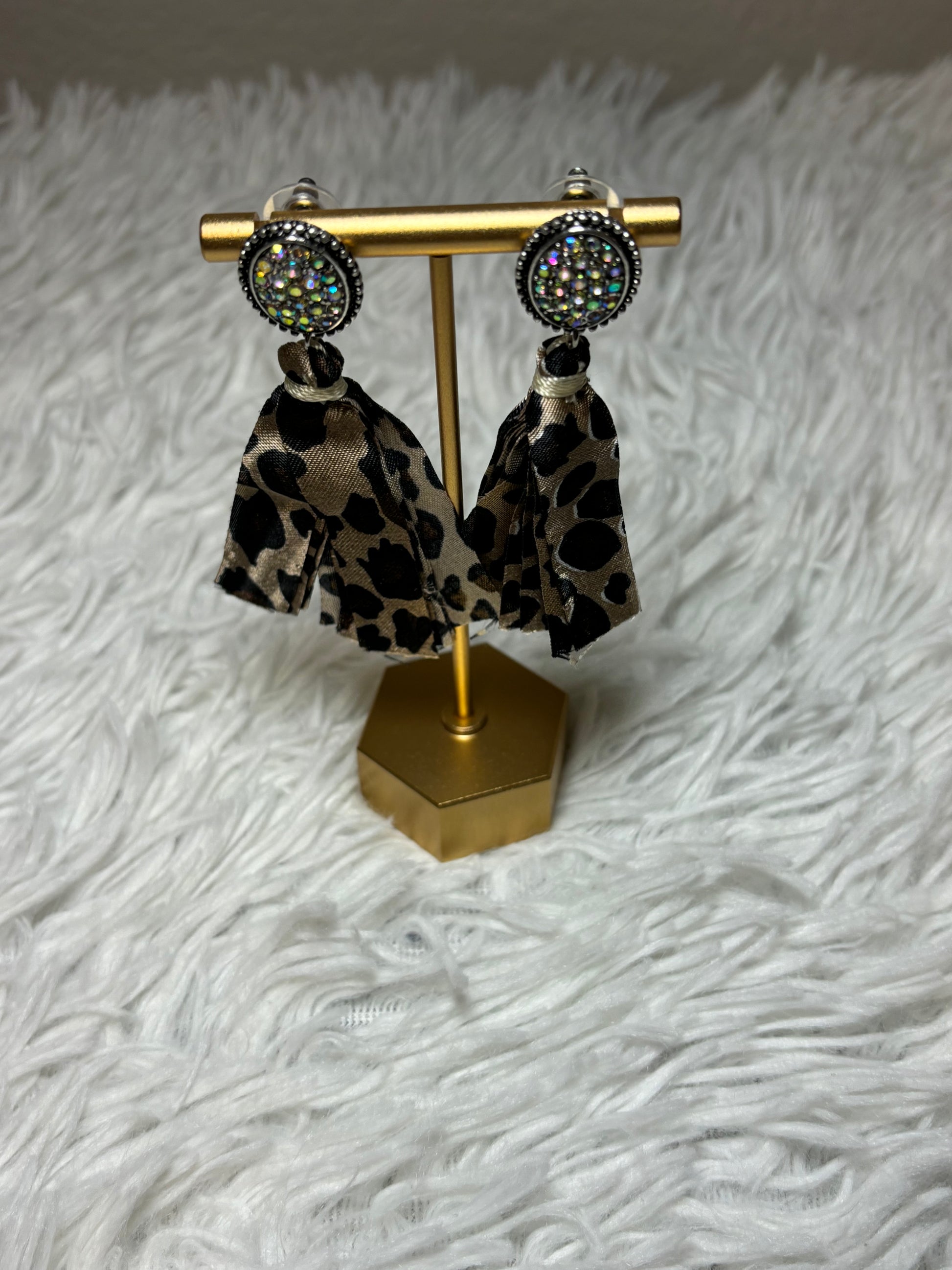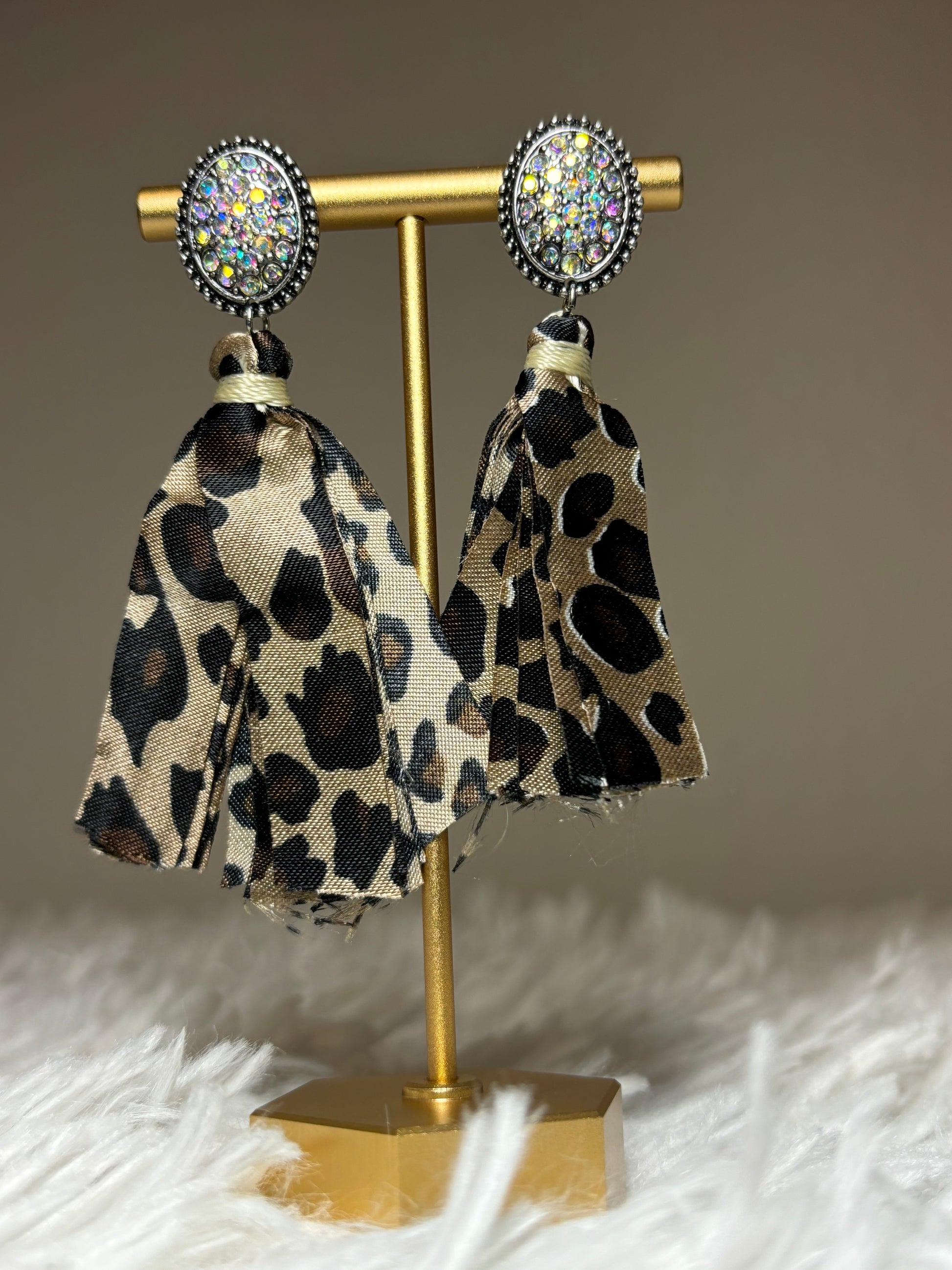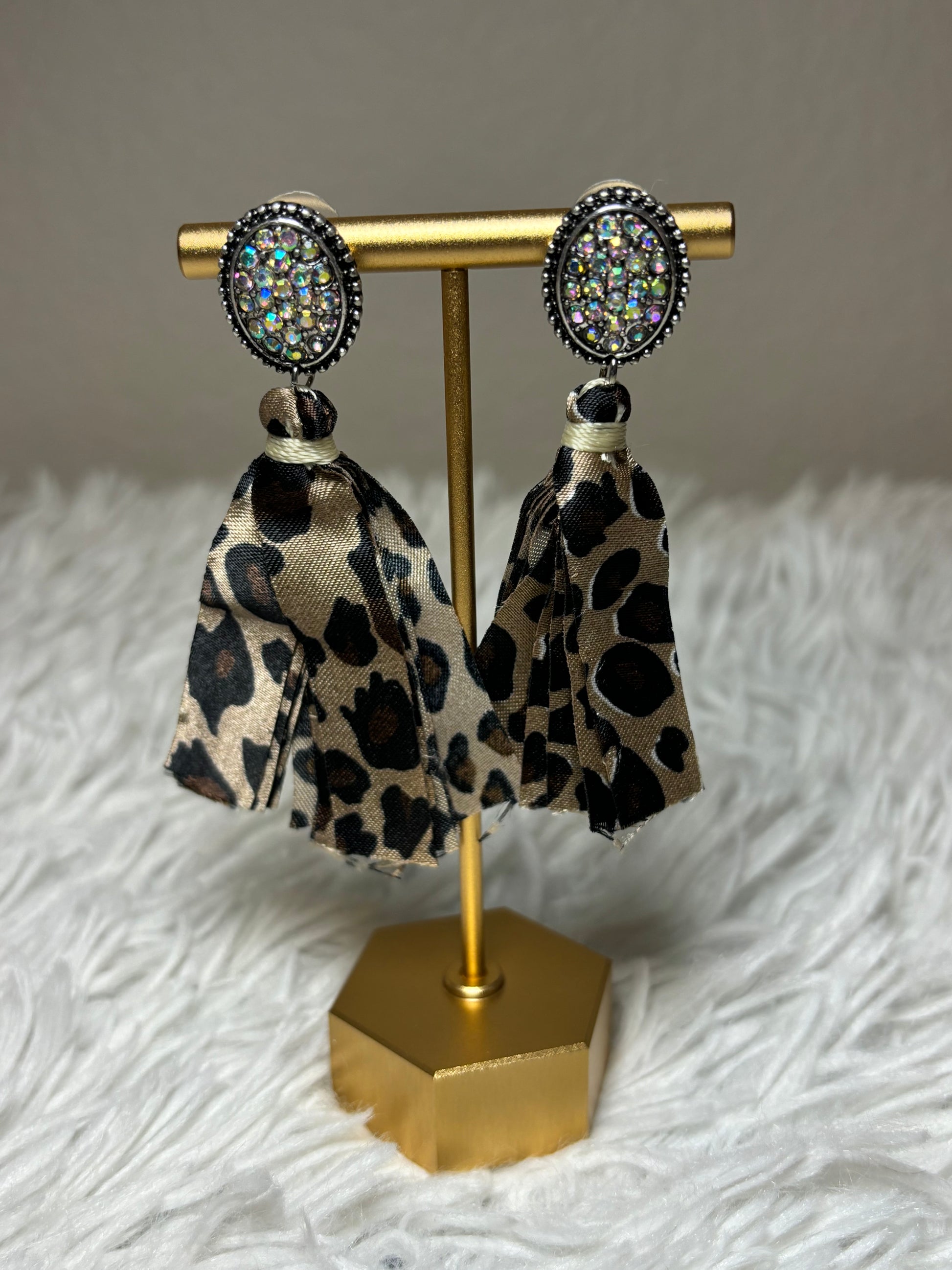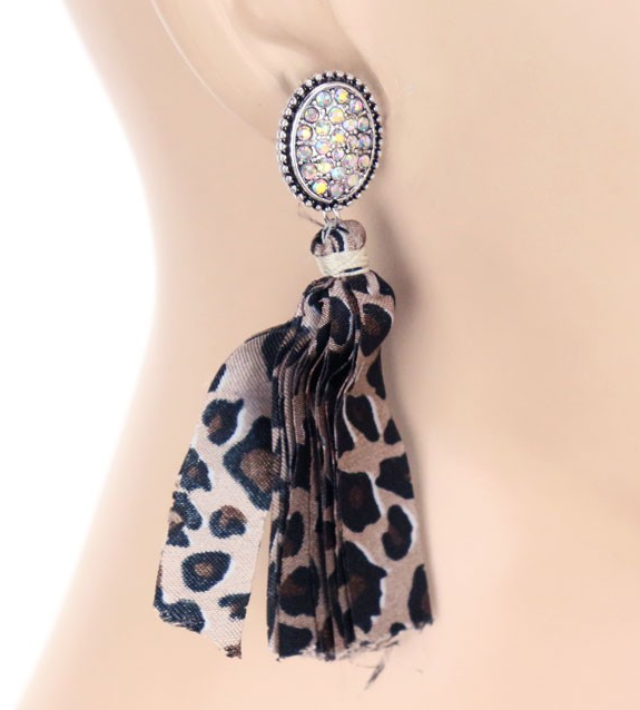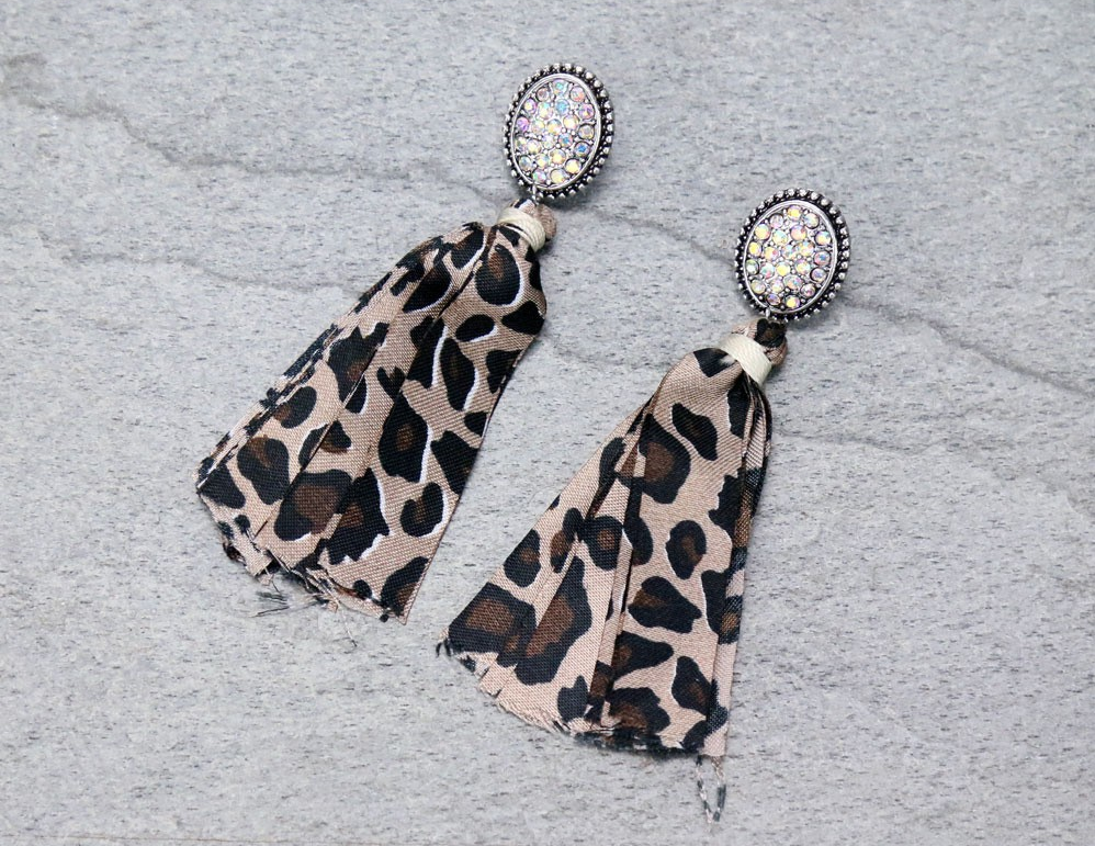 Elevate your accessory collection with these stone post earrings featuring elegant fabric tassels. Crafted in burnished silver with a striking leopard-toned finish, each earring is accented by an iridescent AB stone that catches the light beautifully. Measuring approximately 3 inches long, they offer a bold yet refined look suitable for various occasions. Designed with lead-free materials, these earrings combine style and safety for confident, expert wear.