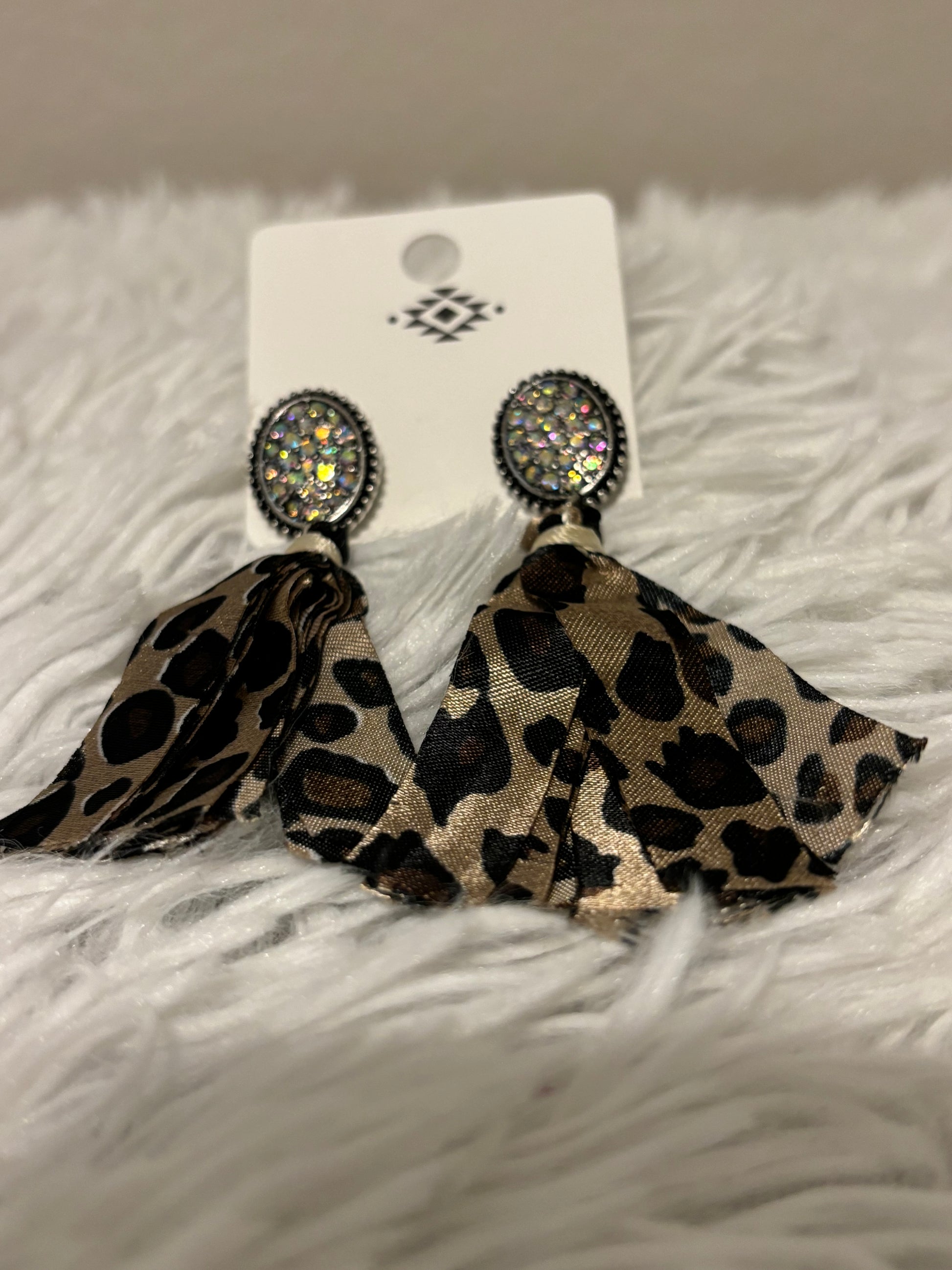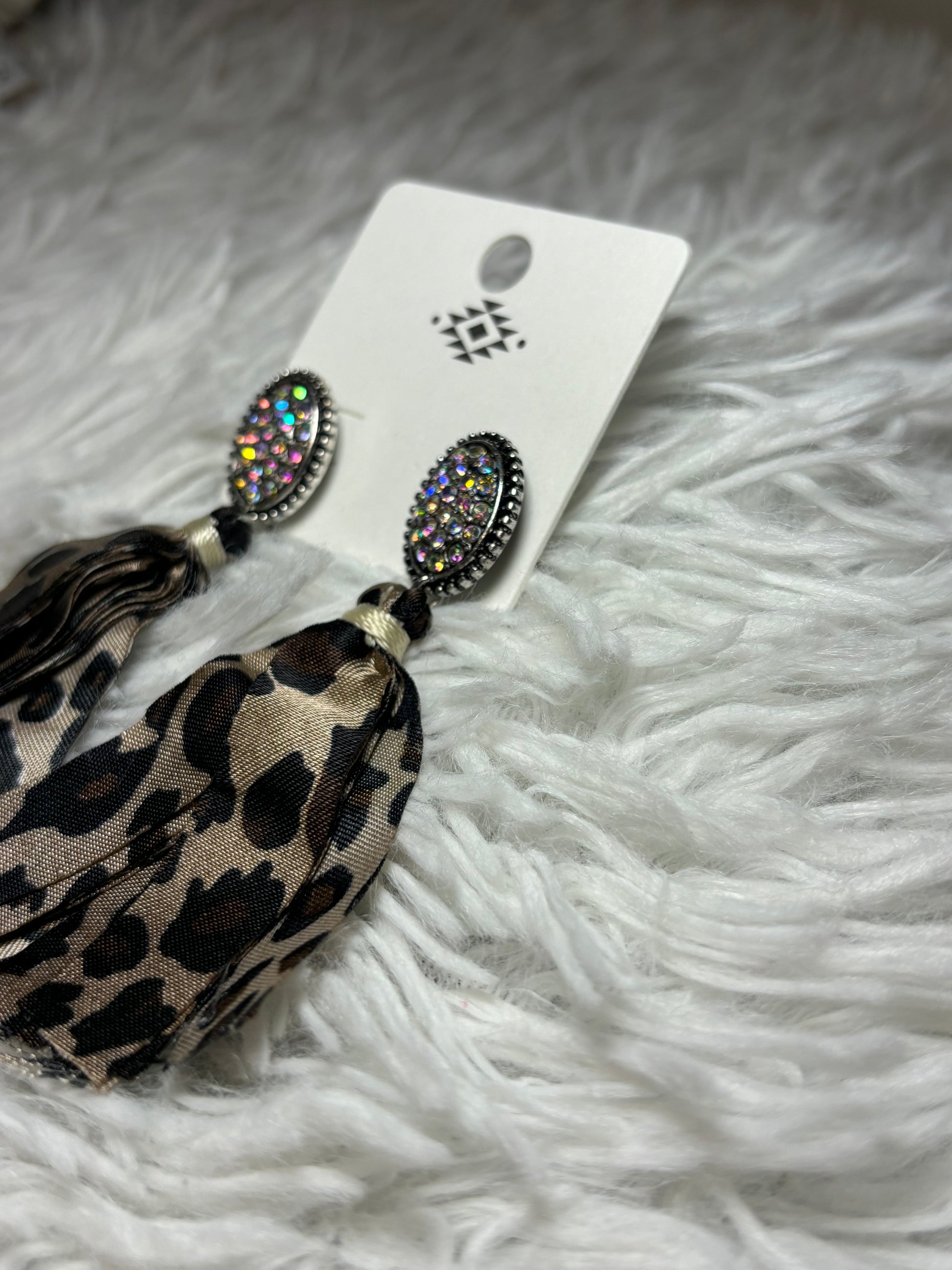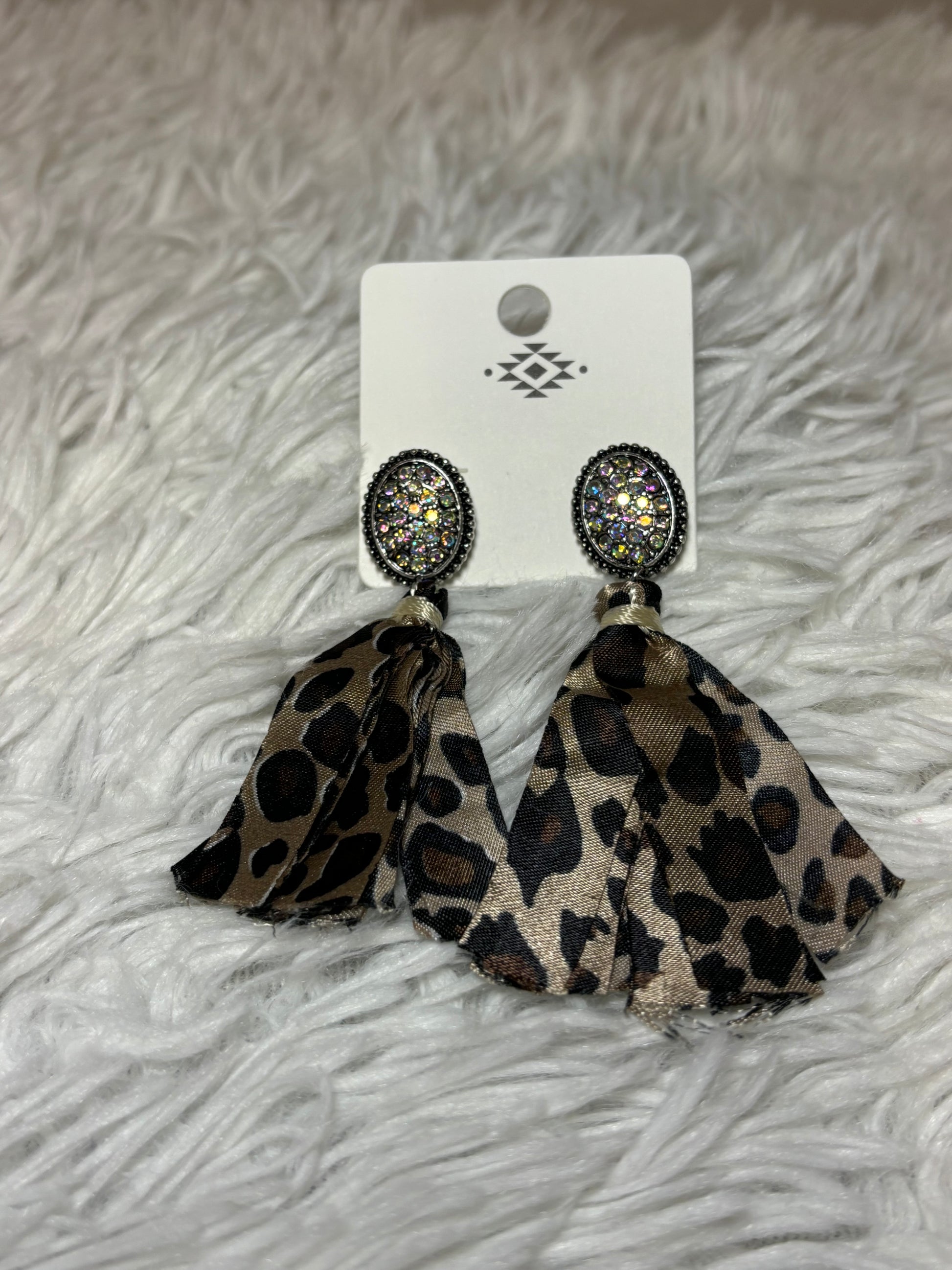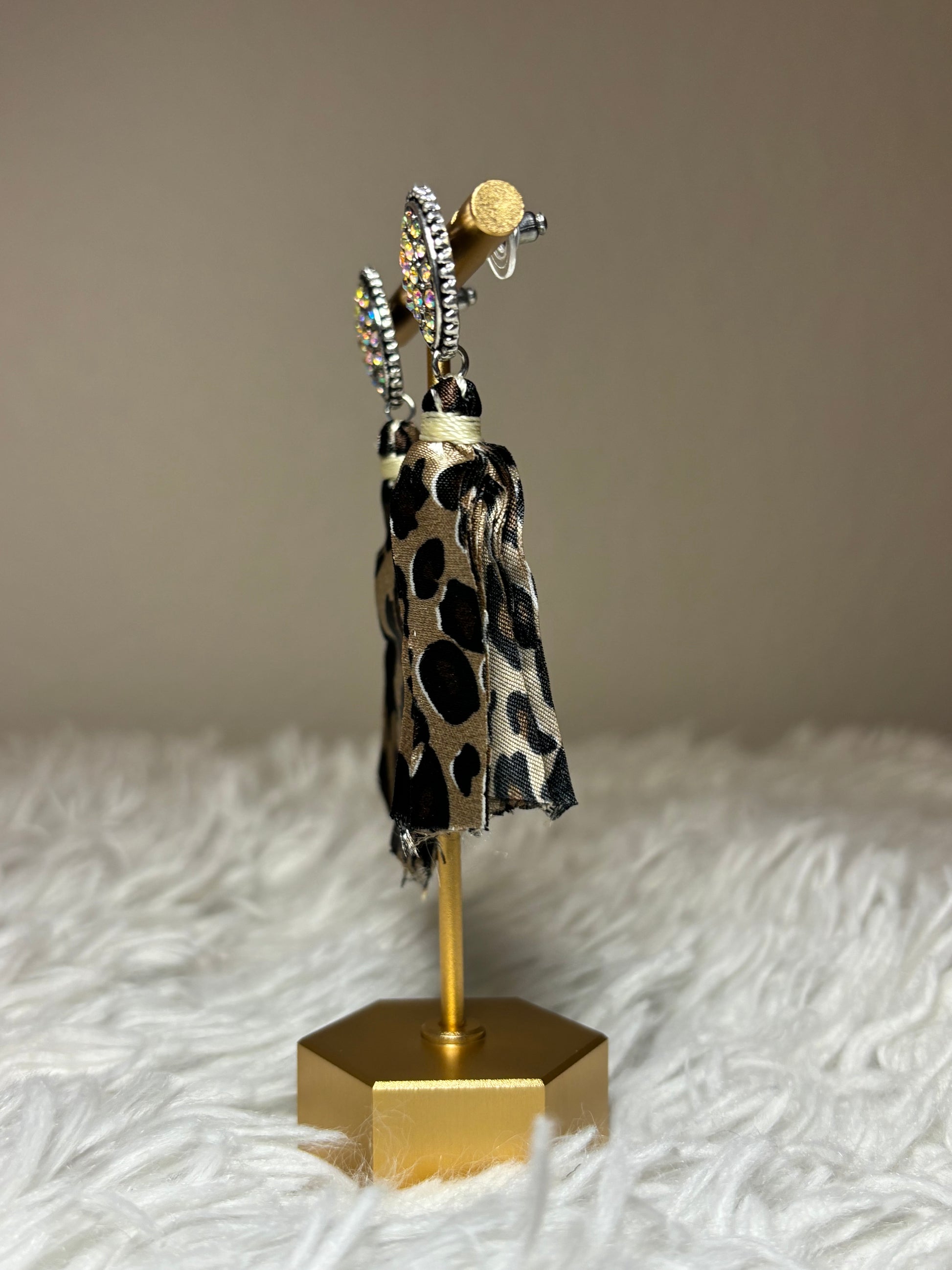 Elevate your accessory collection with these stone post earrings featuring elegant fabric tassels. Crafted in burnished silver with a striking leopard-toned finish, each earring is accented by an iridescent AB stone that catches the light beautifully. Measuring approximately 3 inches long, they offer a bold yet refined look suitable for various occasions. Designed with lead-free materials, these earrings combine style and safety for confident, expert wear.