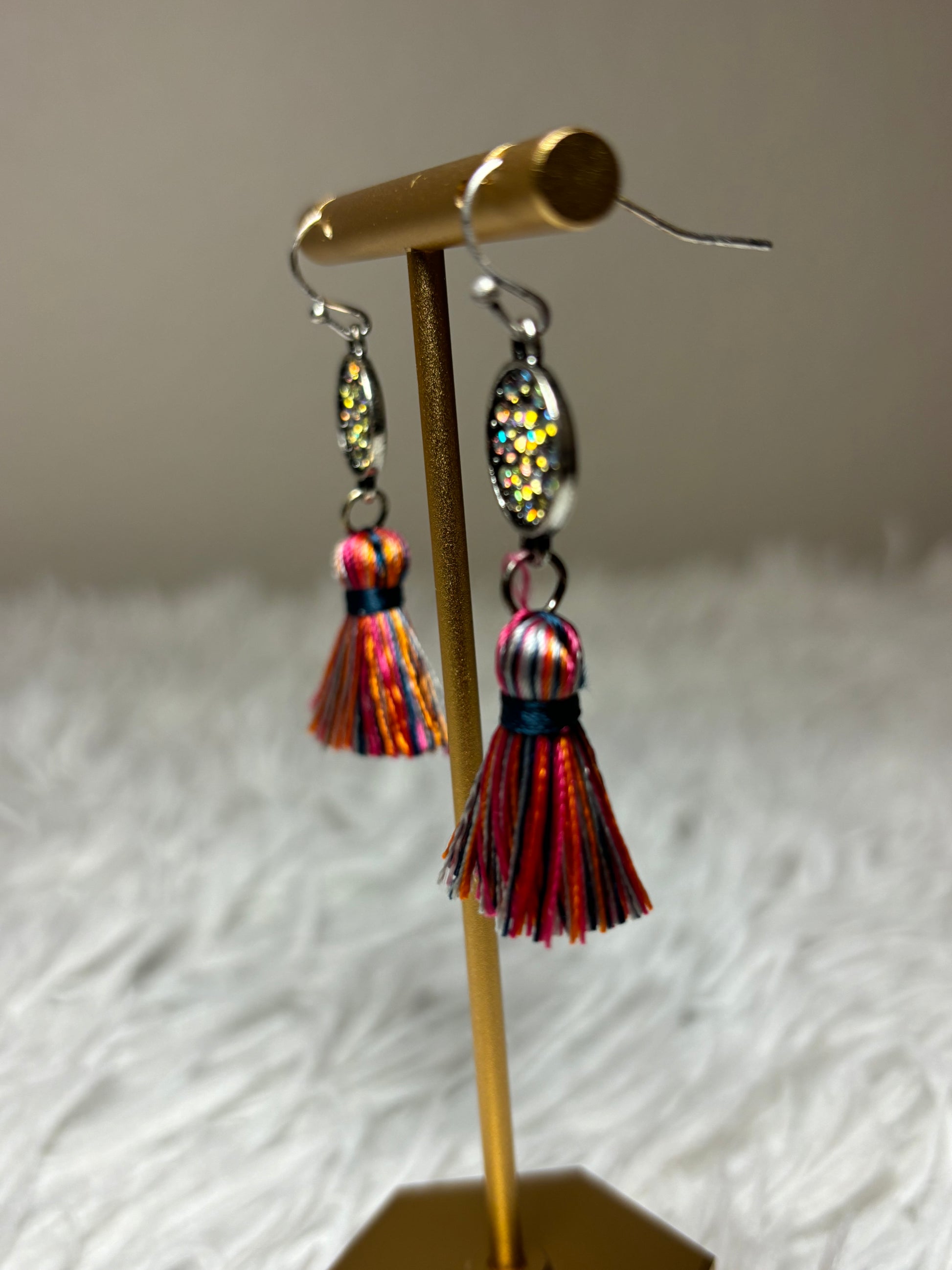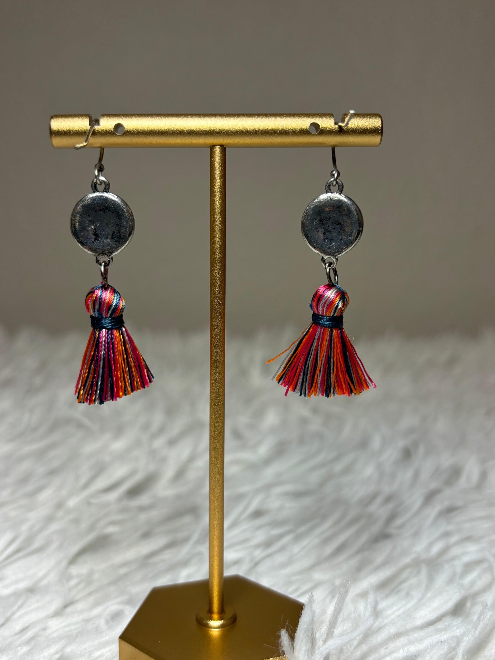 These stone, multi-colored tassel fish hook earrings feature a 1.5-inch length with a burnished silver finish, accented by sparkling AB stones. Designed for both style and safety, they are made lead-free, ensuring comfortable and secure wear. Perfect for adding a refined touch to any outfit.