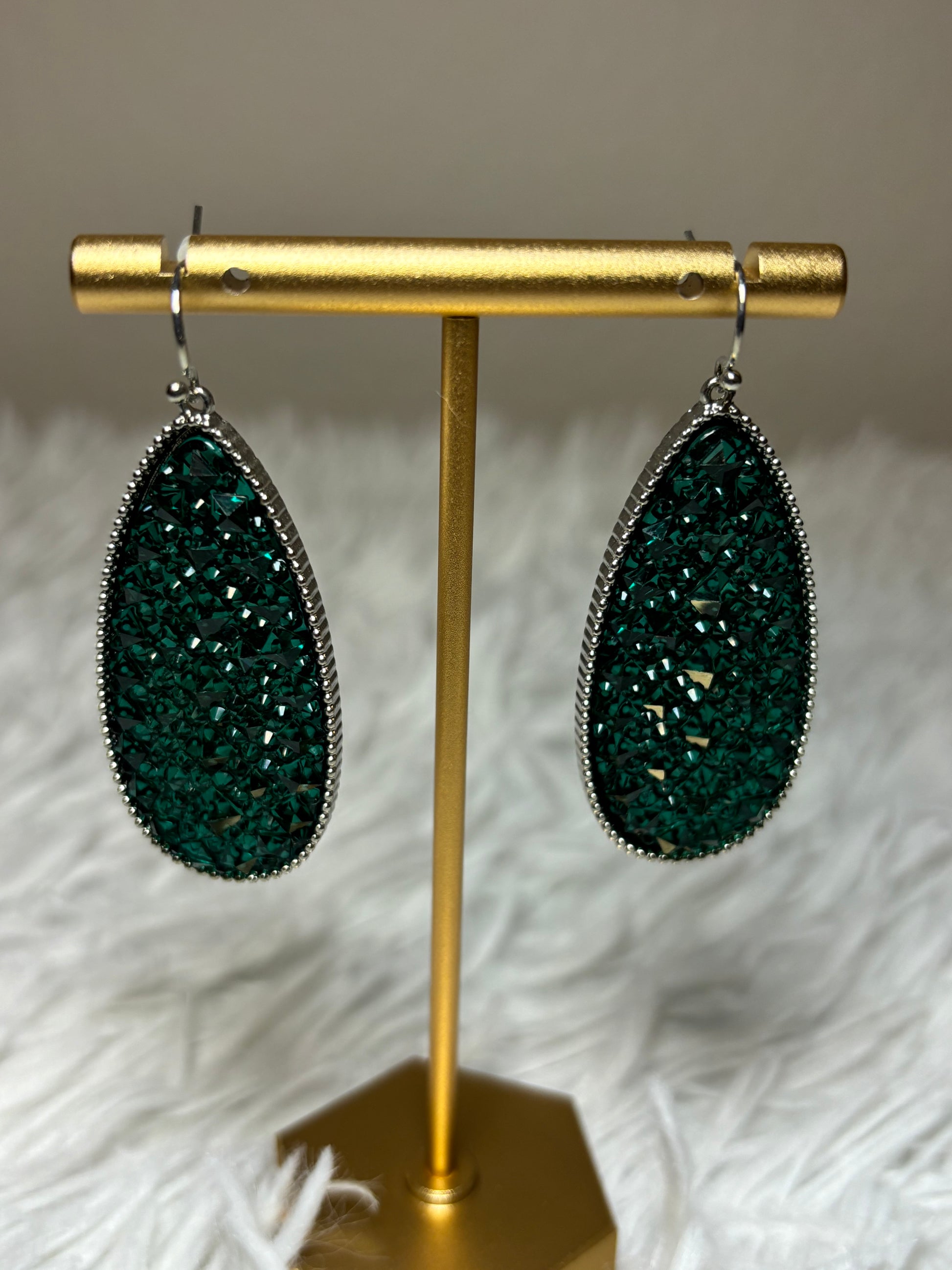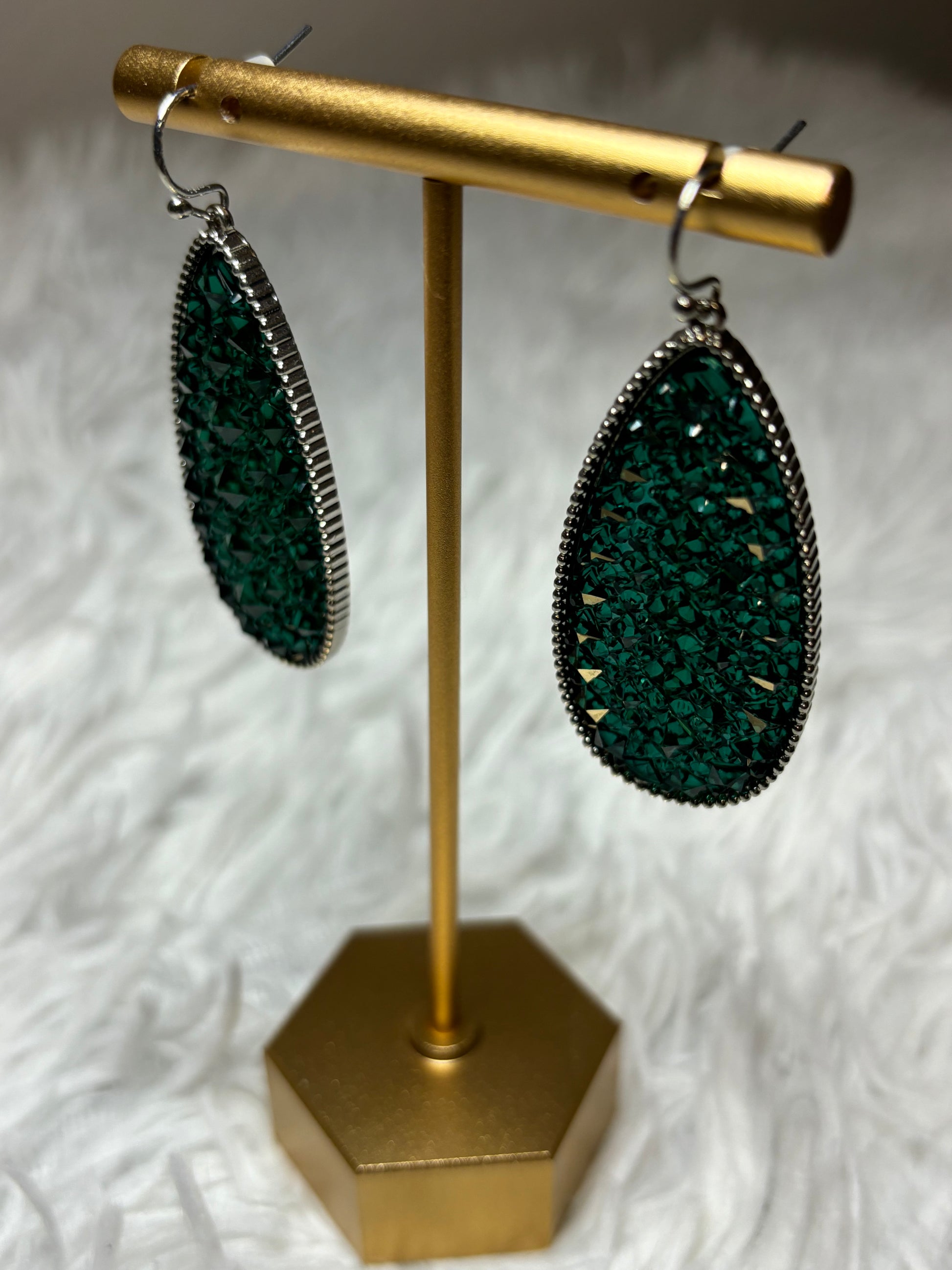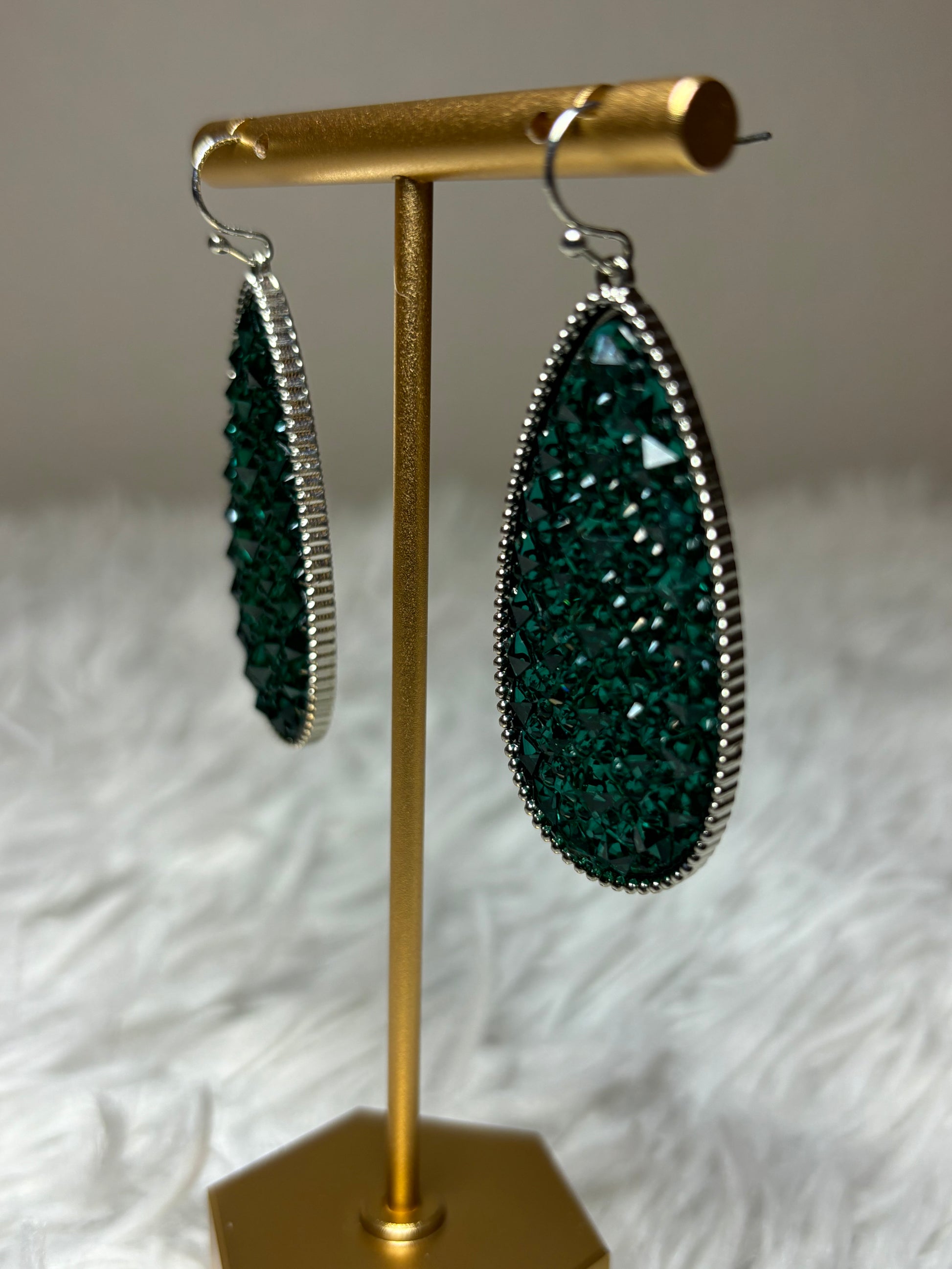 Add a touch of glamour to any outfit with these stunning teardrop earrings. Featuring a silver-toned frame filled with shimmering dark green crystal-like stones, these earrings catch the light beautifully for an eye-catching sparkle. The textured design creates depth and dimension, while the classic teardrop shape adds elegance. These earrings are lightweight and are a little less than 2 inches long.