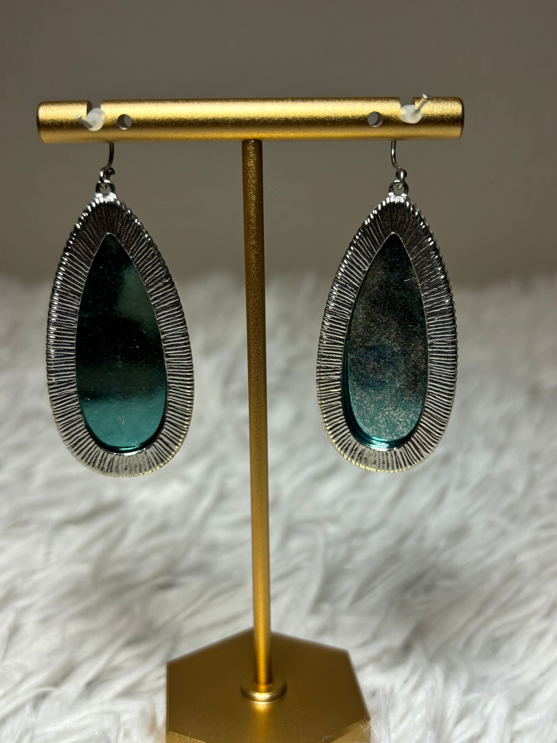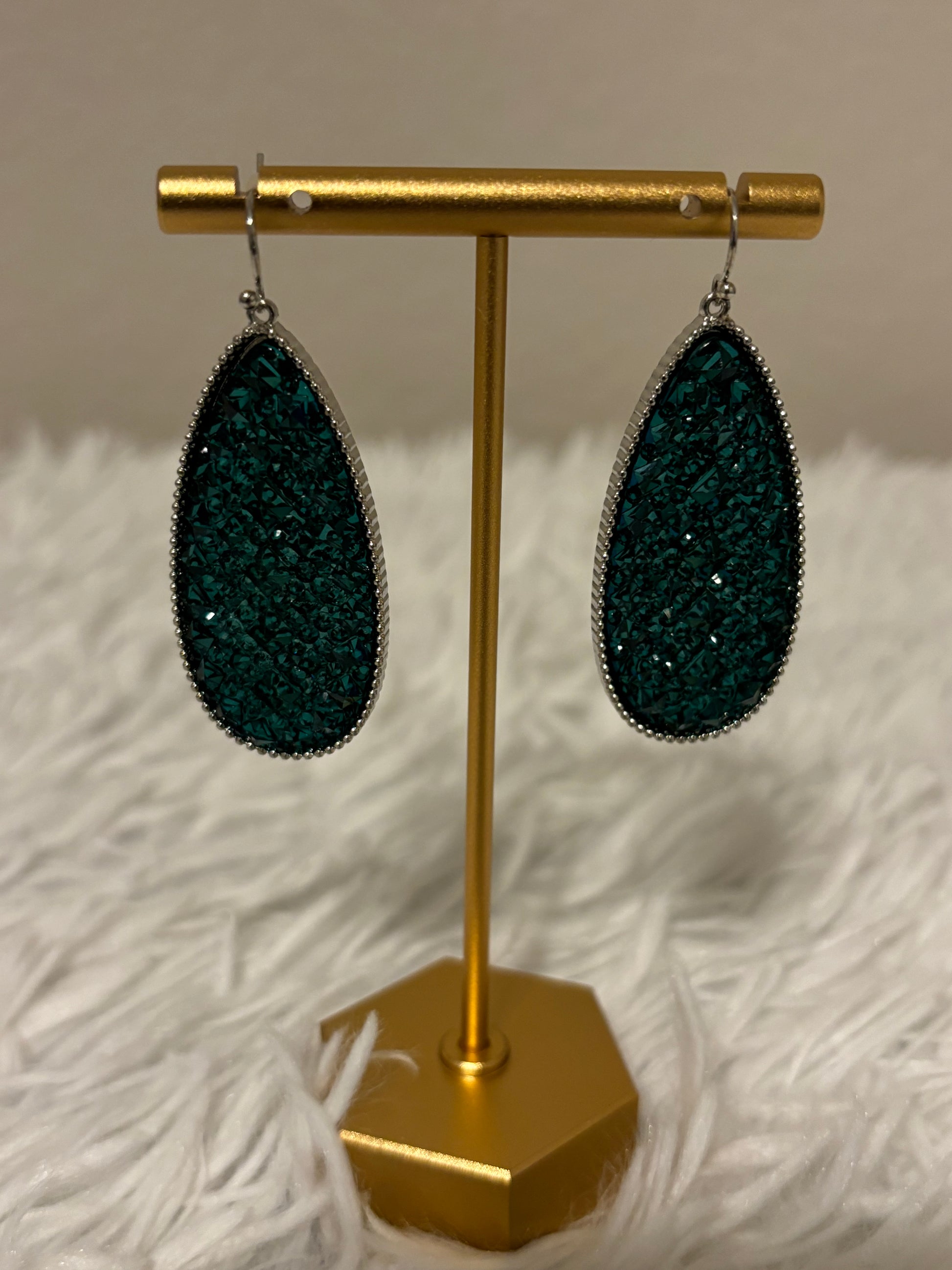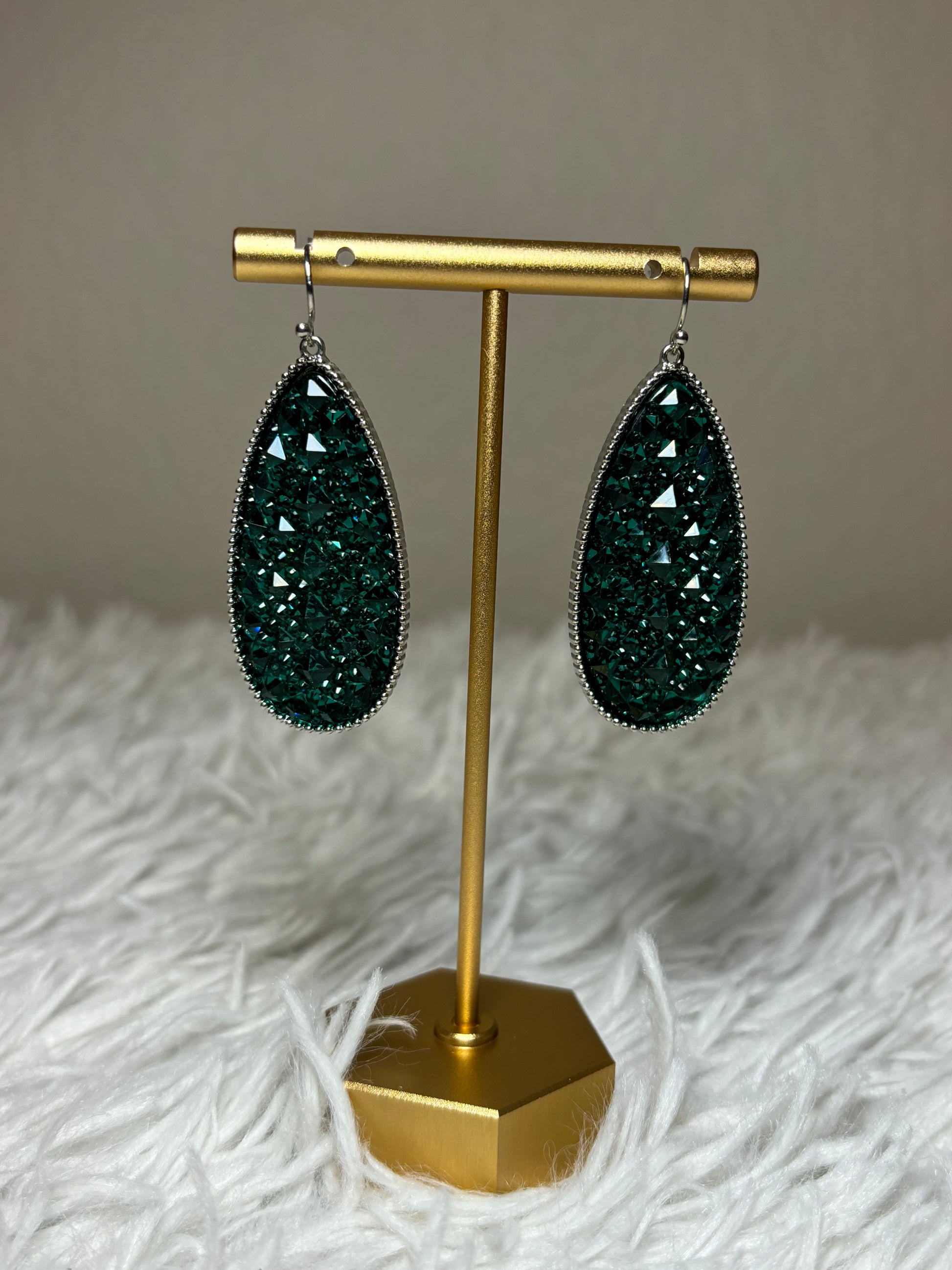 Add a touch of glamour to any outfit with these stunning teardrop earrings. Featuring a silver-toned frame filled with shimmering dark green crystal-like stones, these earrings catch the light beautifully for an eye-catching sparkle. The textured design creates depth and dimension, while the classic teardrop shape adds elegance. These earrings are lightweight and are a little less than 2 inches long.
