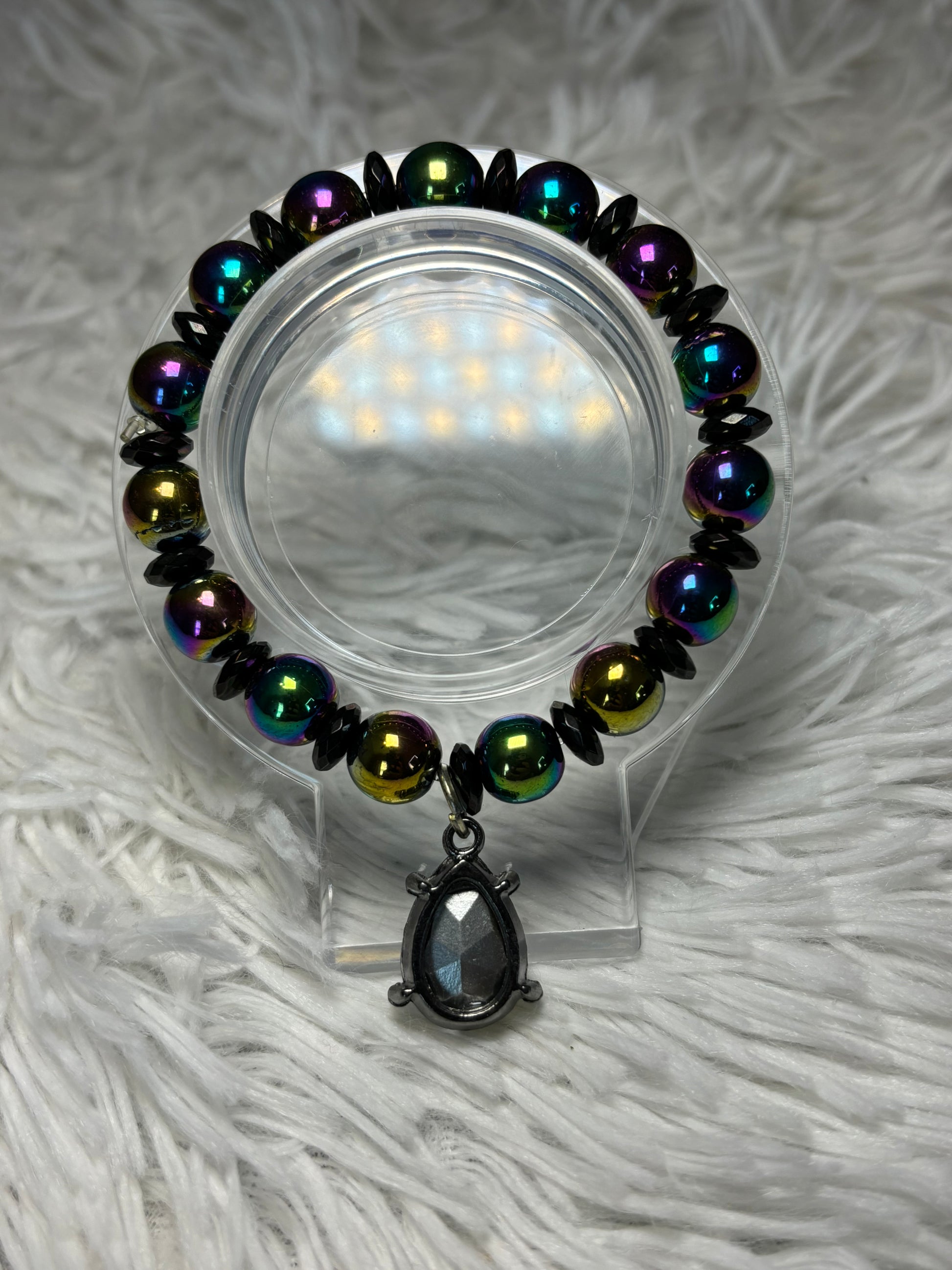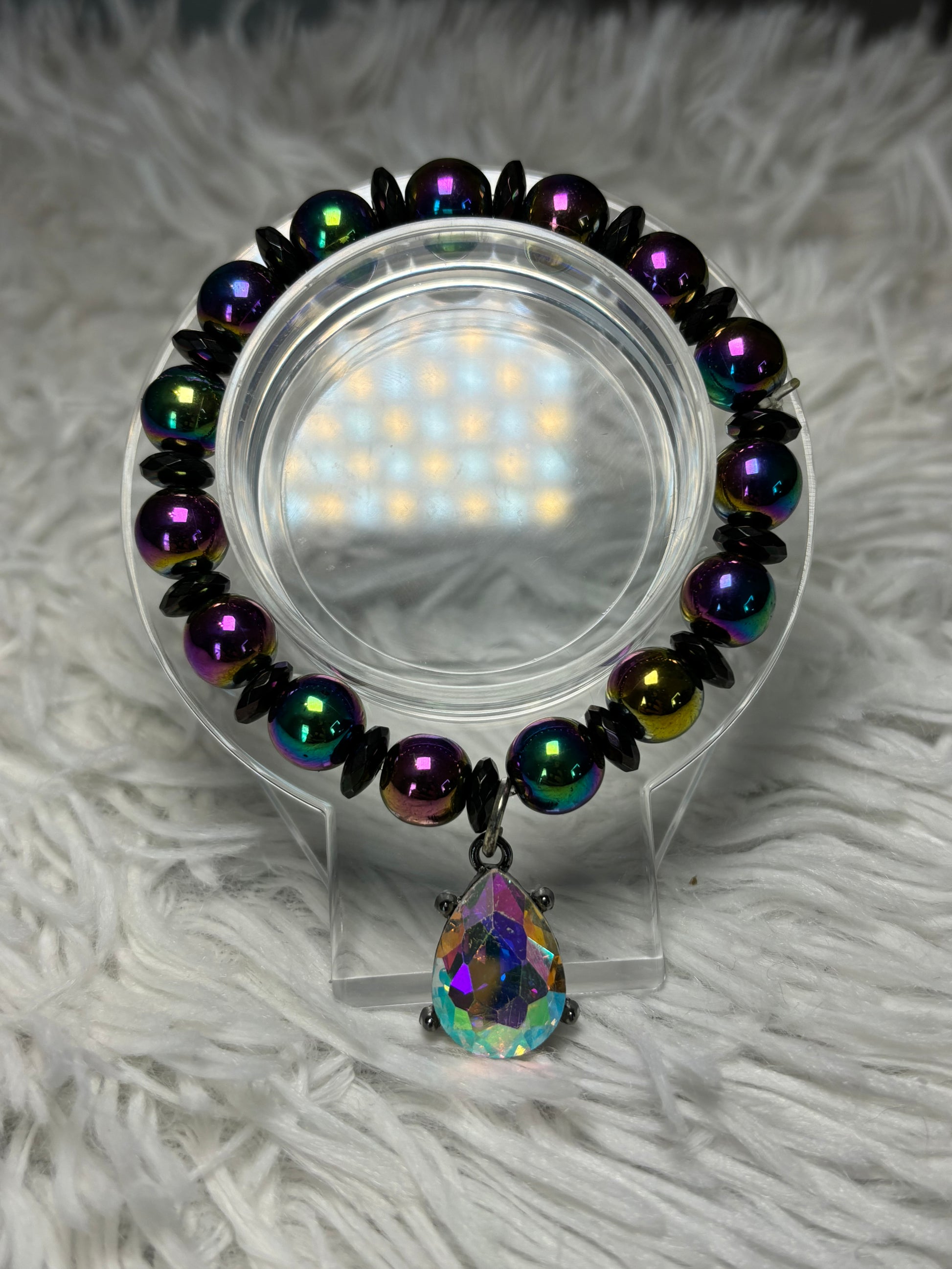 Iridescent Hematite Beaded Bracelet with Teardrop Charm