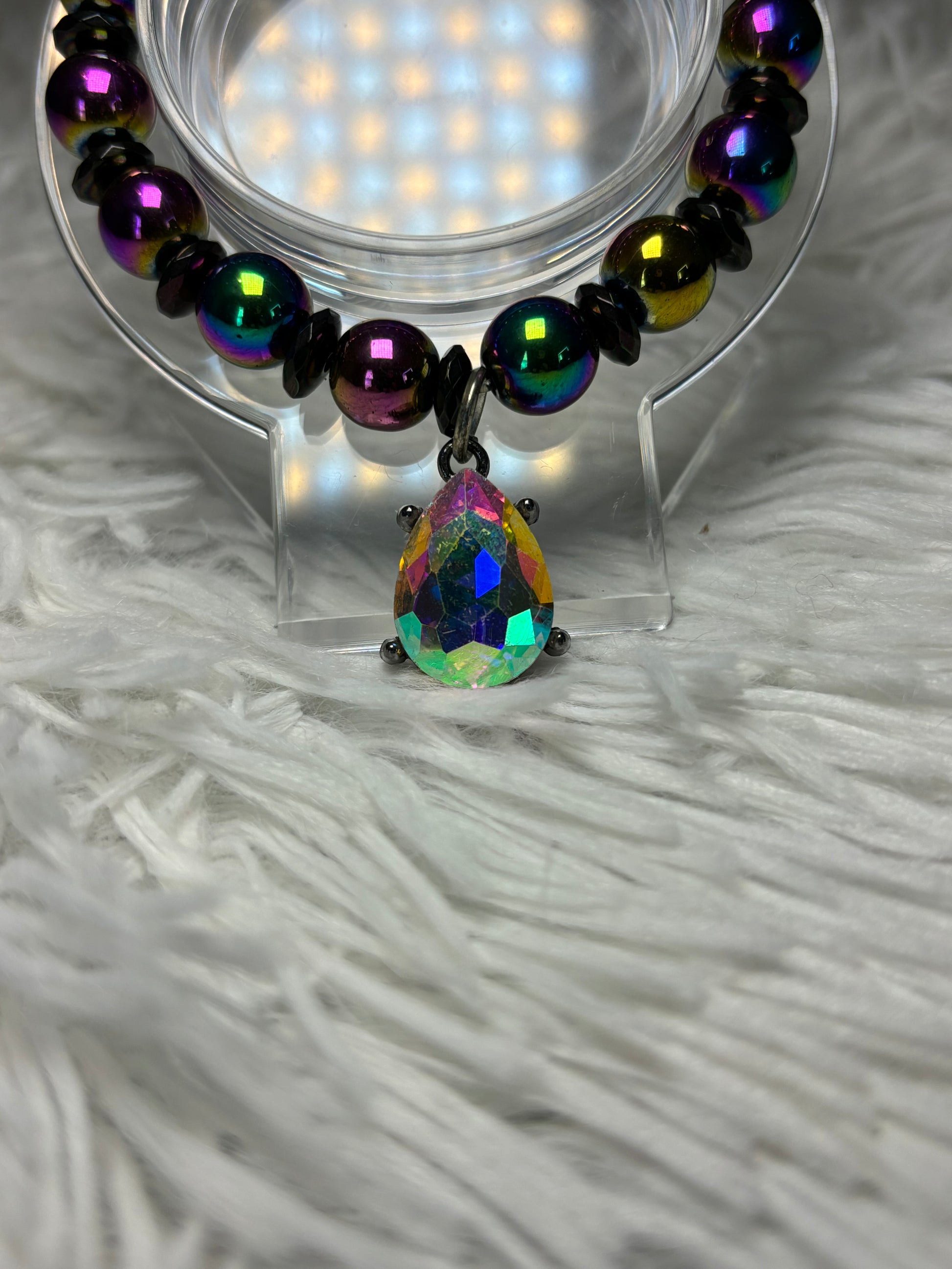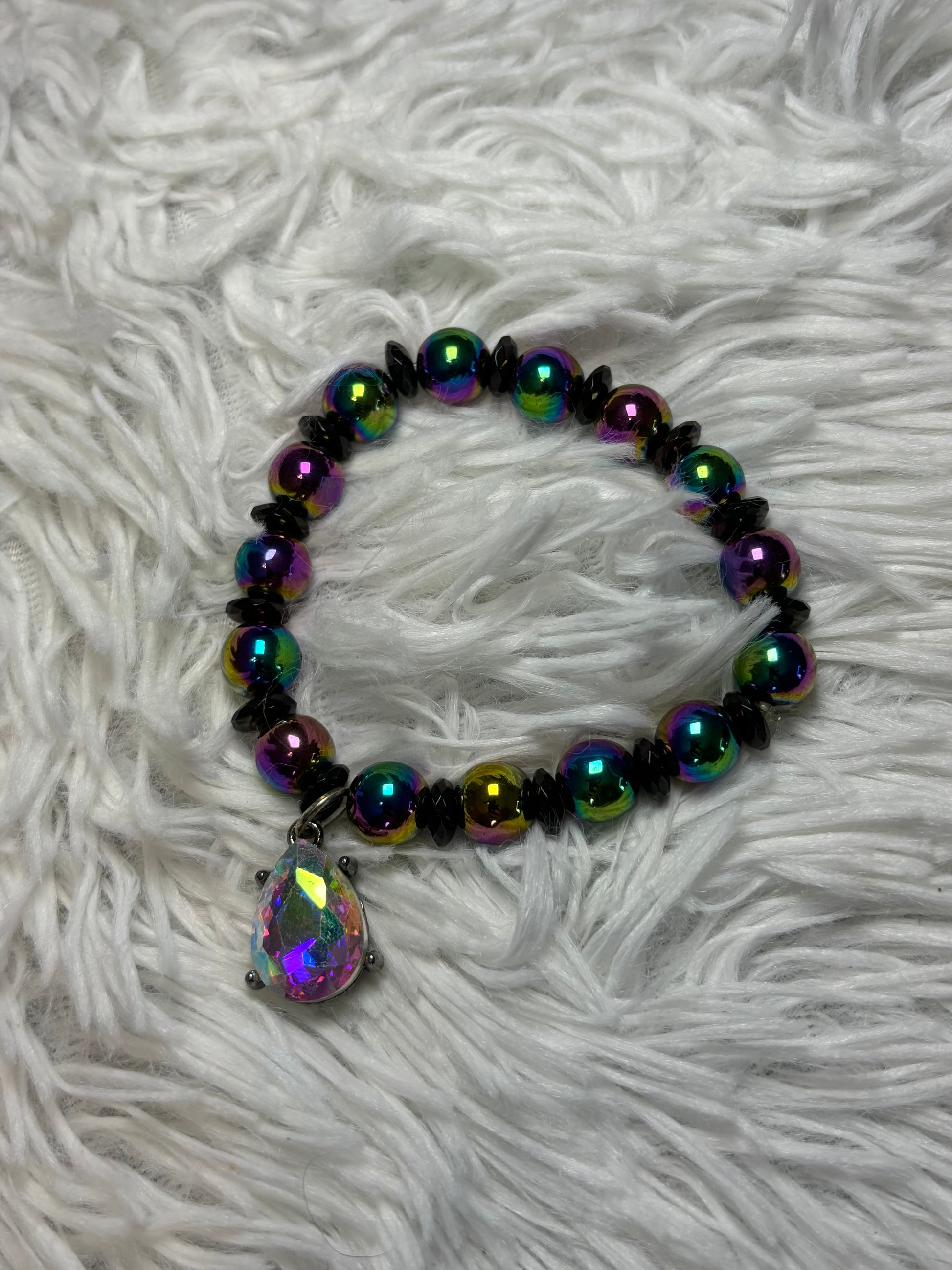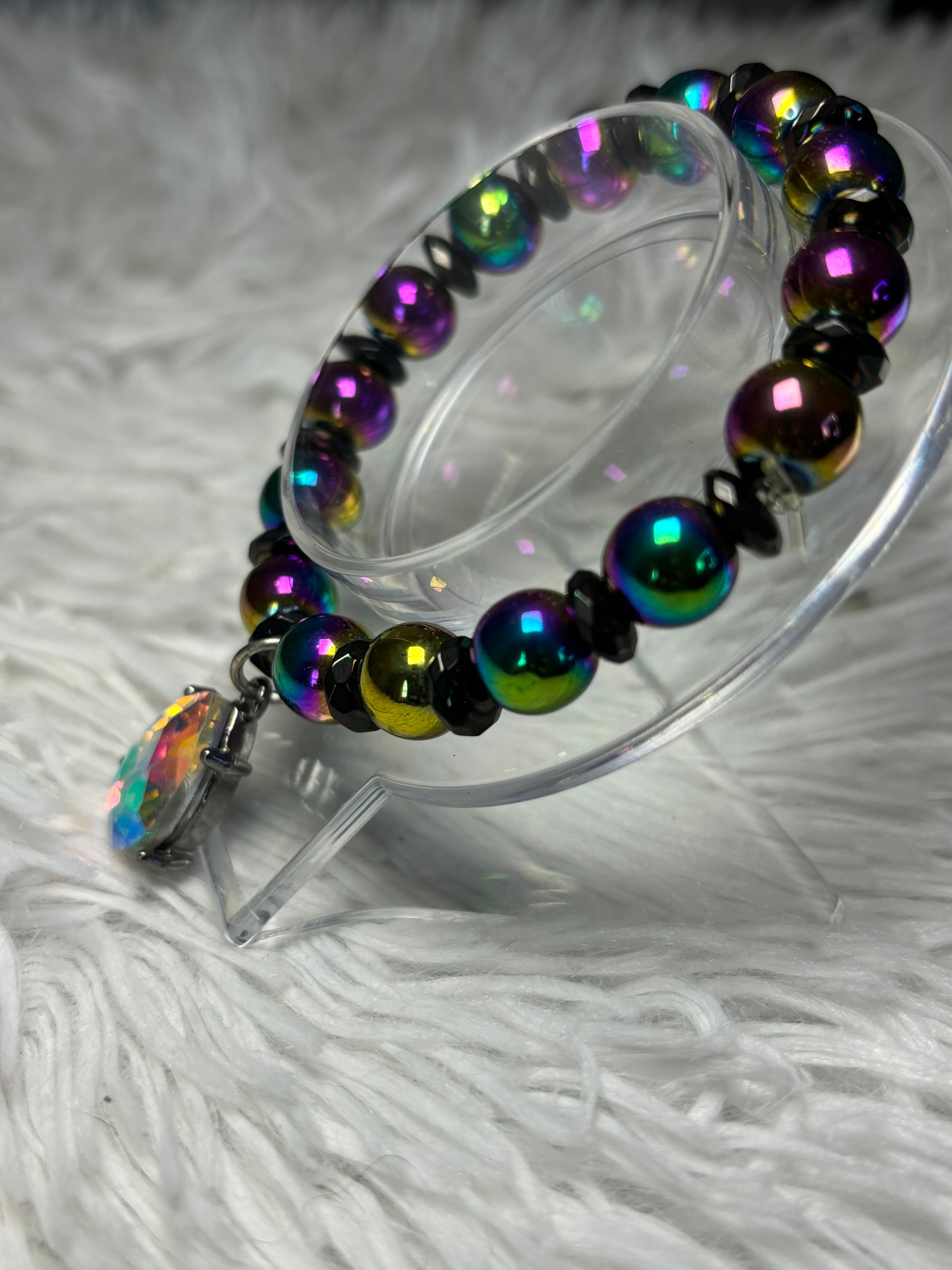 This mesmerizing bracelet features iridescent hematite beads that shimmer with shifting hues of green, purple, gold, and blue. Each bead reflects a cosmic glow, enhanced by sleek black disc spacers that add striking contrast. The design is completed with a radiant rainbow teardrop charm that captures the light beautifully, making this piece both bold and enchanting. Fits small to medium size wrists. Perfect for layering.