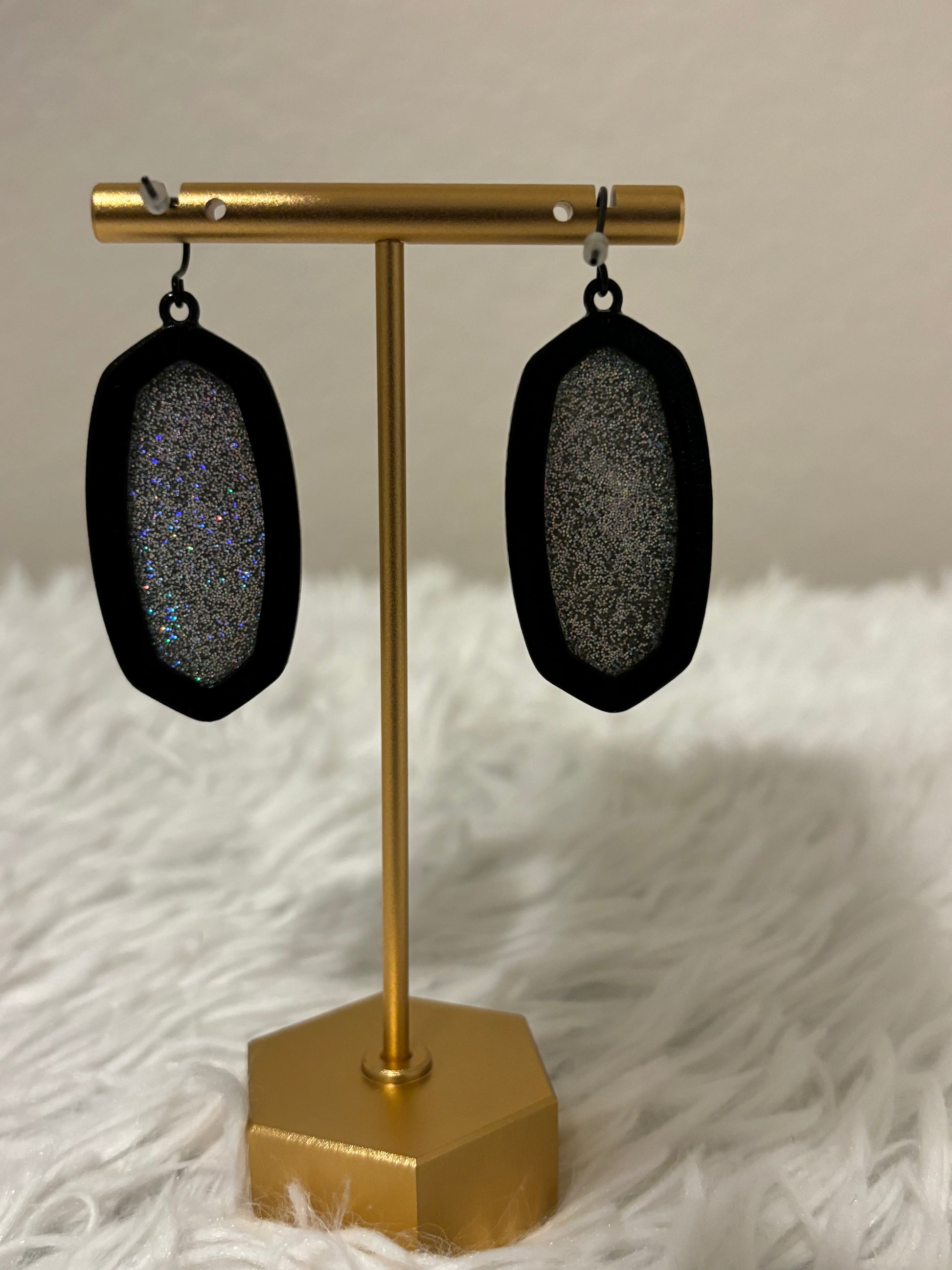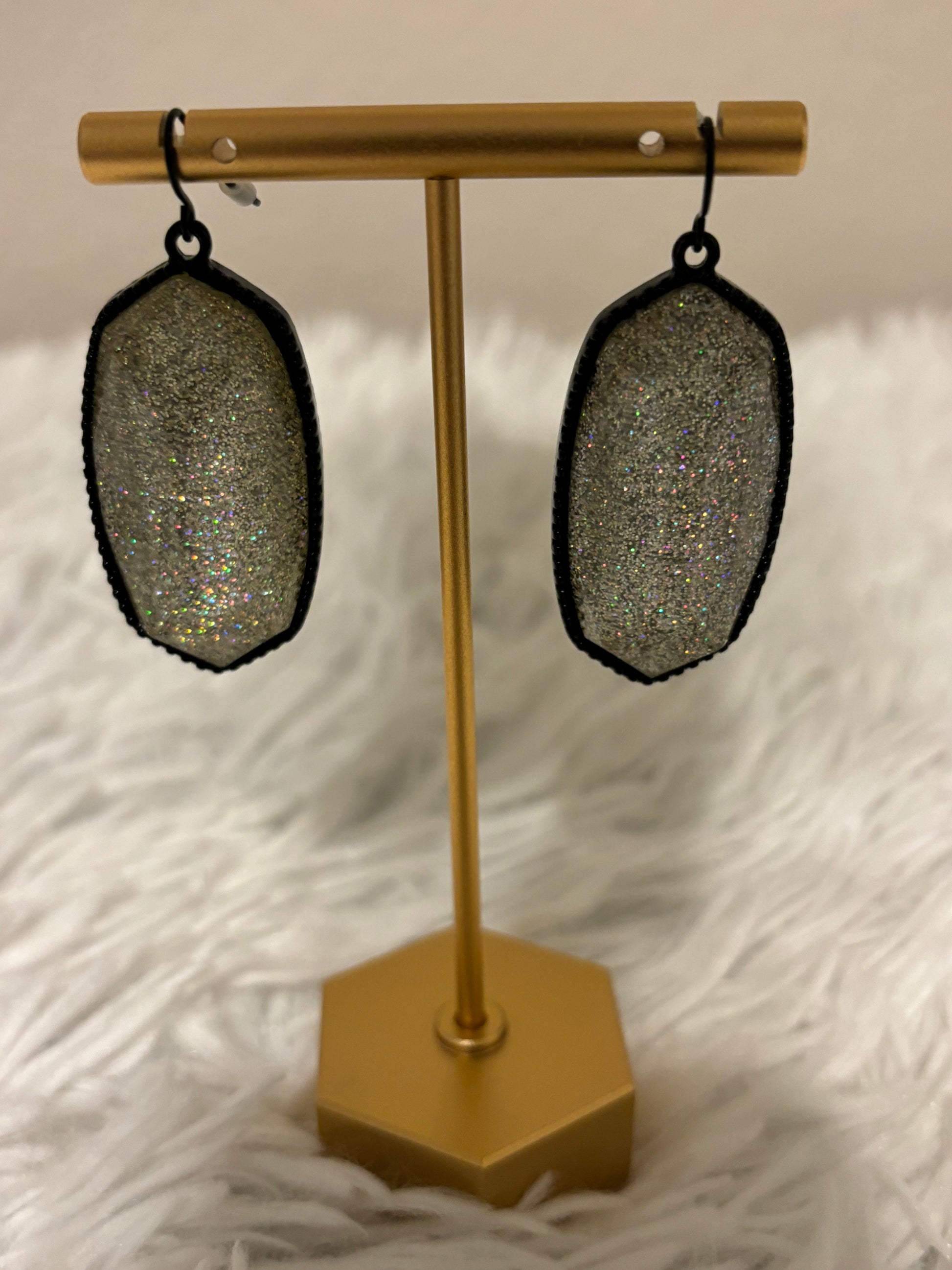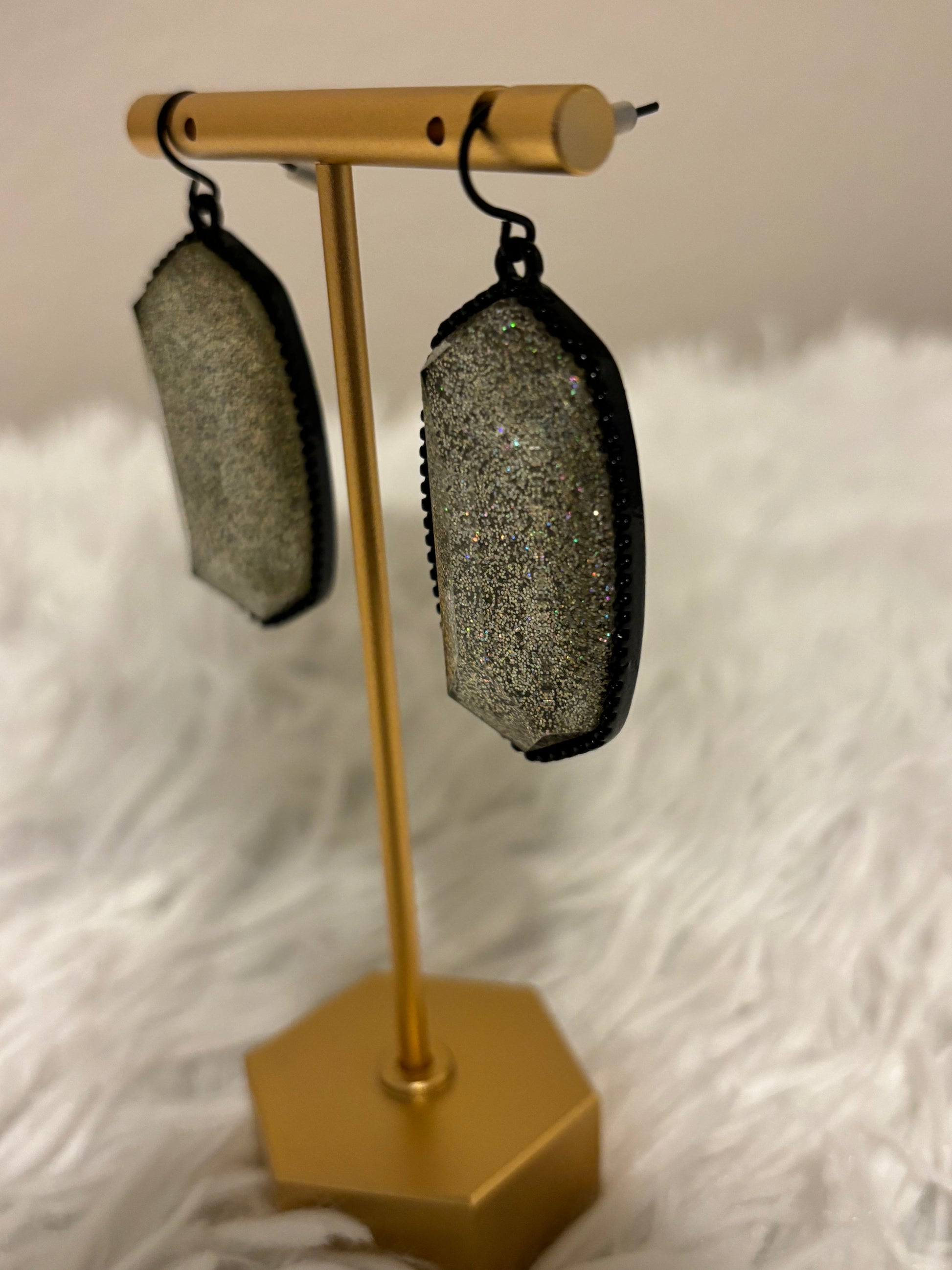 These KS-inspired earrings feature a striking black trim accentuated by a silver glitter pendant, creating an elegant contrast. Measuring 1.75 inches in length and 1 inch in width, their refined size makes them a versatile accessory suitable for both everyday wear and special occasions. The combination of sleek black detailing with sparkling silver adds a sophisticated touch to any outfit.