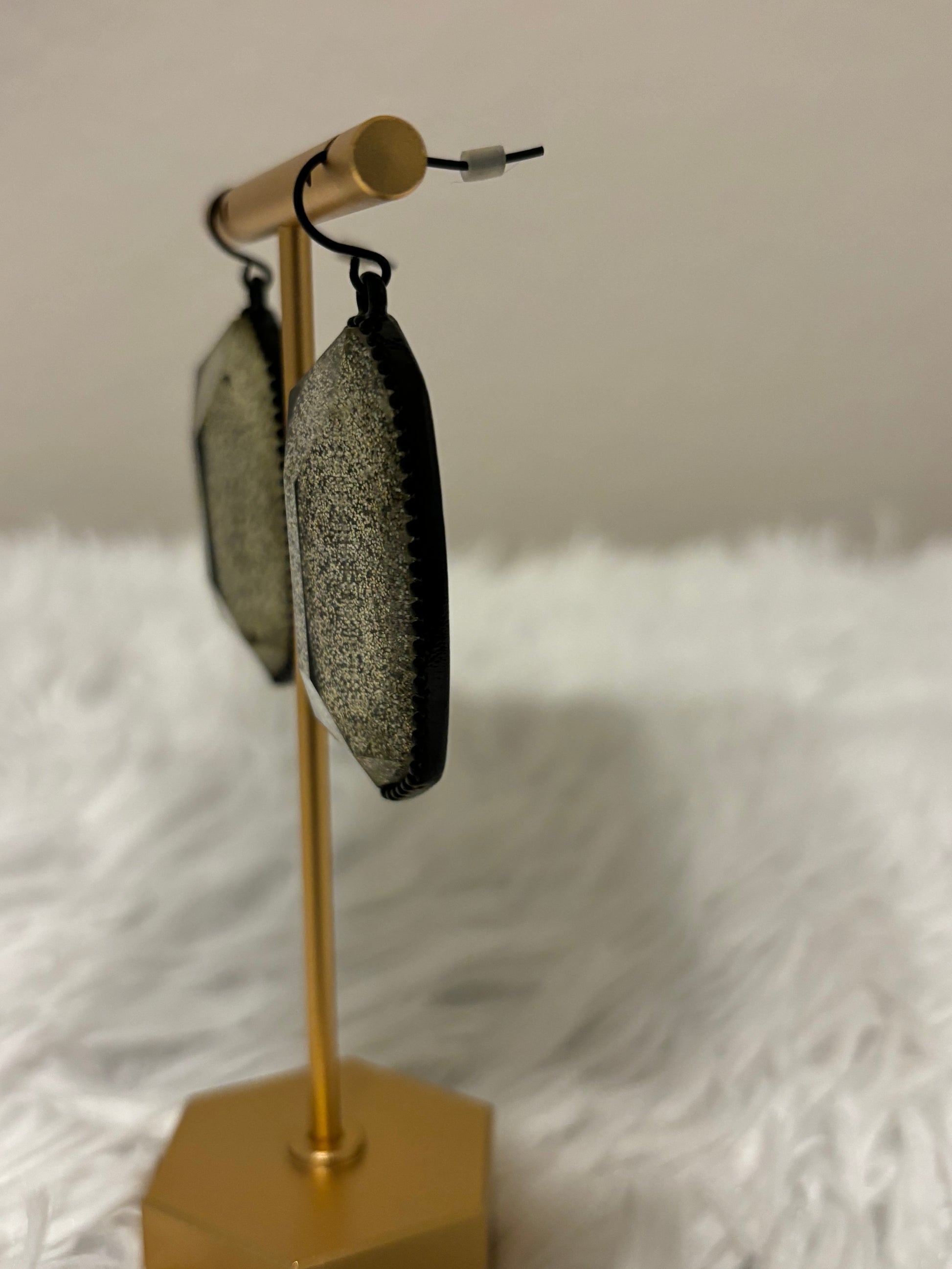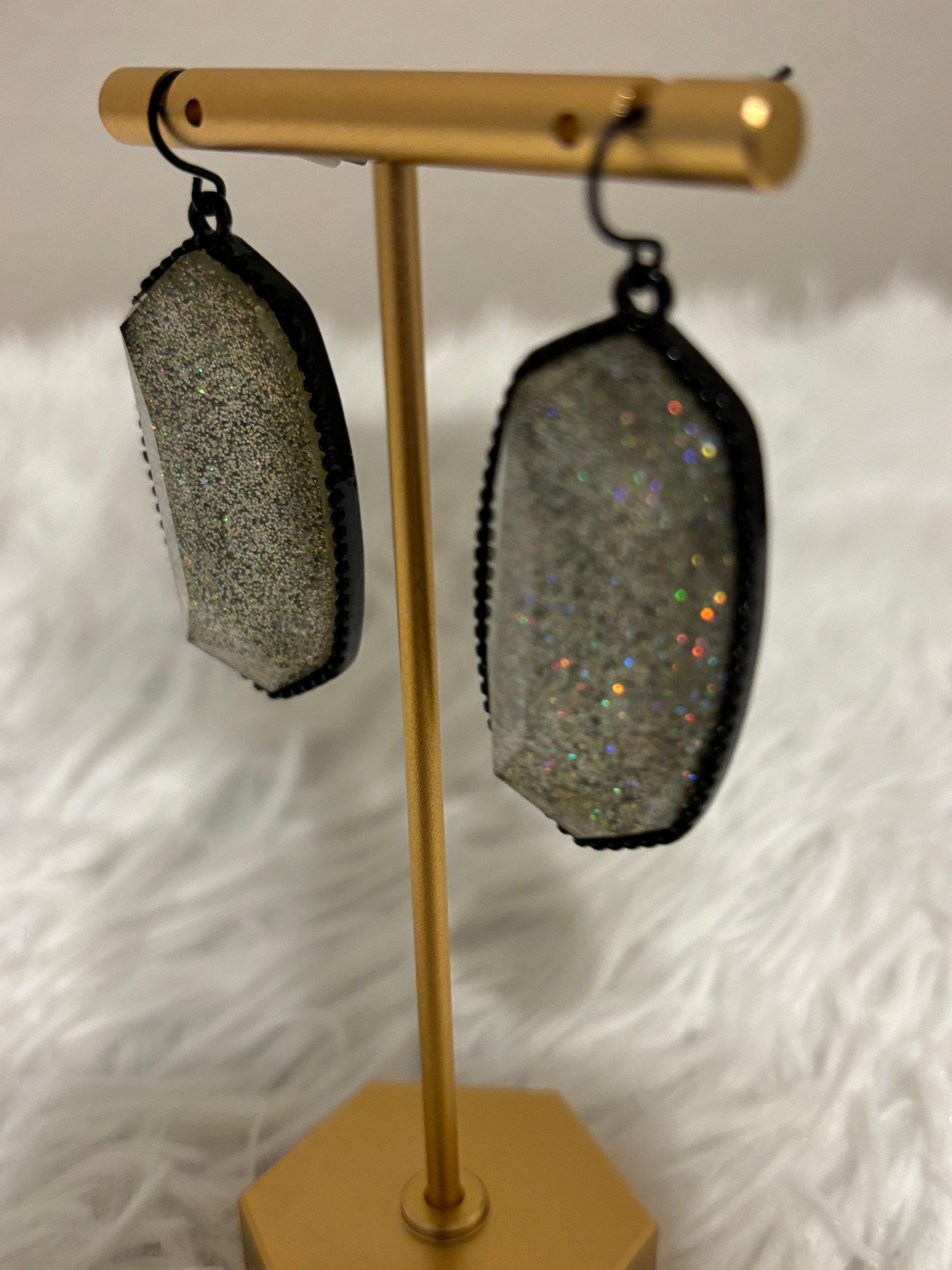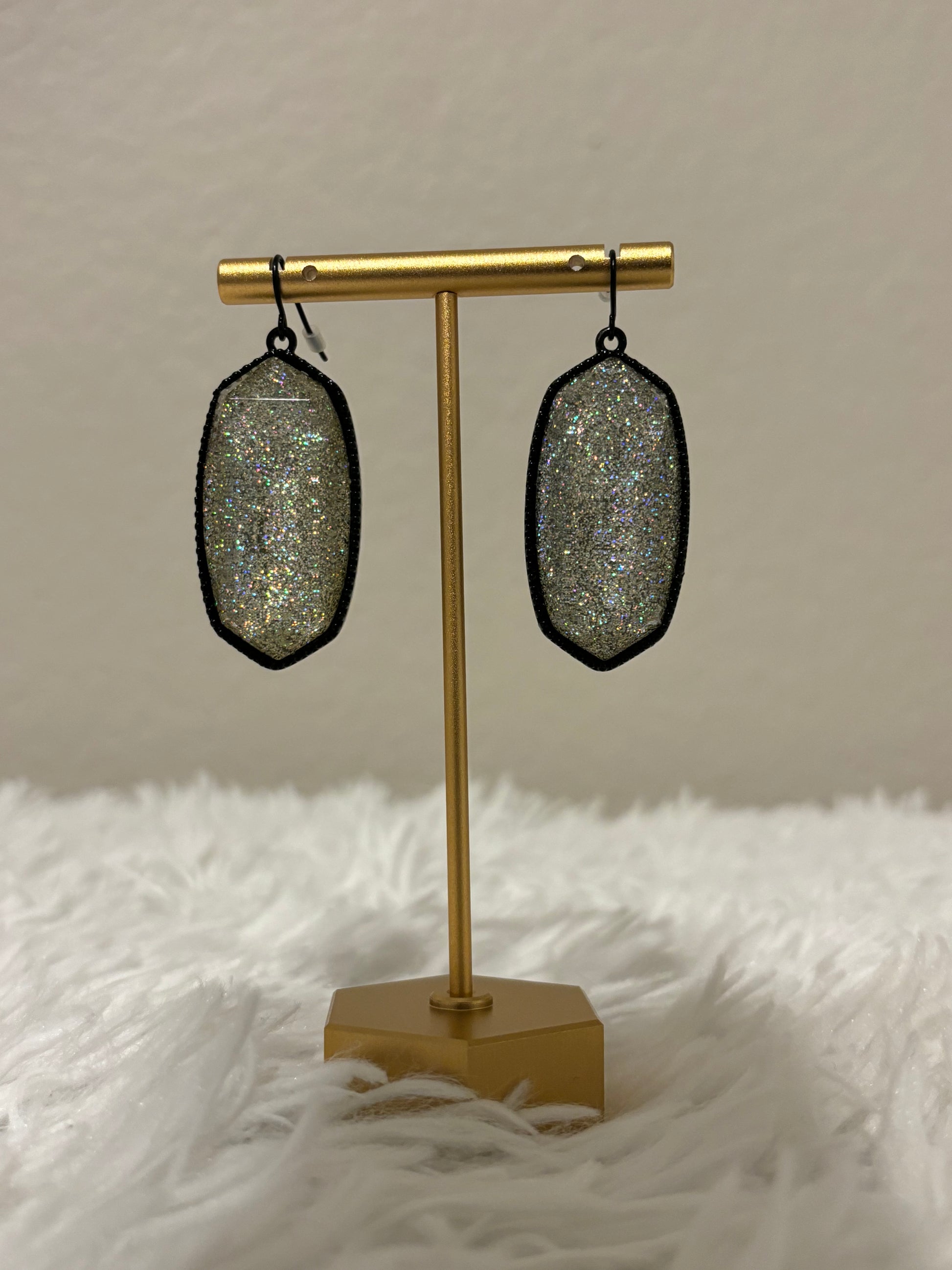 These KS-inspired earrings feature a striking black trim accentuated by a silver glitter pendant, creating an elegant contrast. Measuring 1.75 inches in length and 1 inch in width, their refined size makes them a versatile accessory suitable for both everyday wear and special occasions. The combination of sleek black detailing with sparkling silver adds a sophisticated touch to any outfit.