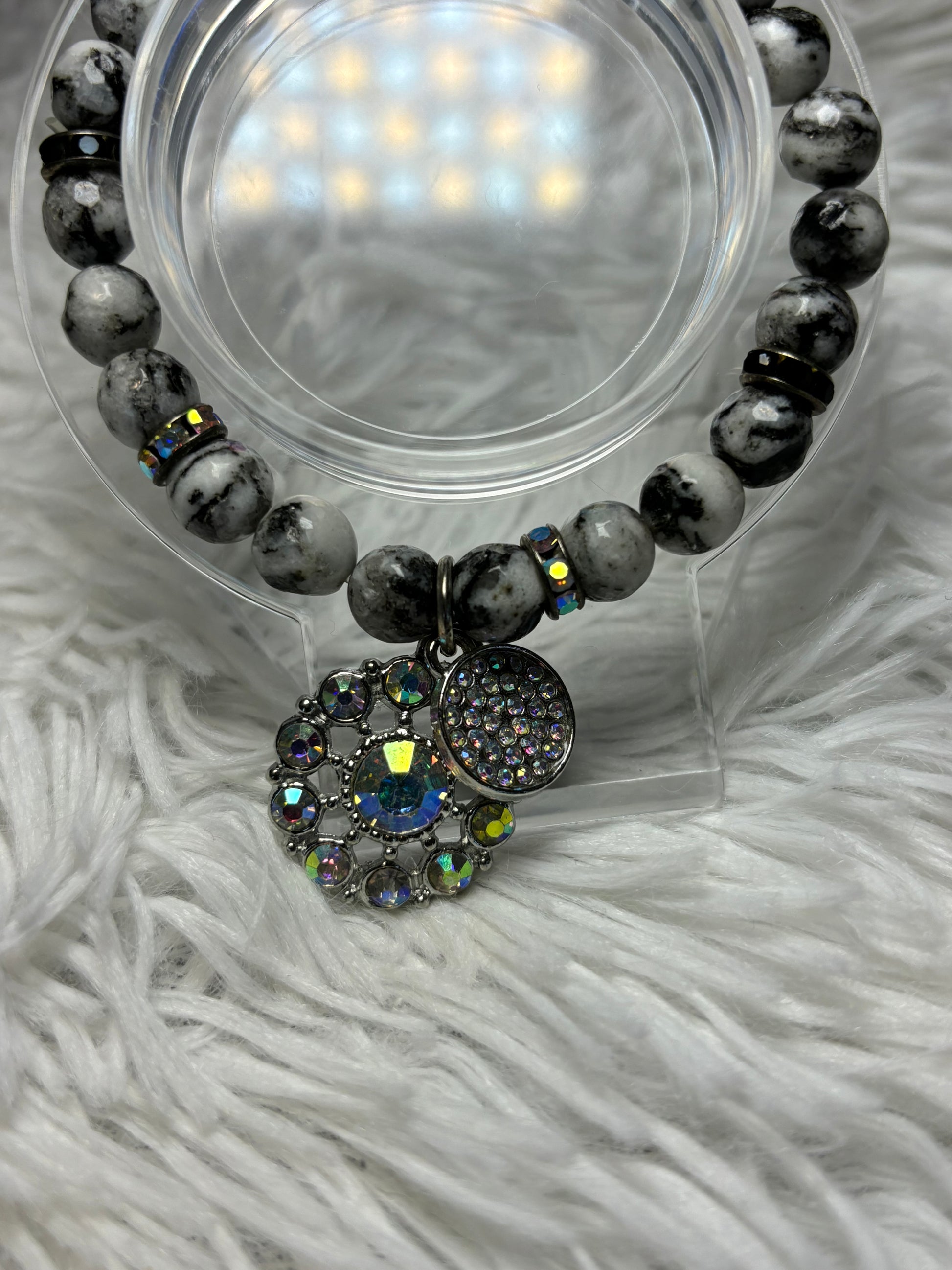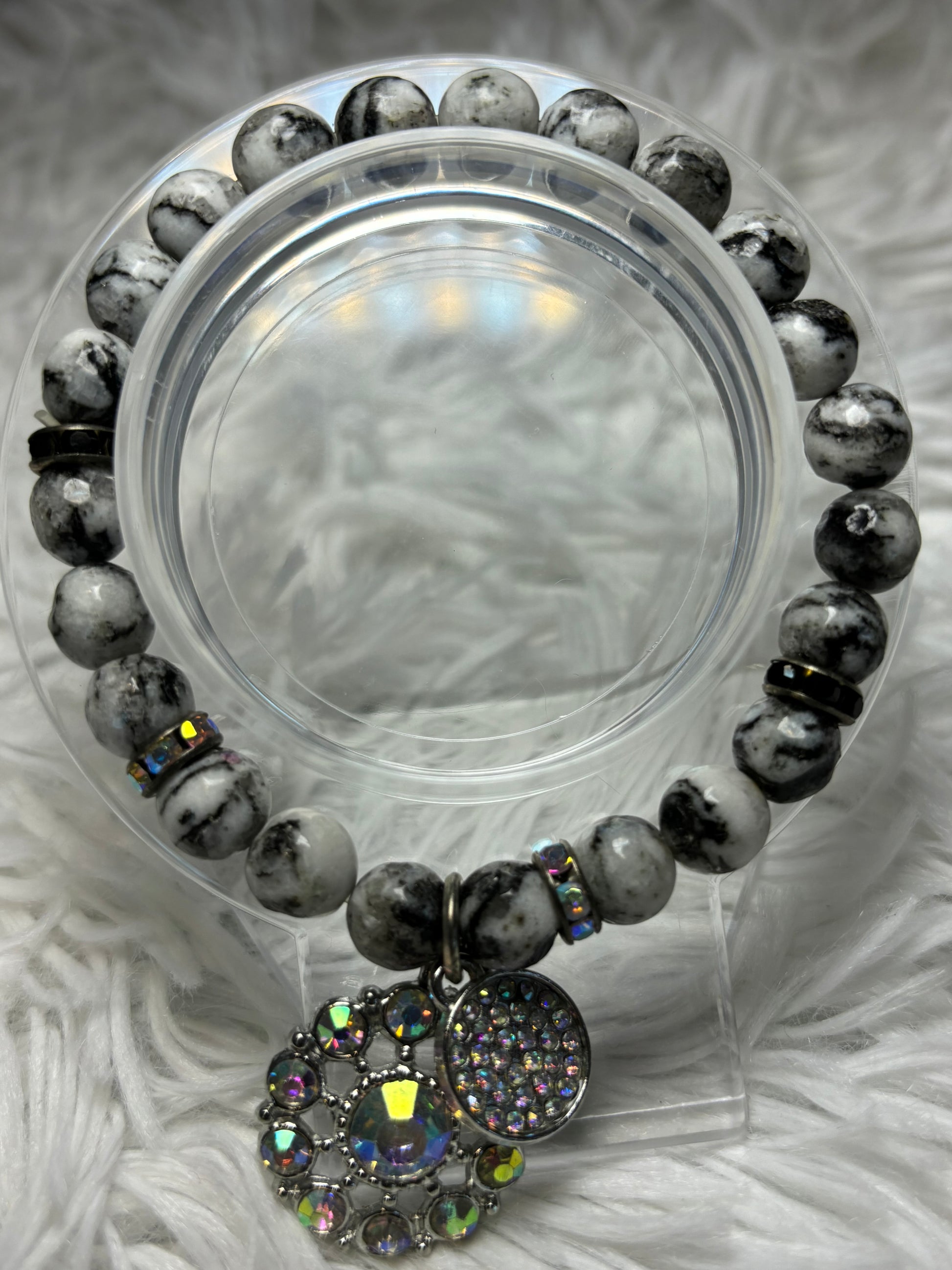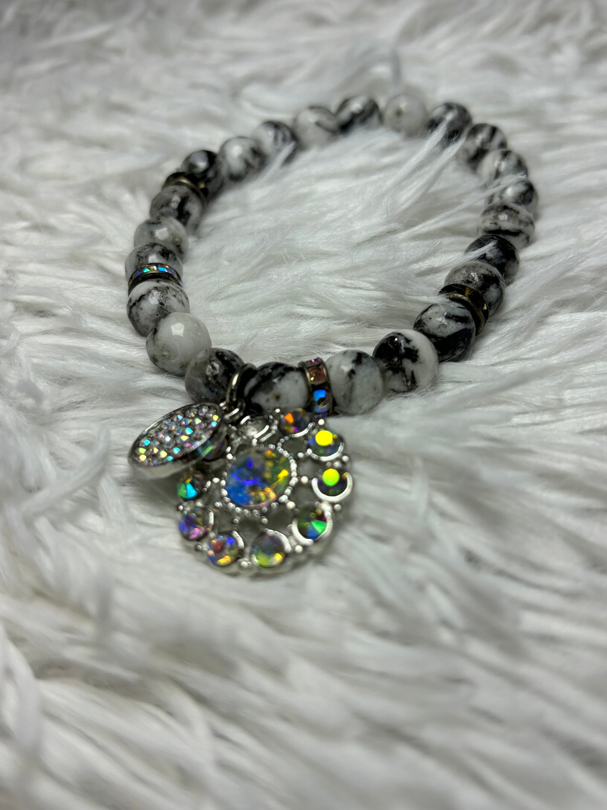 This beaded bracelet, crafted with smooth marbled beads in shades of white and gray, each with its on unique veining. Sparkling rhinestone spacers add a touch of glamour, while two dazzling AB charms steal the spotlight- adorned with holographic stones that shimmer with every movement, casting a rainbow of light. Fits small to medium size wrist.