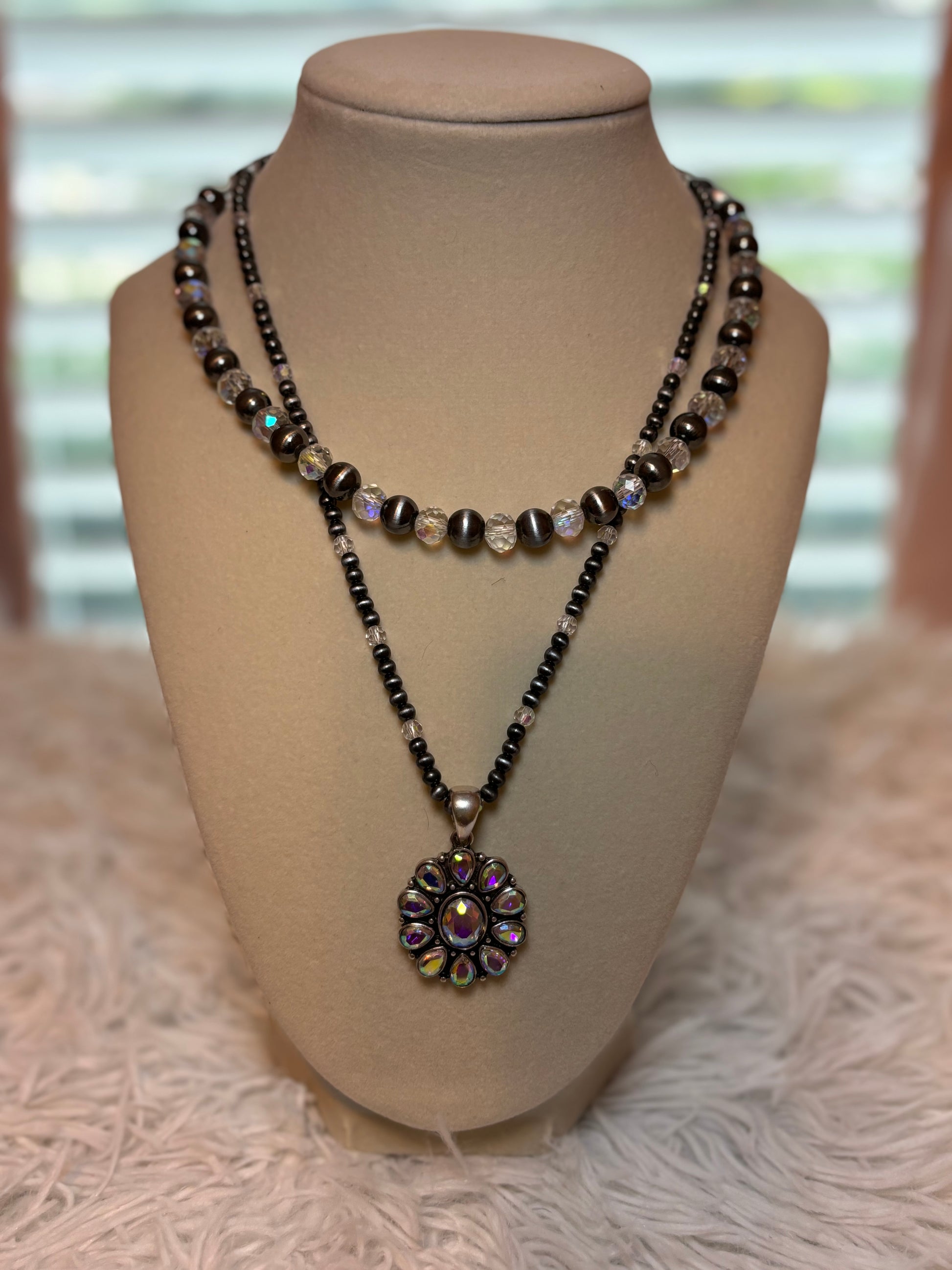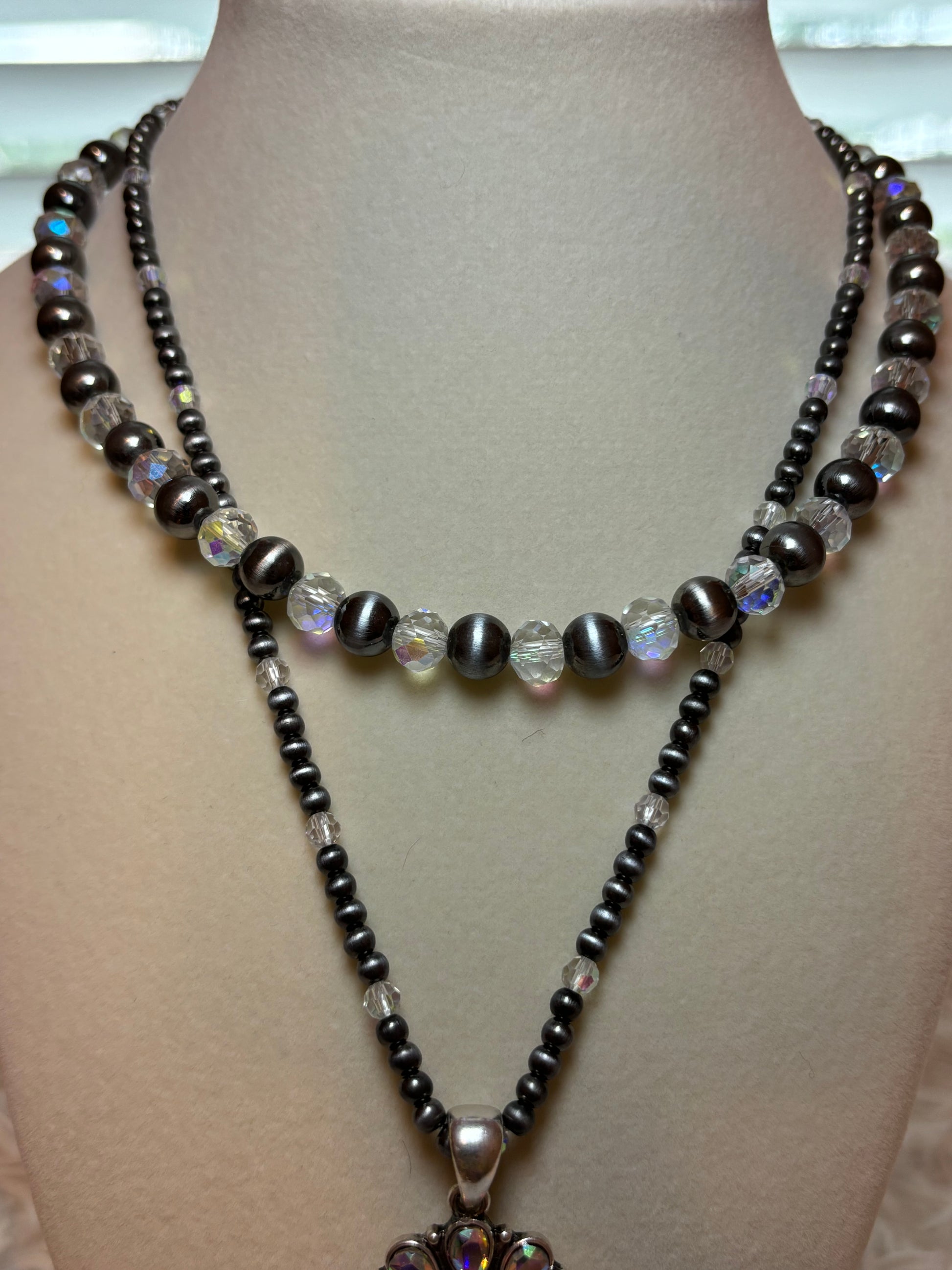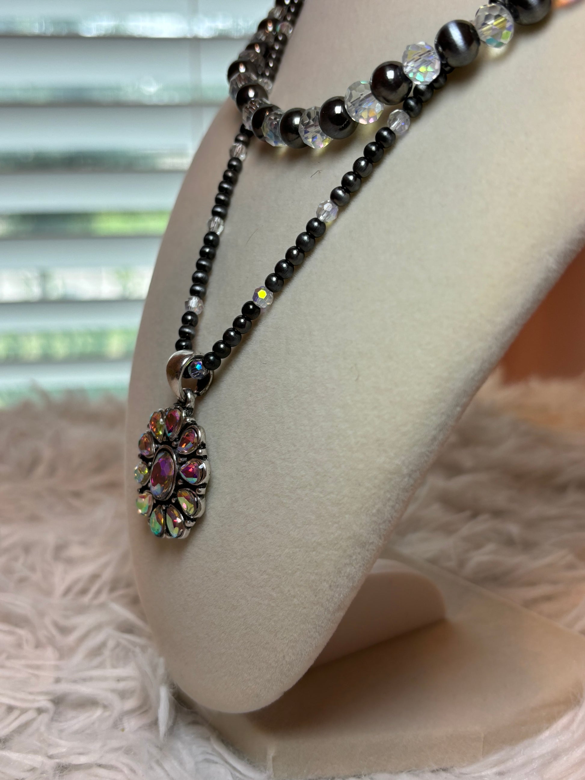 Two row Navajo style bead and glass bead necklace with Concho Pendant