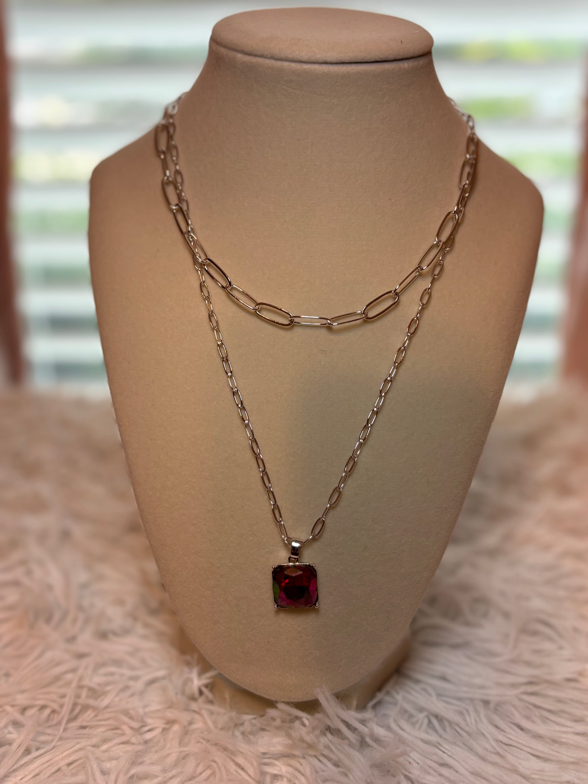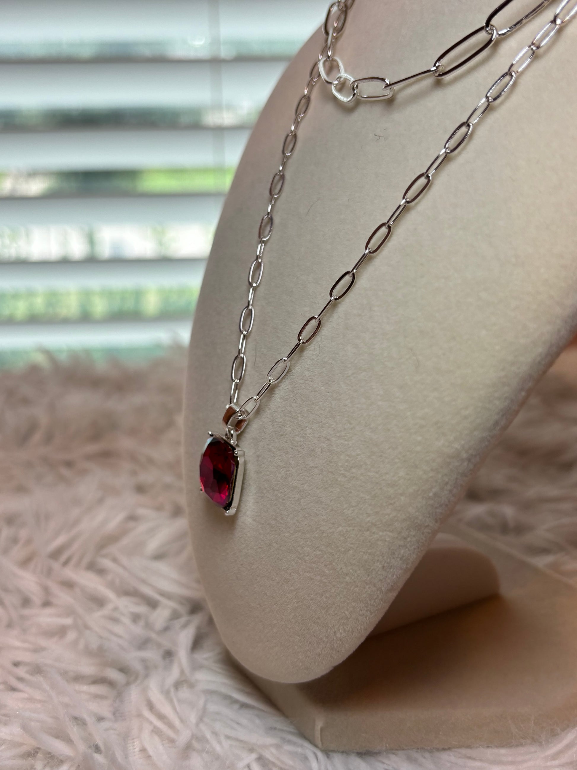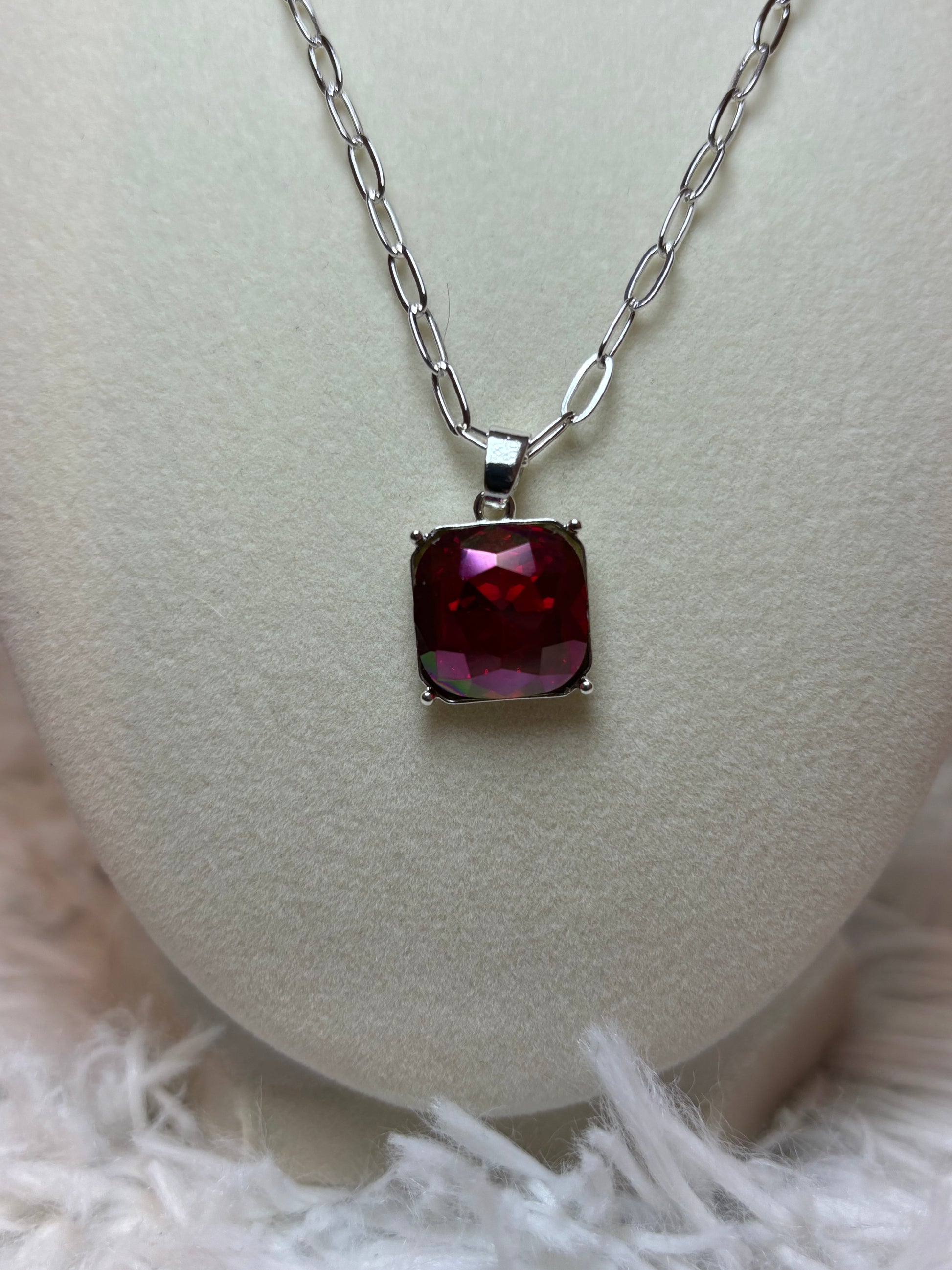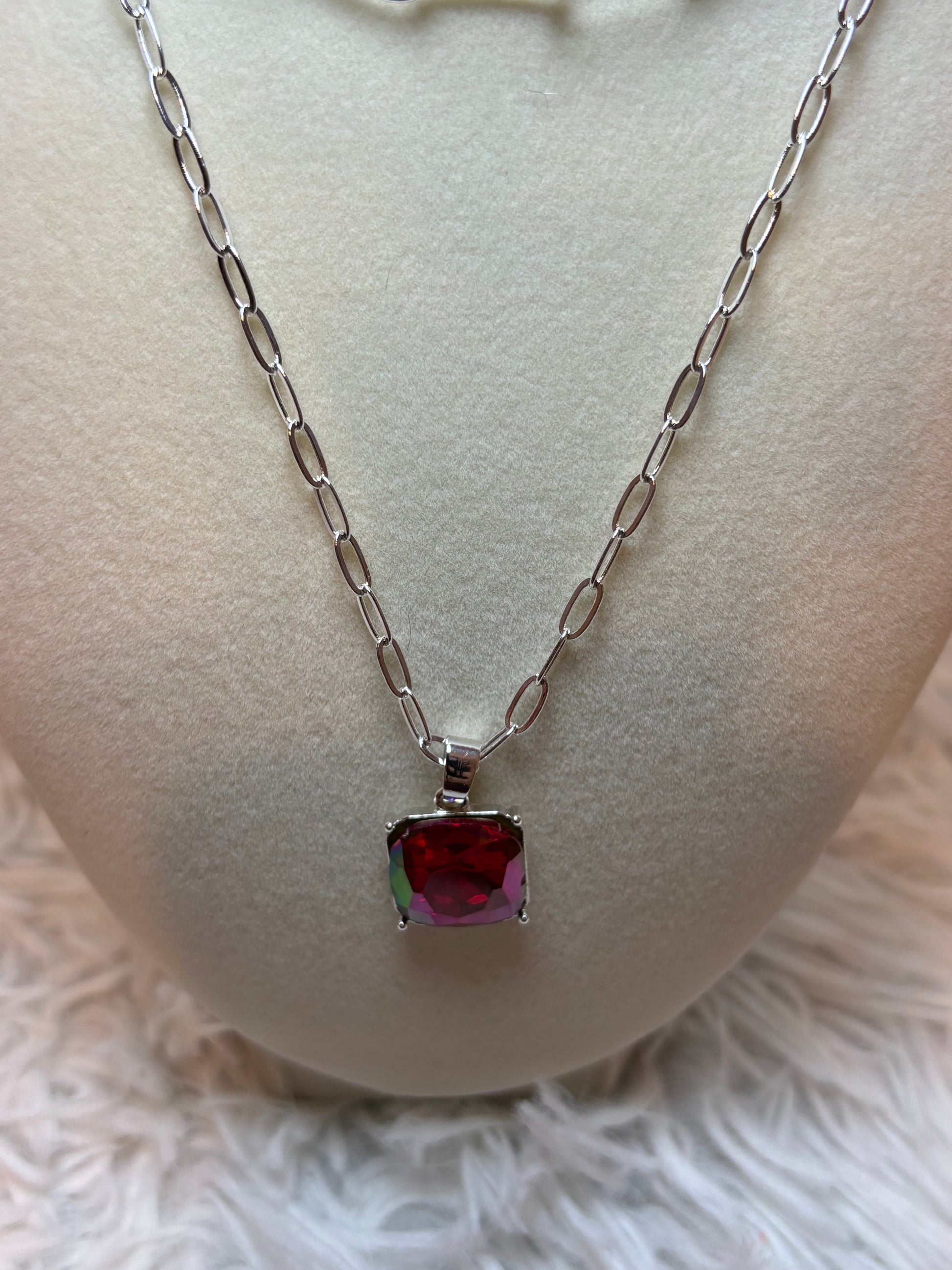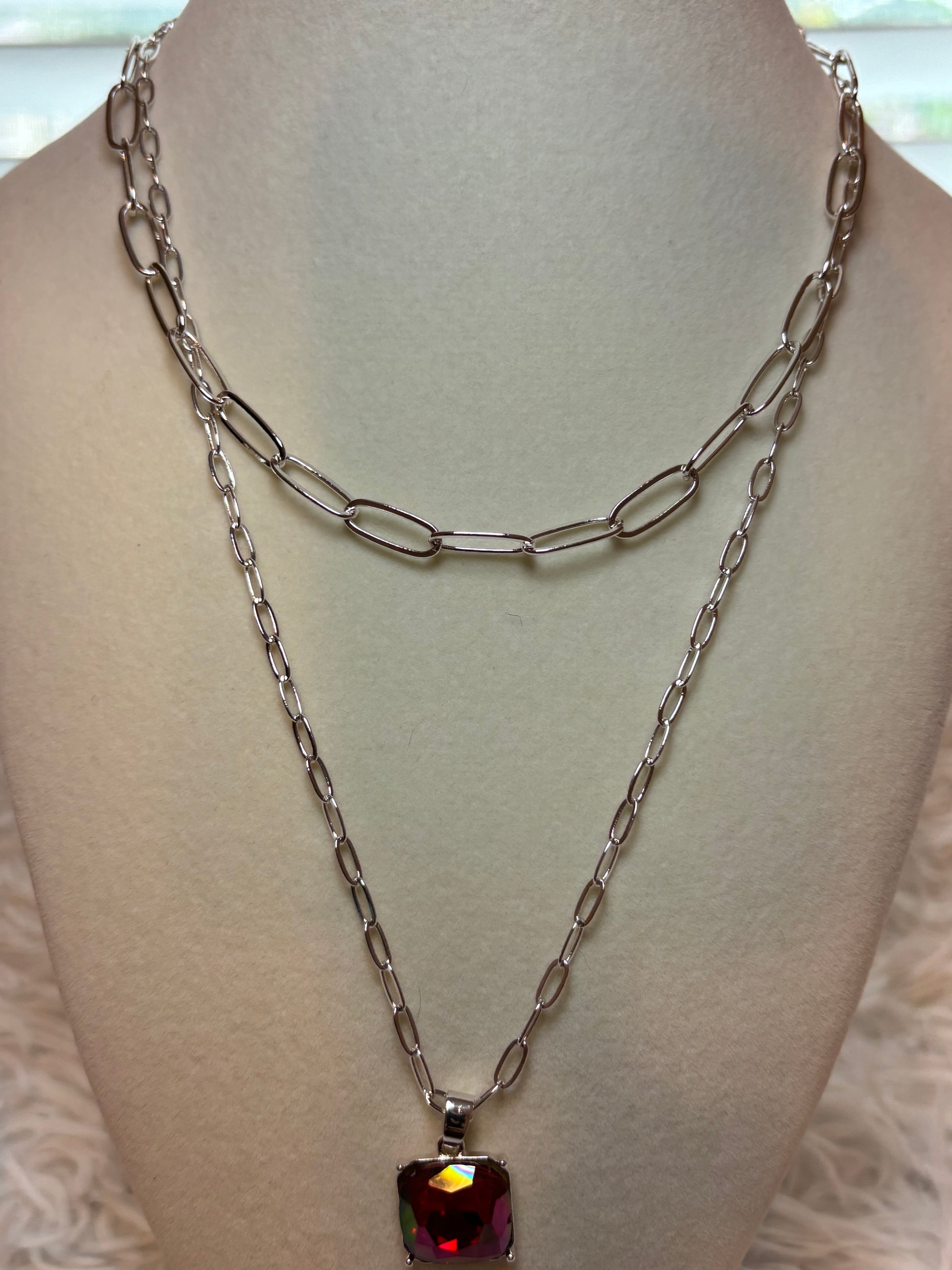 Silver Paperclip Style Necklace with Red Rhinestone that shifts colors with light
