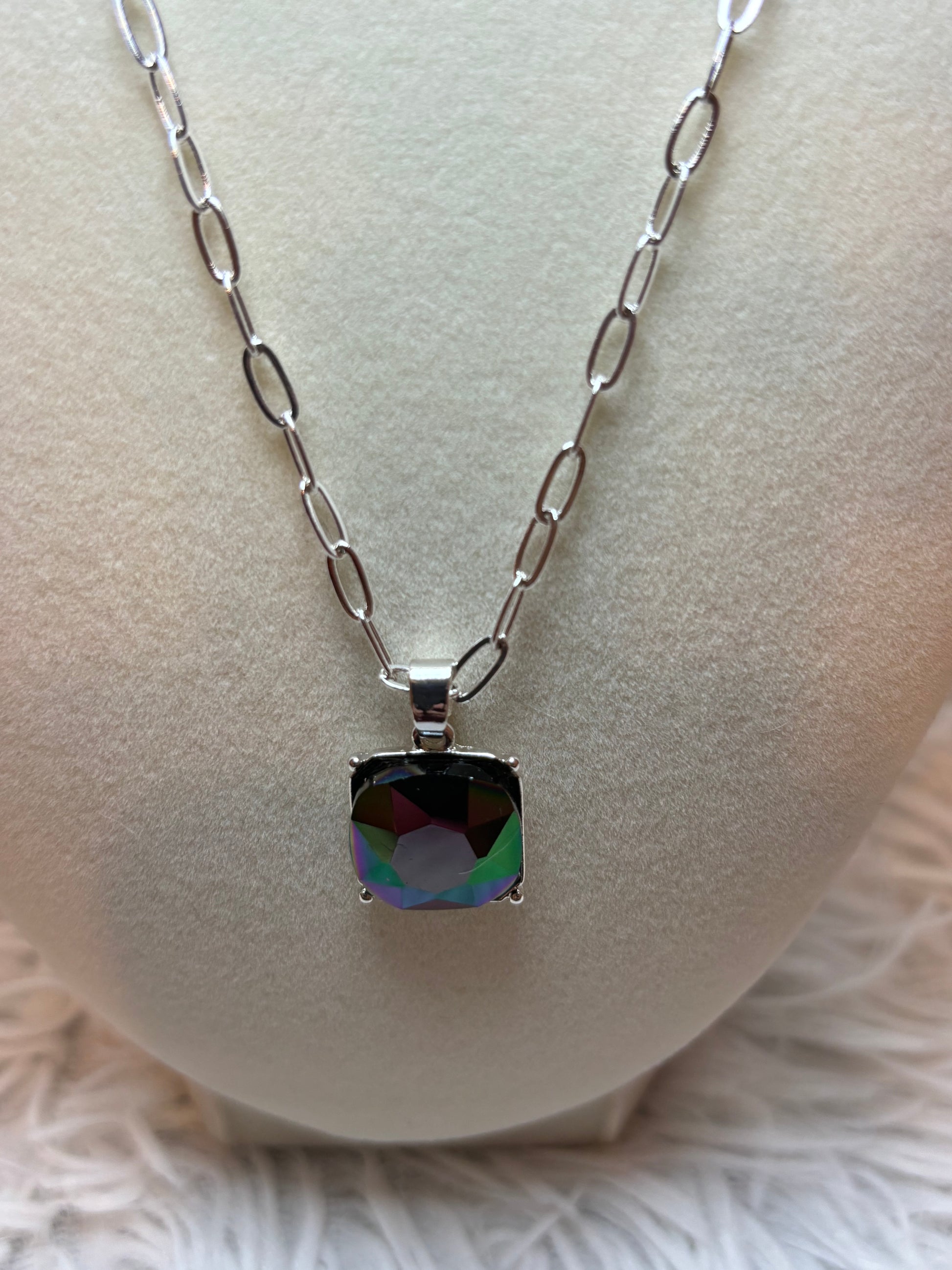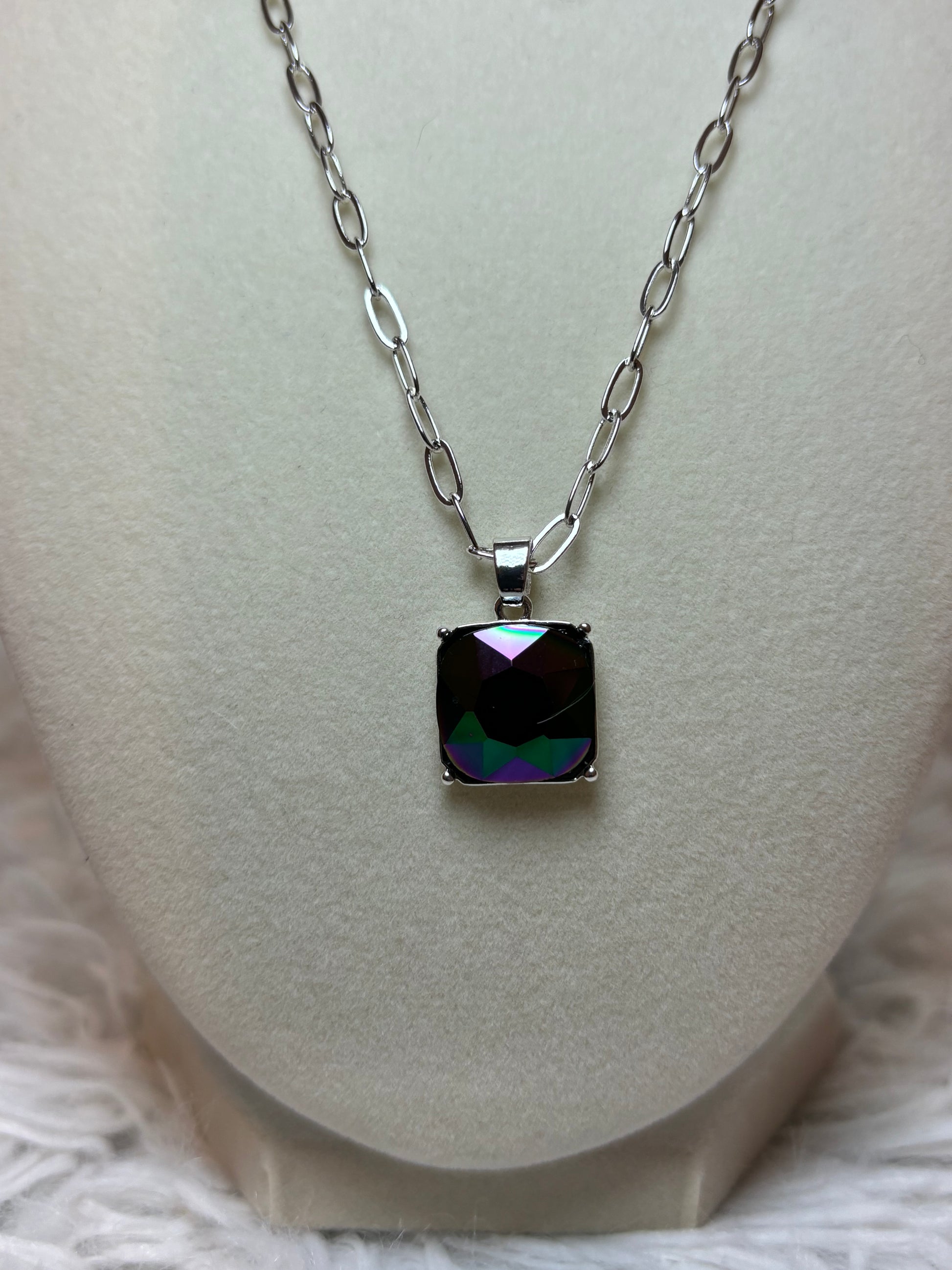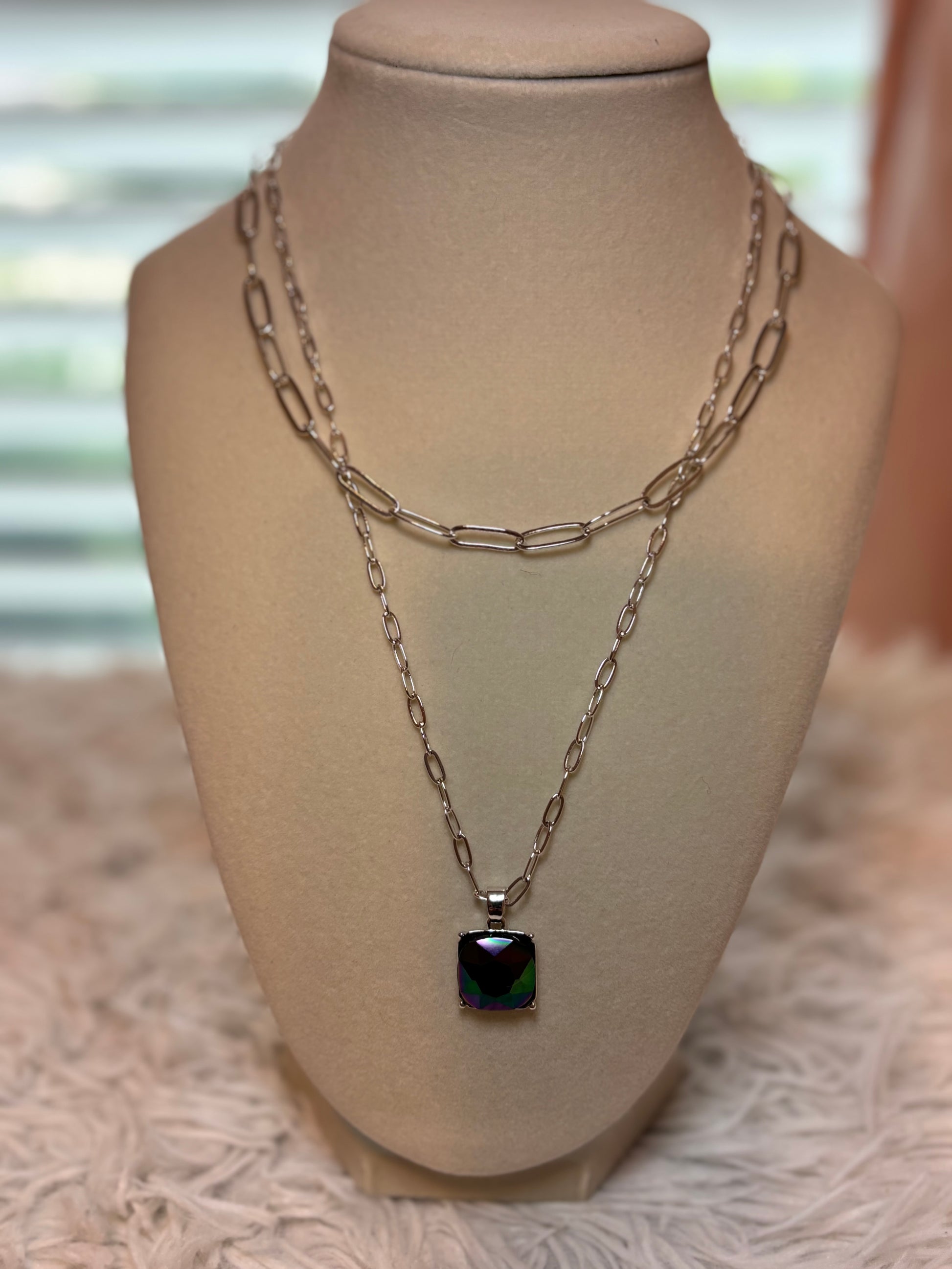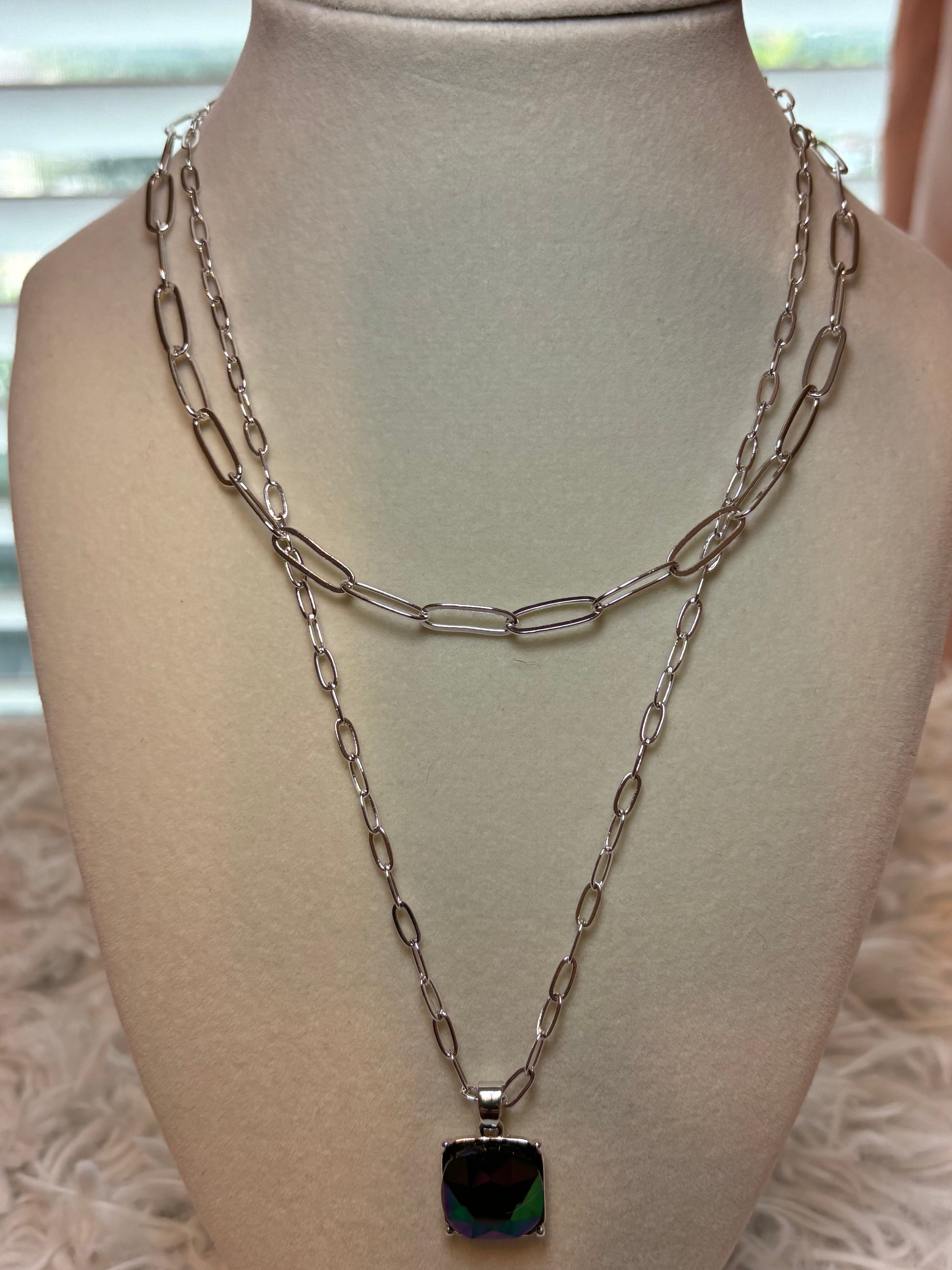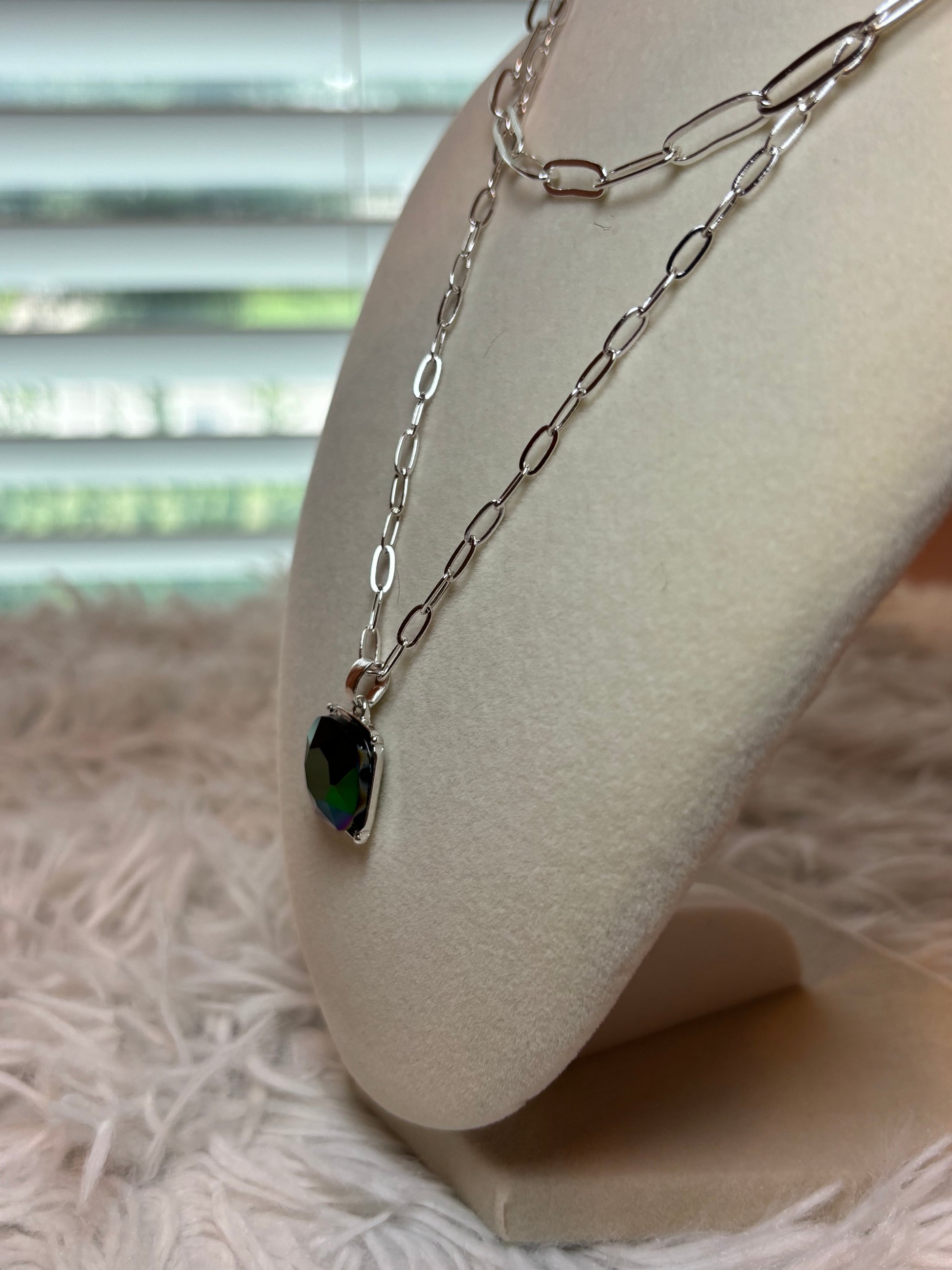 Blue/Green Rhinestone with Silver Double Paperclip Style Necklace. Pendant color shifts with light.