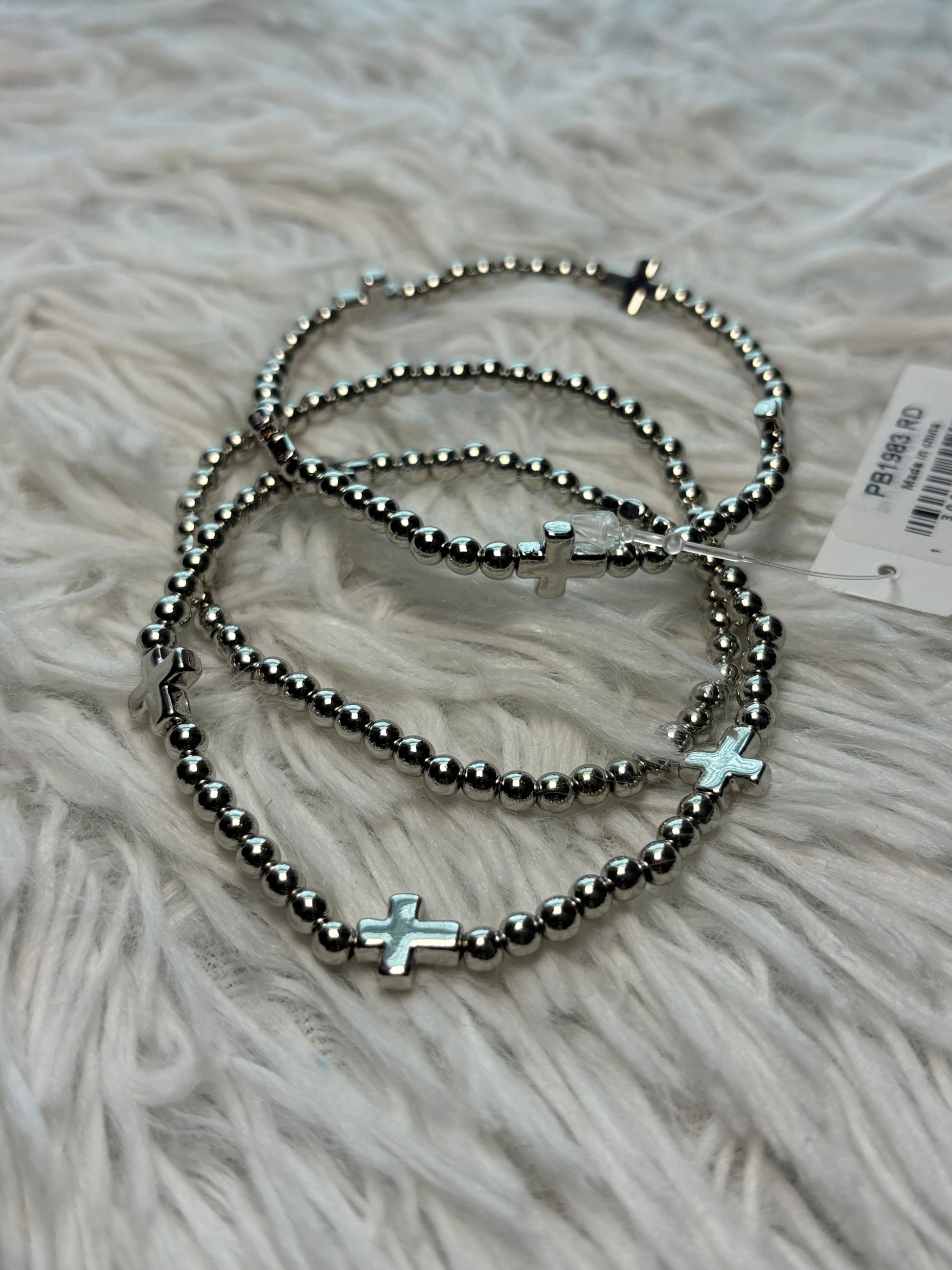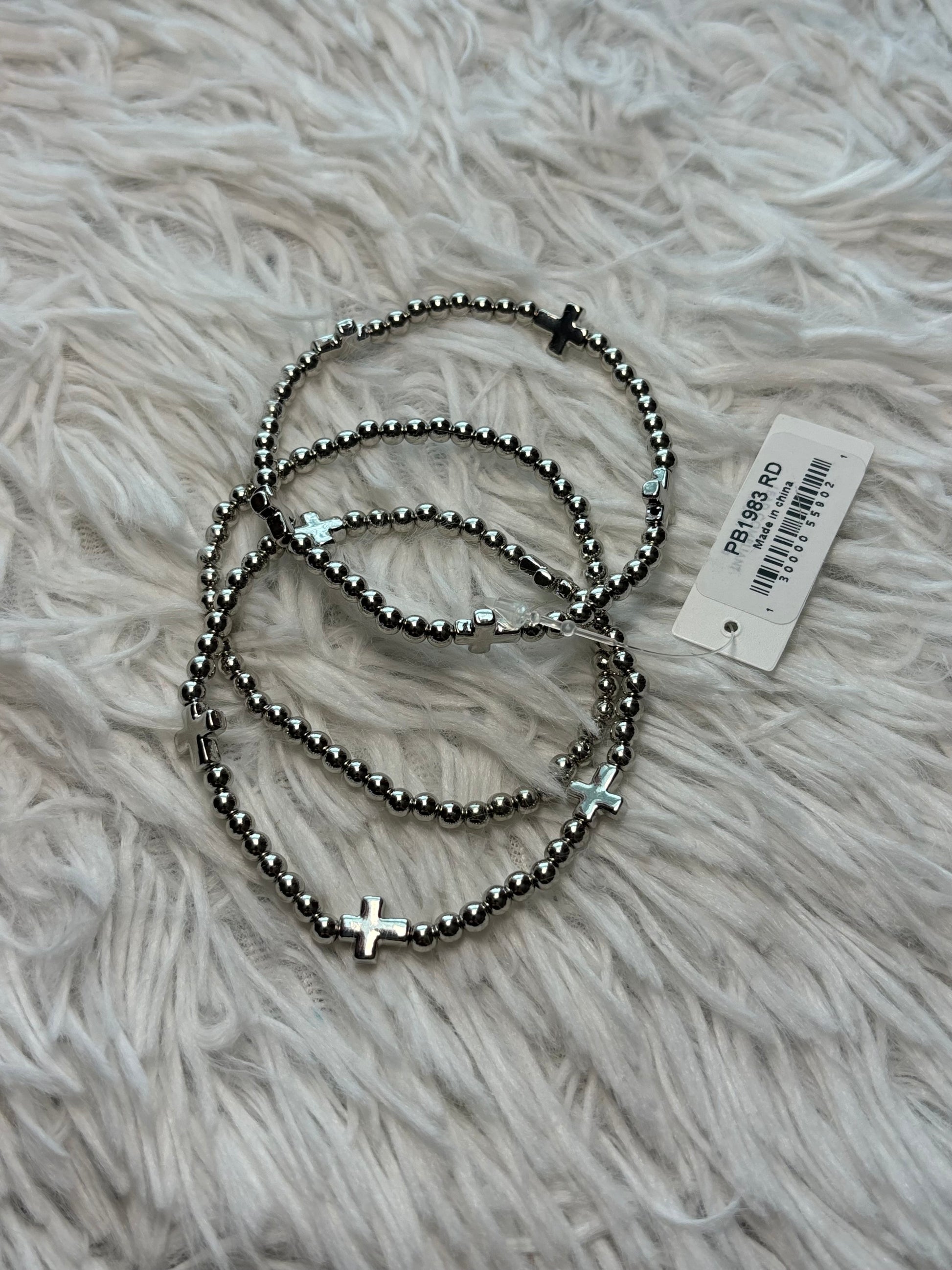 Three-piece bracelet set featuring silver beading and silver cross accents.