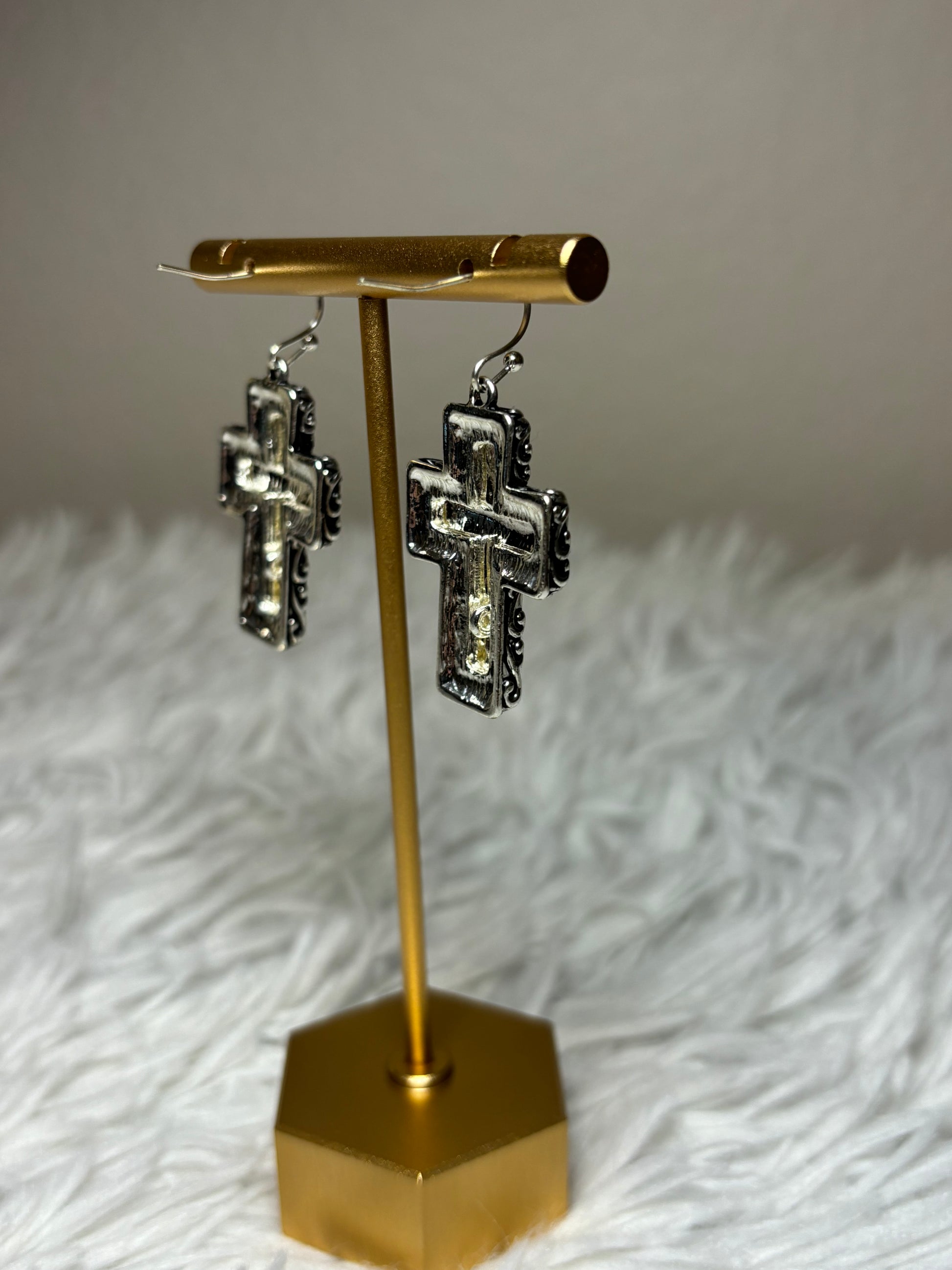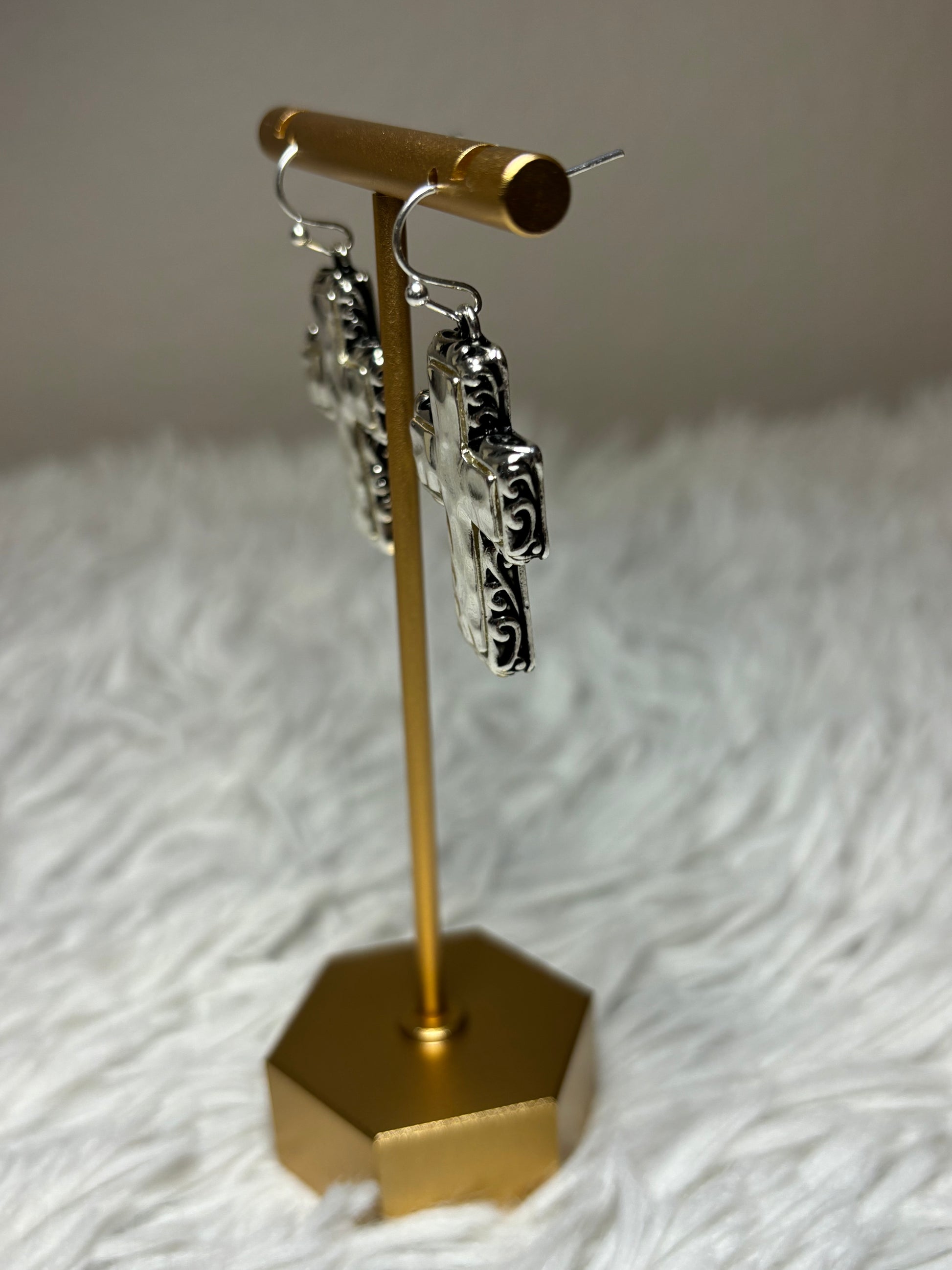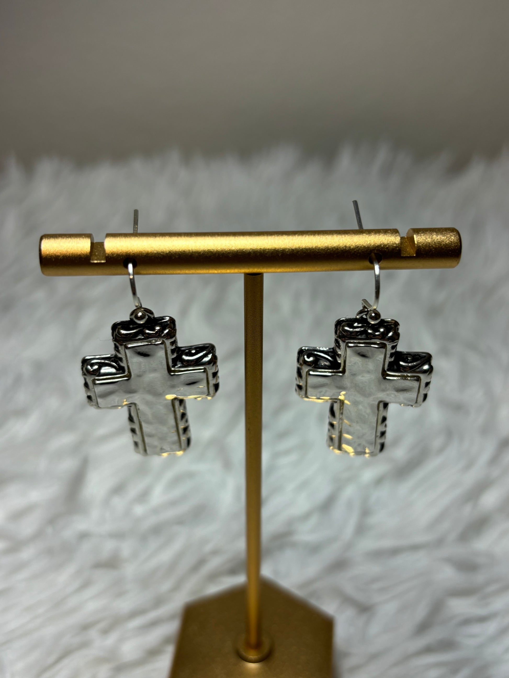 These Tailored Filigree Cross Dangle Earrings showcase intricate antique silver detailing, measuring just over an inch long and under an inch wide for a delicate yet noticeable presence. Crafted without lead or nickel, they offer a comfortable and safe wear for sensitive skin. Their refined design adds a subtle, elegant statement to any outfit, ideal for those seeking a timeless accessory with expert craftsmanship.