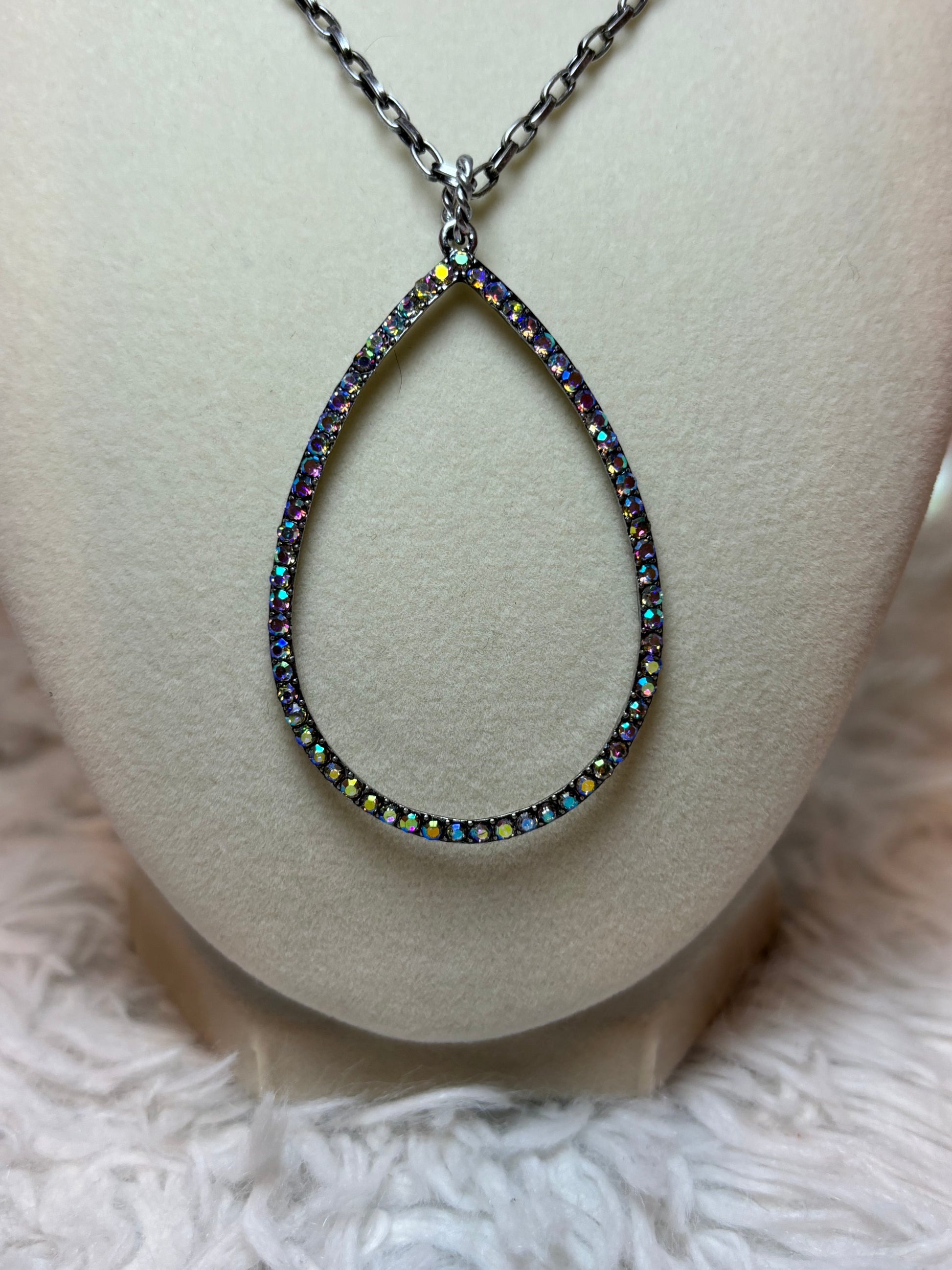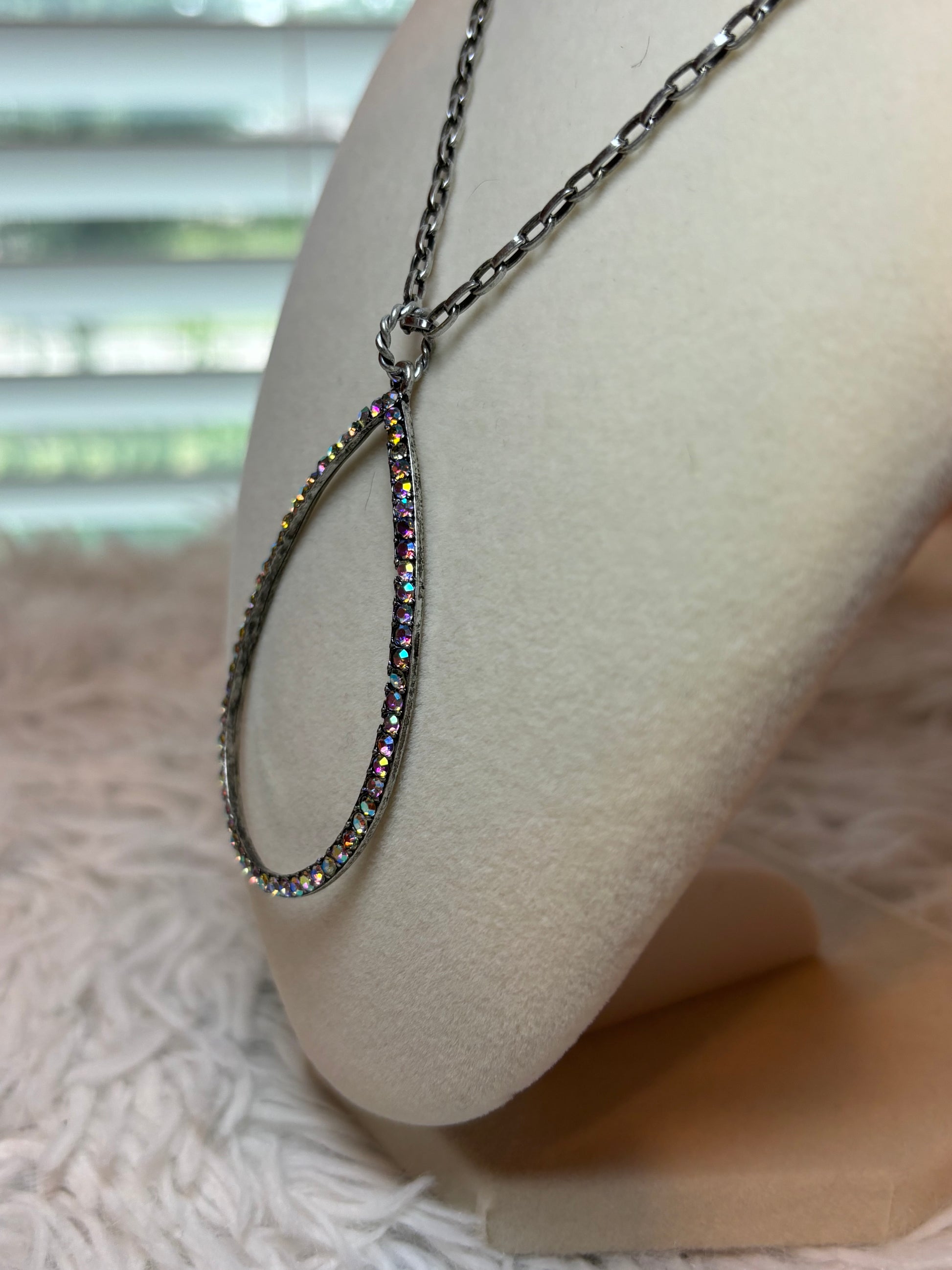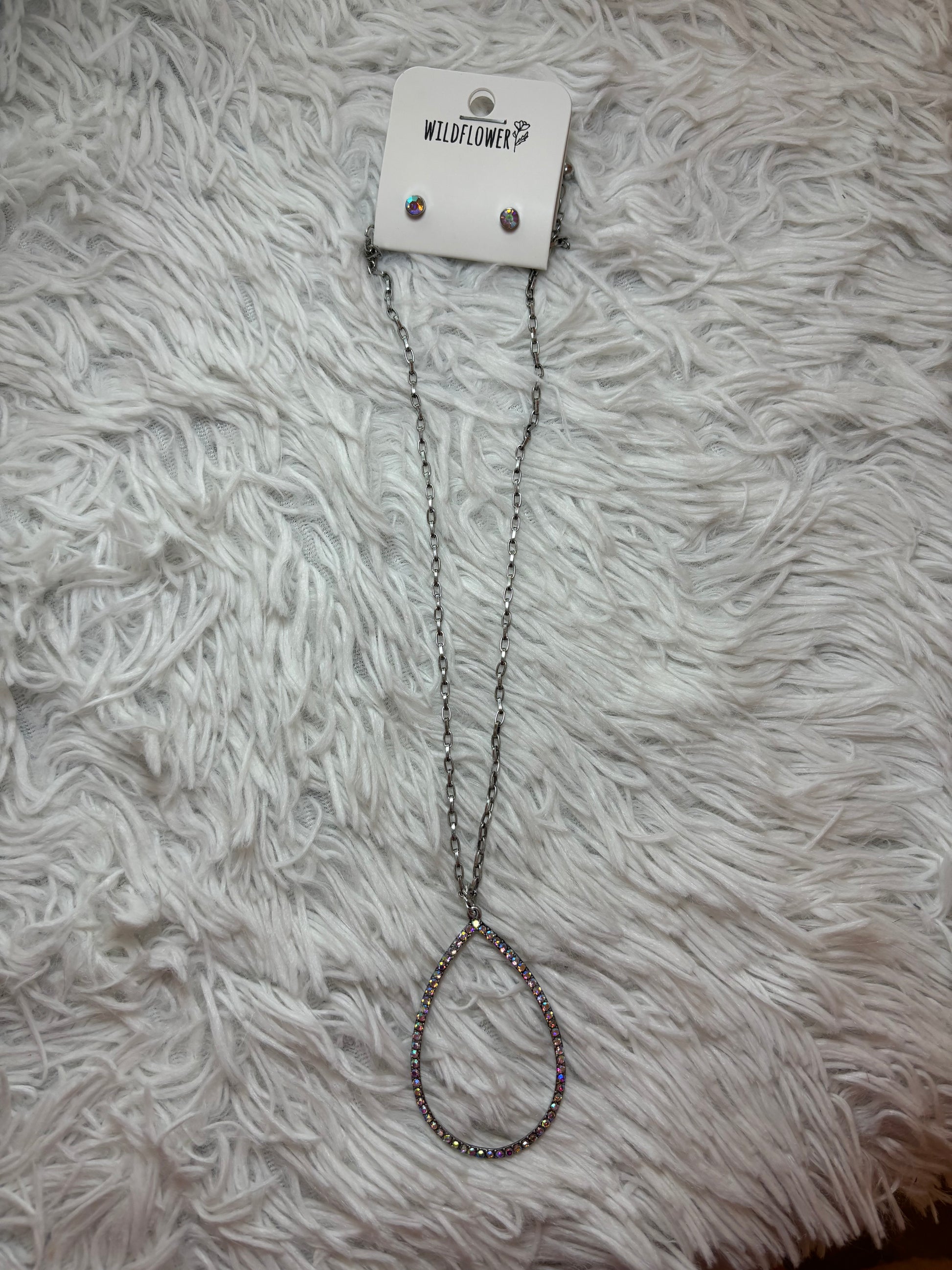 AB stone teardrop pendant on silver necklace with matching AB stone stud earrings.