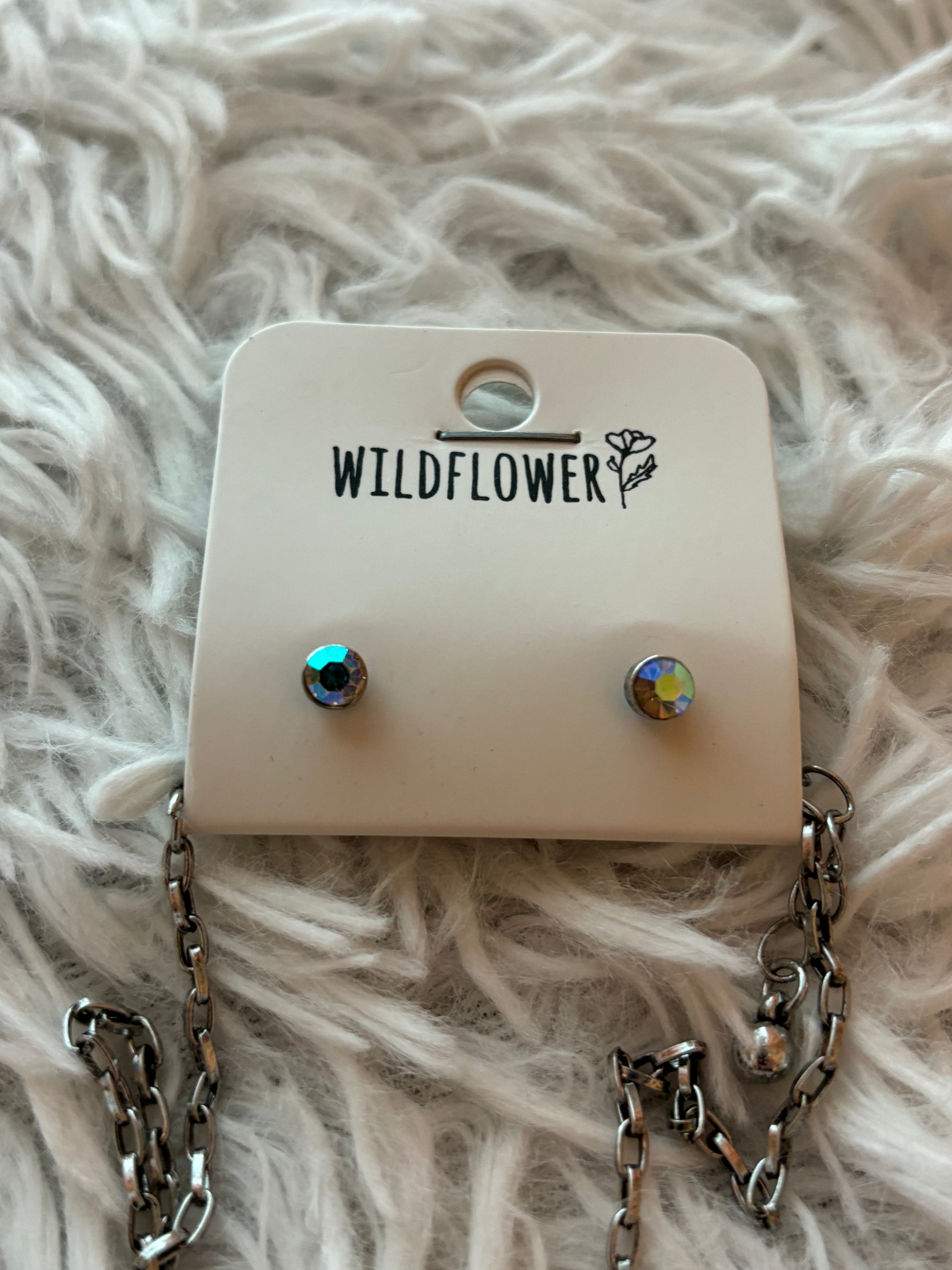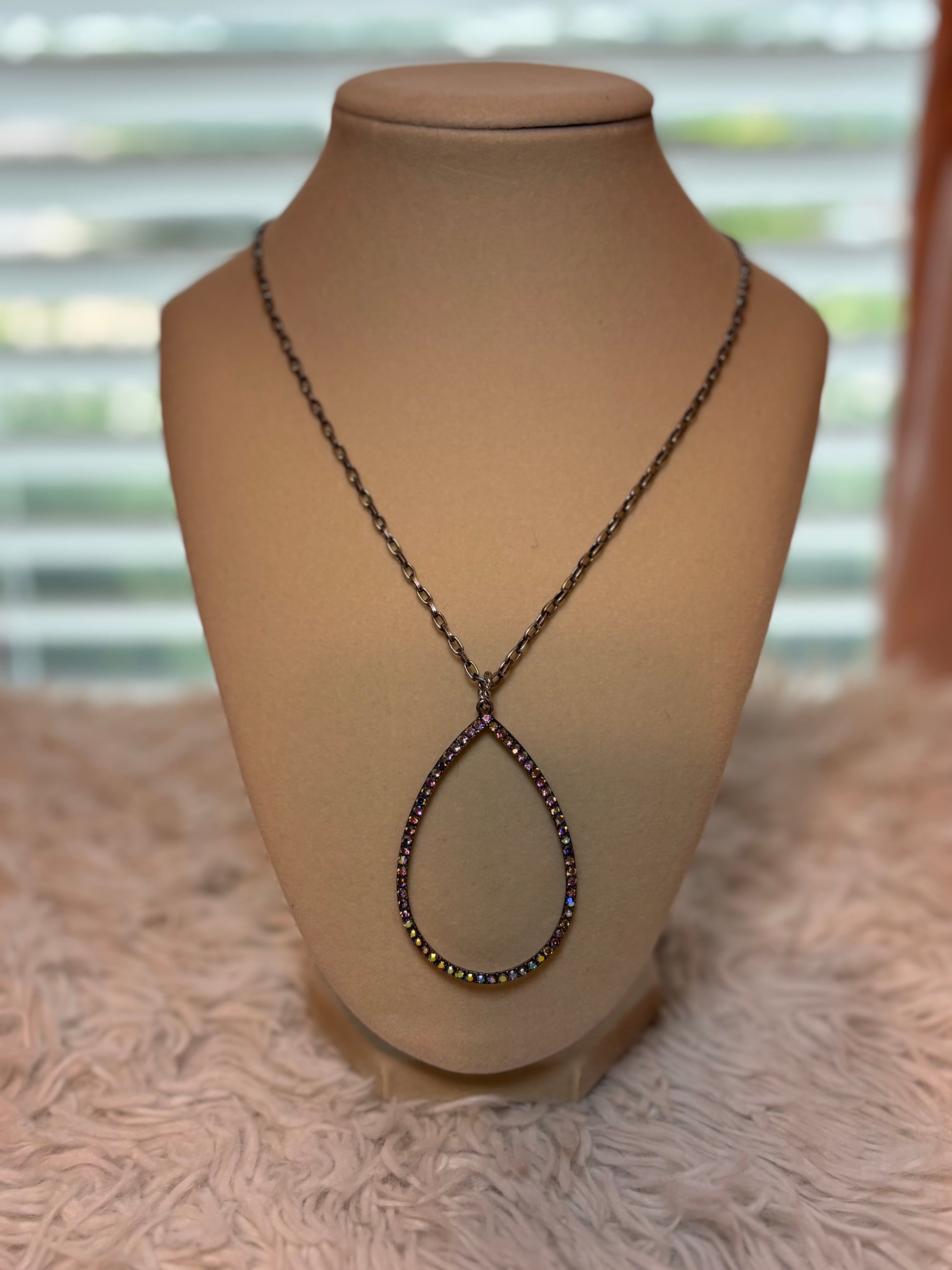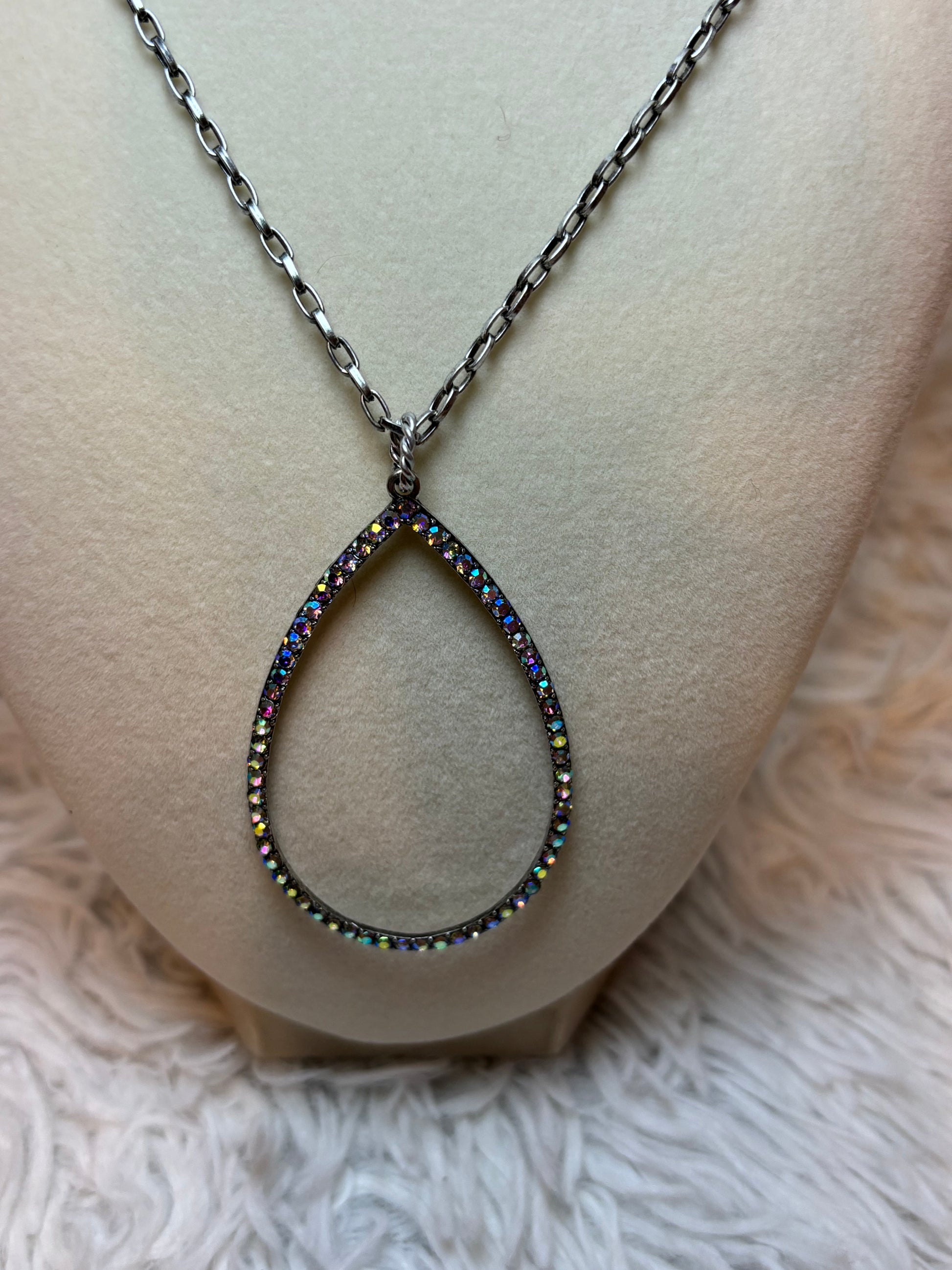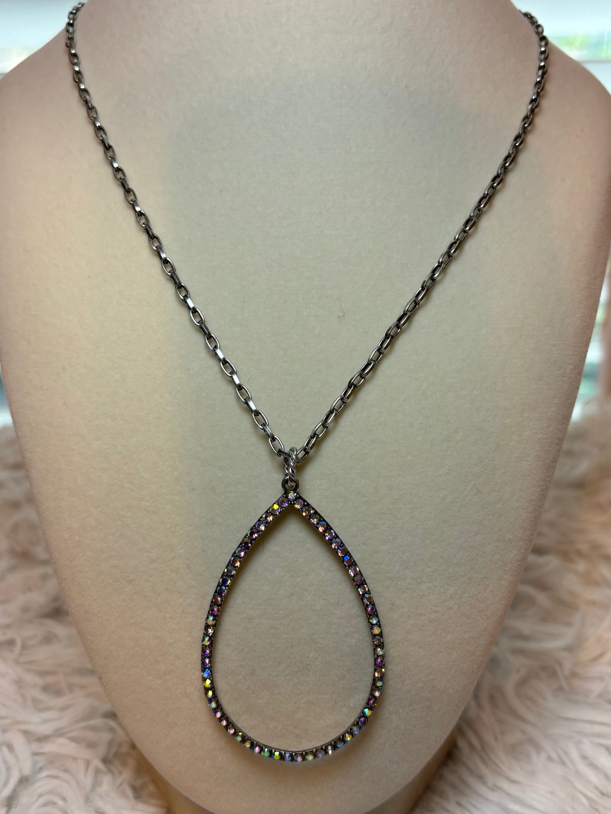 AB stone teardrop pendant on silver necklace with matching AB stone stud earrings.