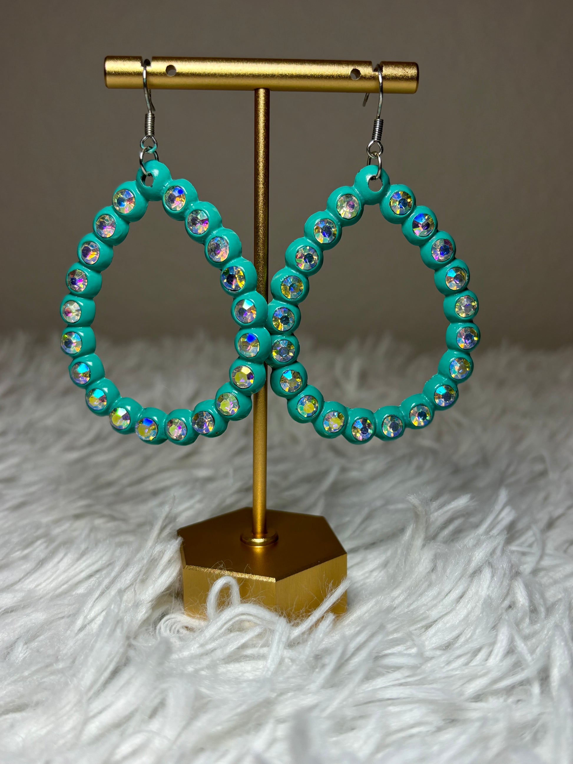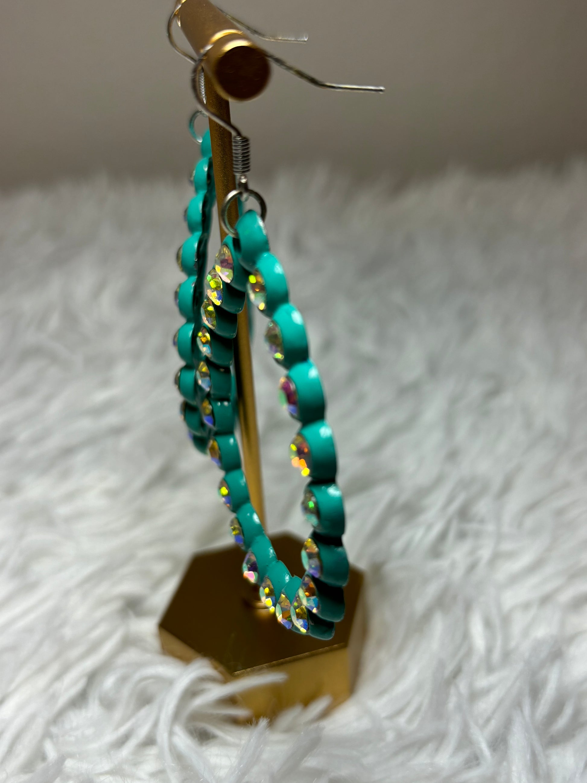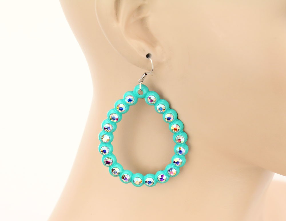 These Tear Drop Fish Hook Earrings feature a striking burnished turquoise metal plate adorned with shimmering AB rhinestones, combining bold design with vibrant color. Measuring 2.75 inches in length and nearly 2 inches in width, they make a statement while remaining lightweight and comfortable. Crafted from lead-free materials, these earrings offer a safe and stylish accessory choice for discerning wearers.